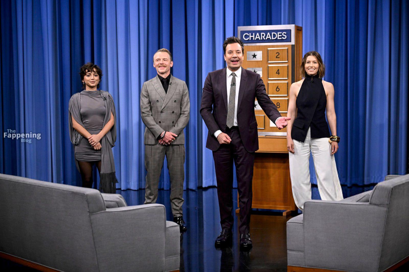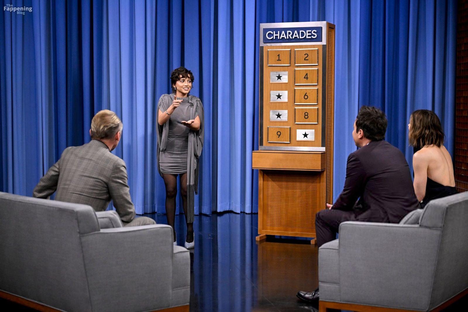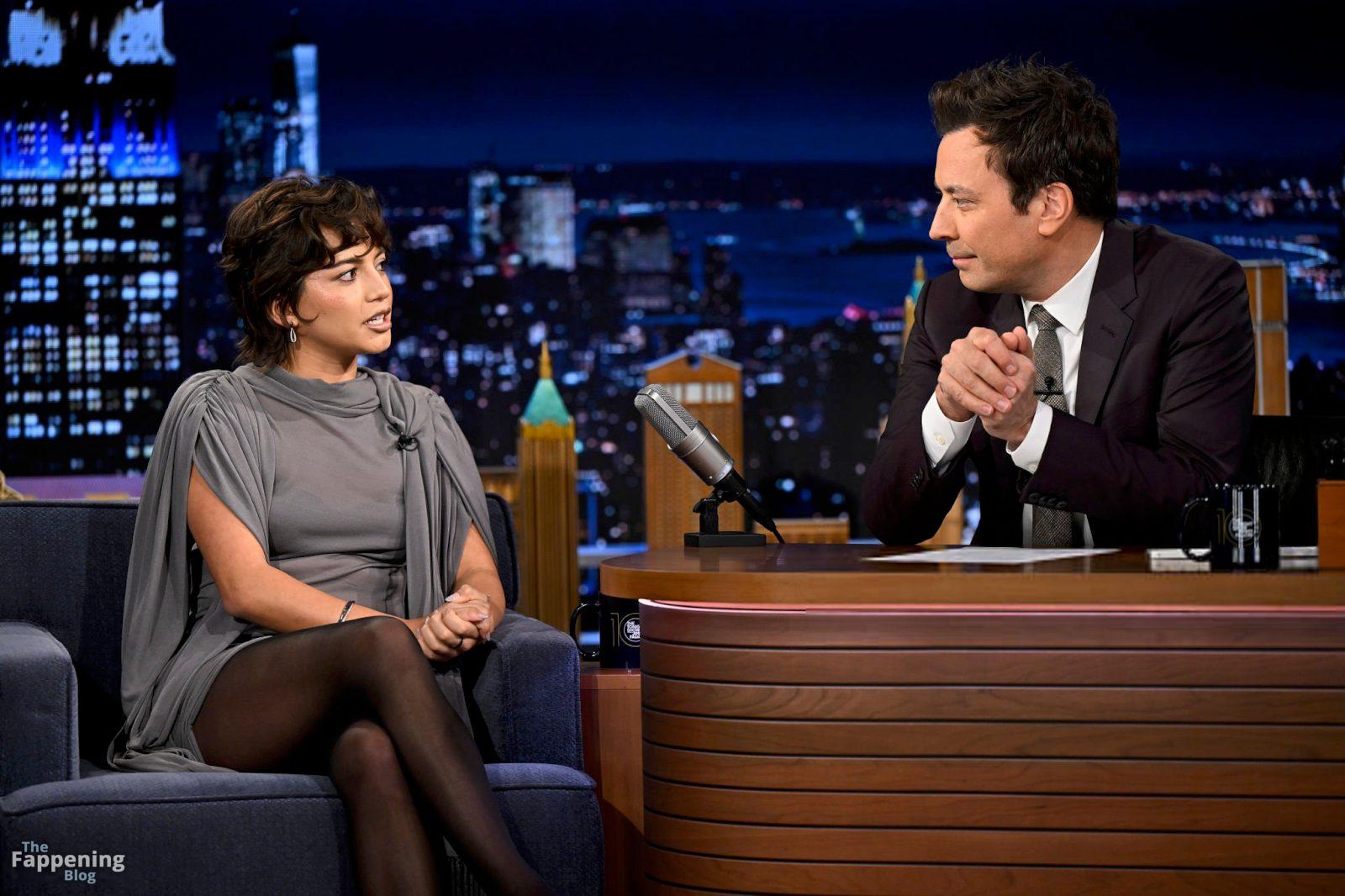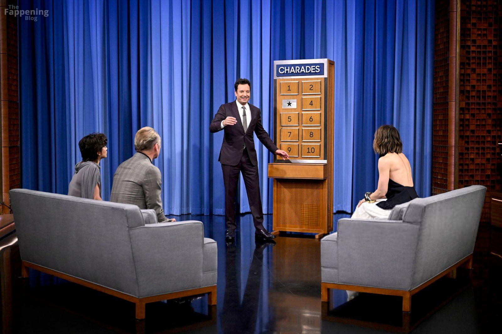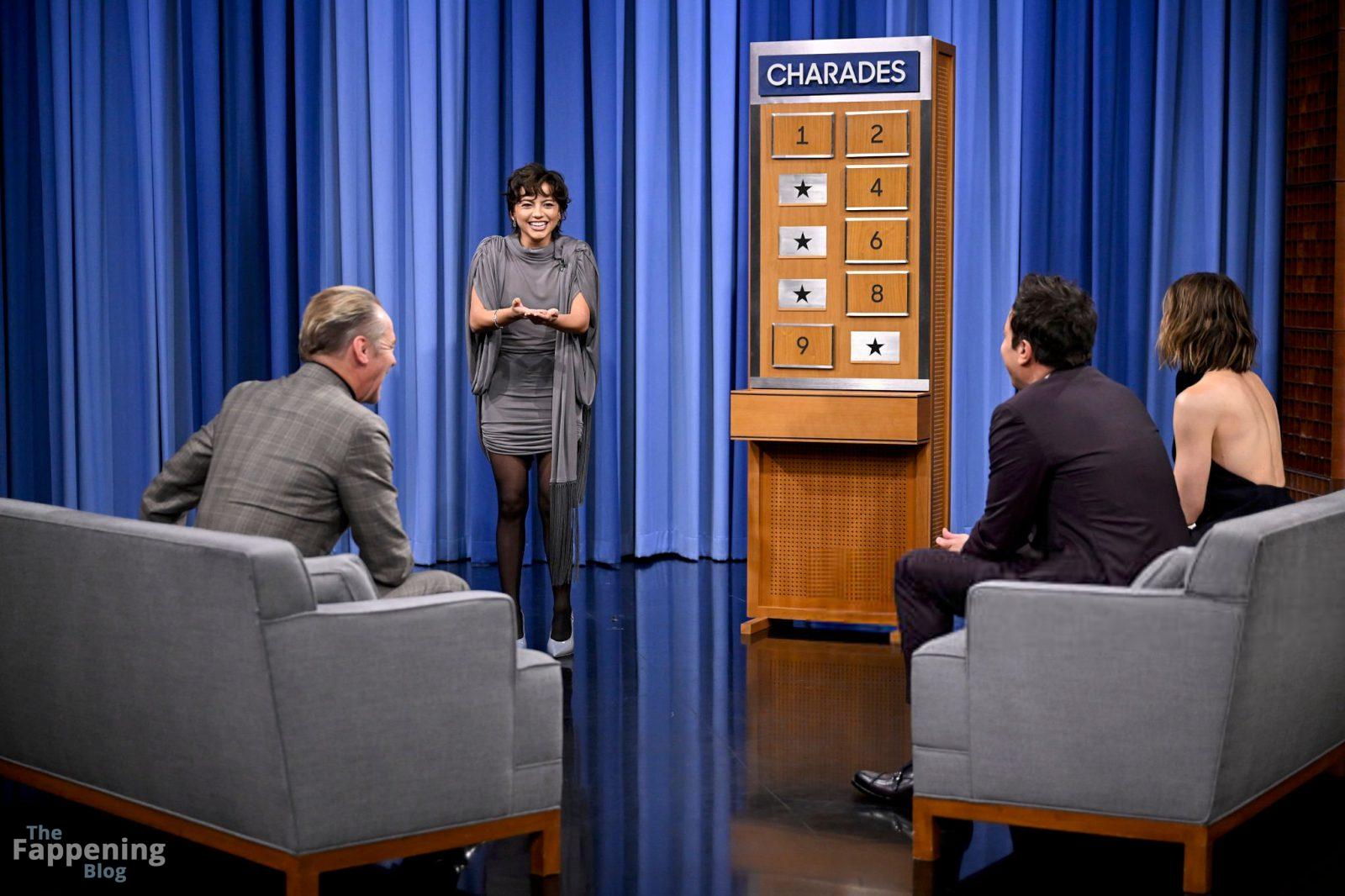 L’actrice Isabela Merced met en valeur ses jambes dans des bas transparents et une mini-robe transparente lors du Tonight Show avec Jimmy Fallon.