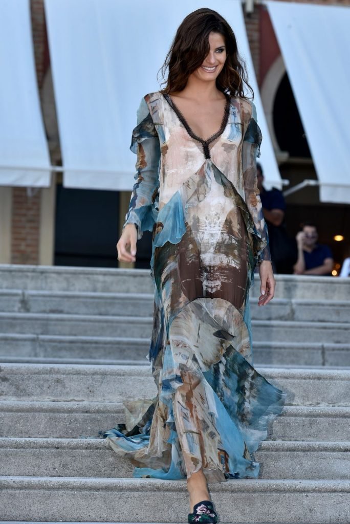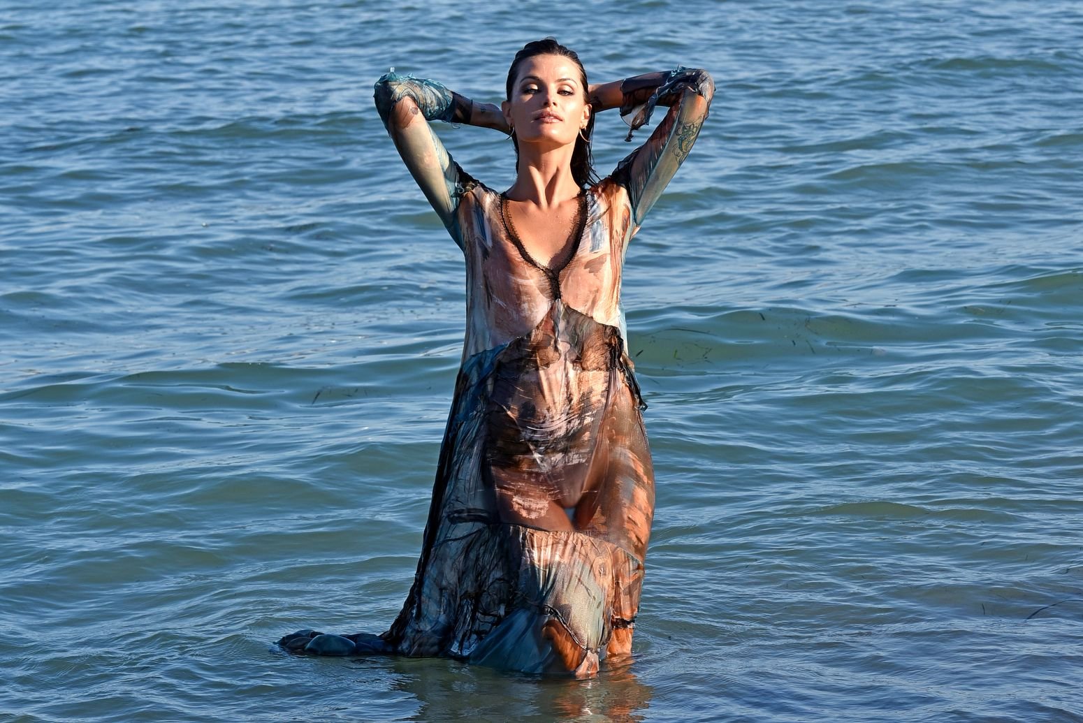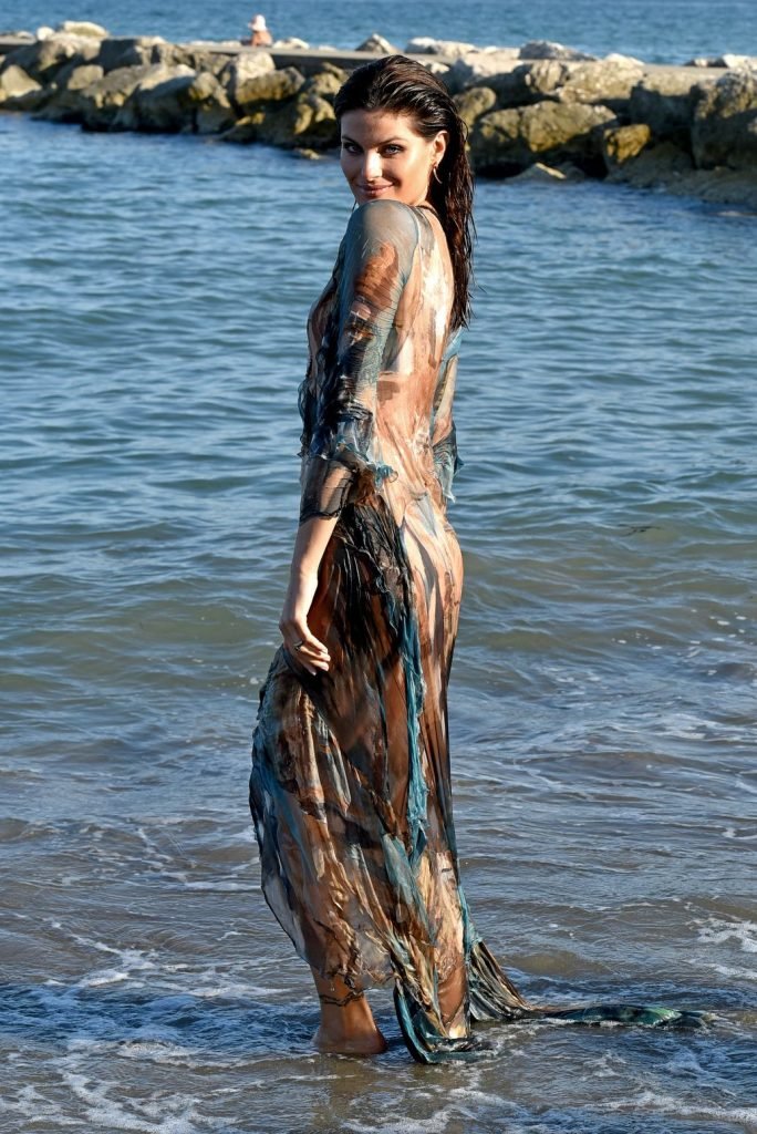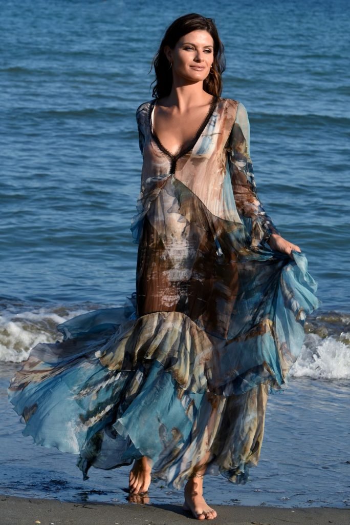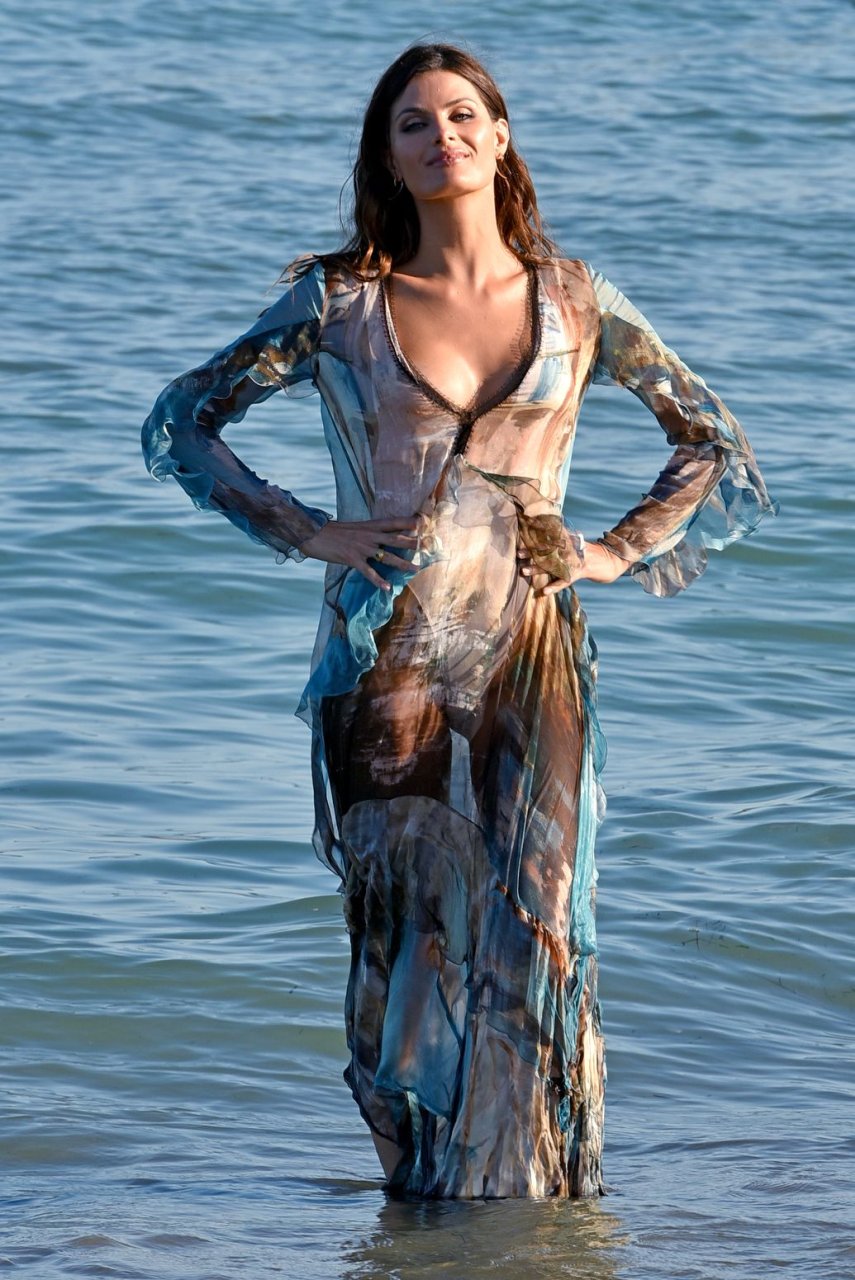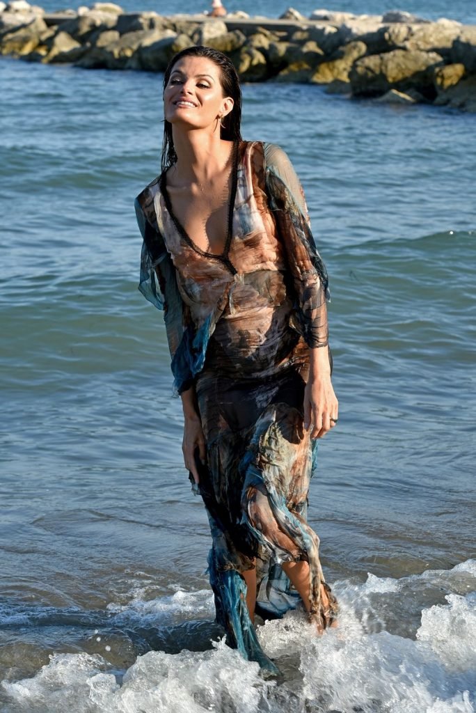 Le mannequin sans soutien-gorge Isabeli Fontana (34 ans) pose pour les photographes sur la plage de Venise, le 29/08/2017.