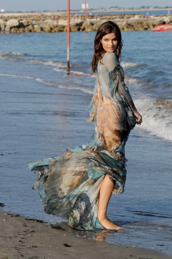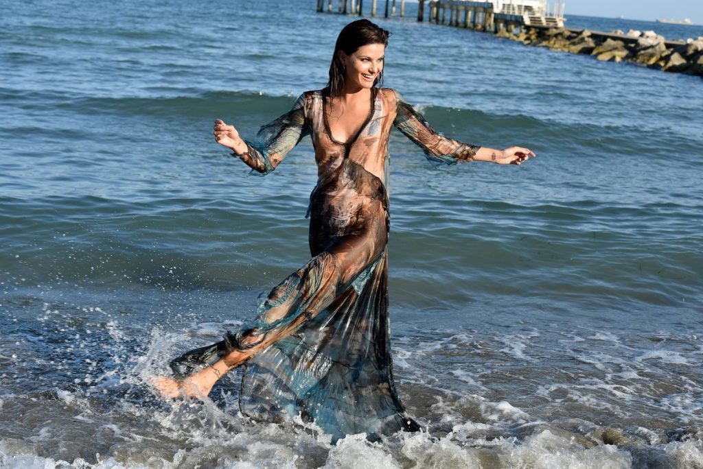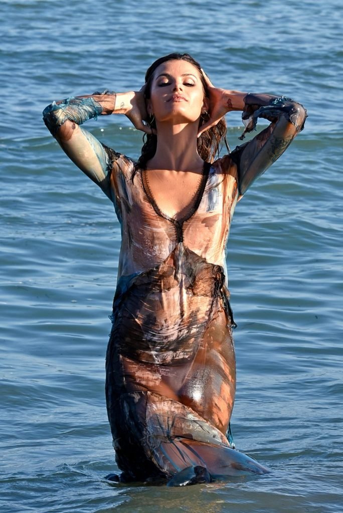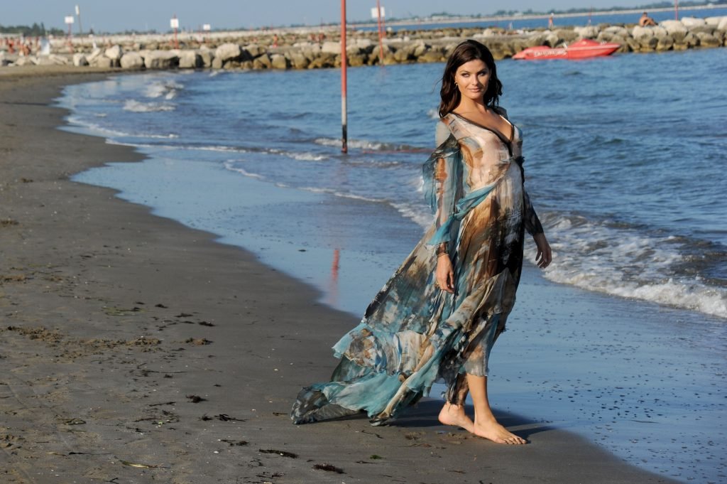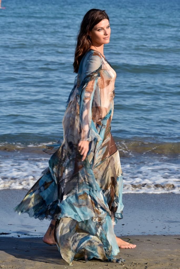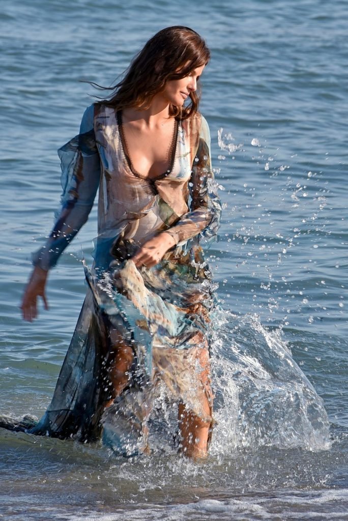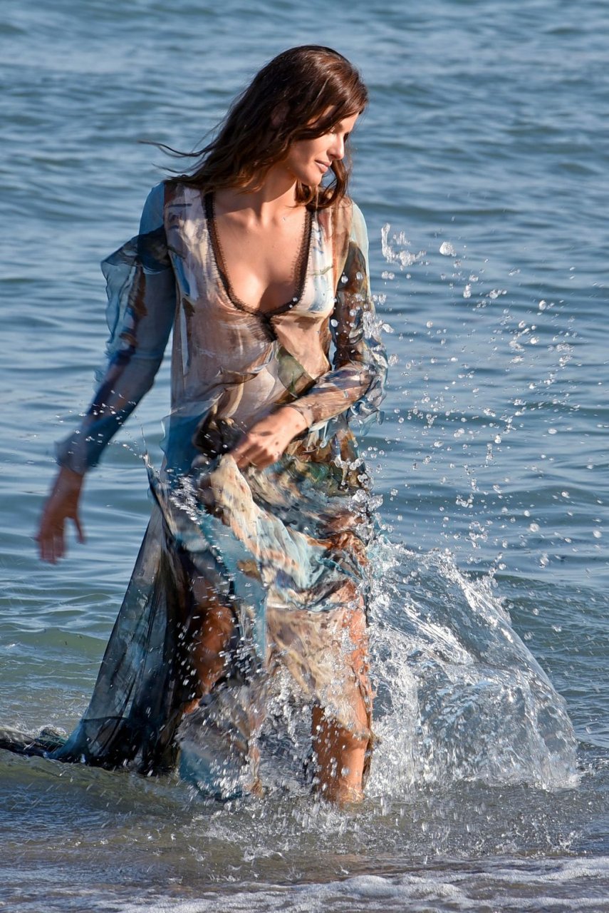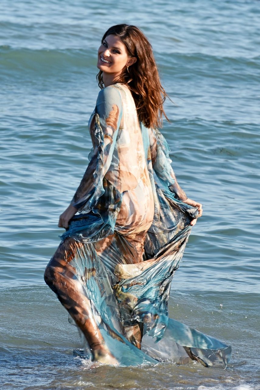 Le mannequin sans soutien-gorge Isabeli Fontana (34 ans) pose pour les photographes sur la plage de Venise, le 29/08/2017.