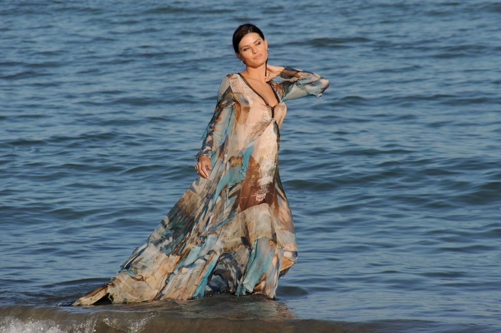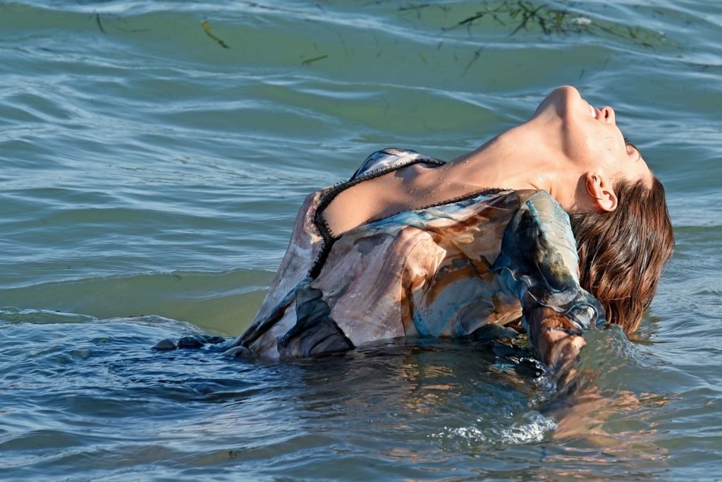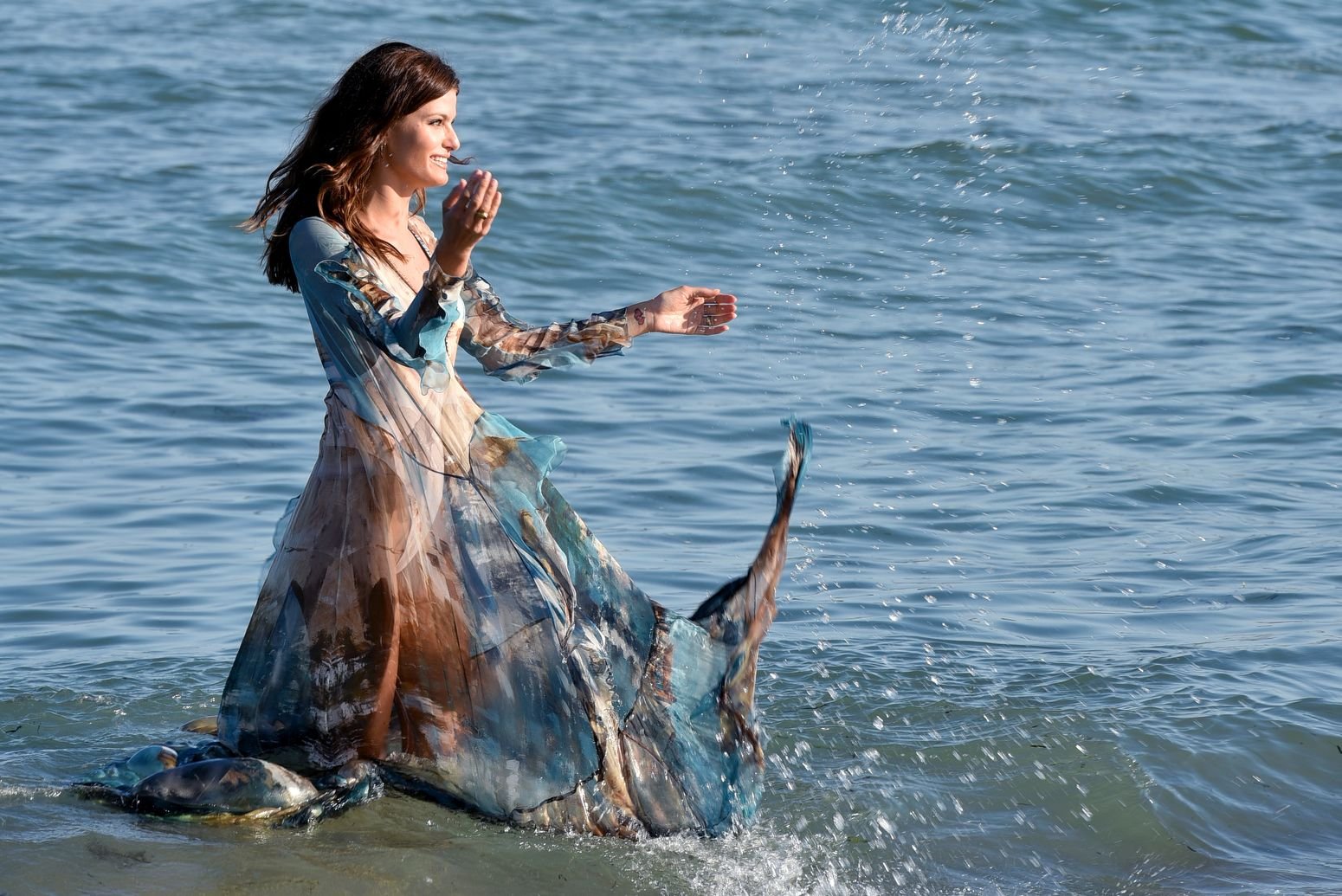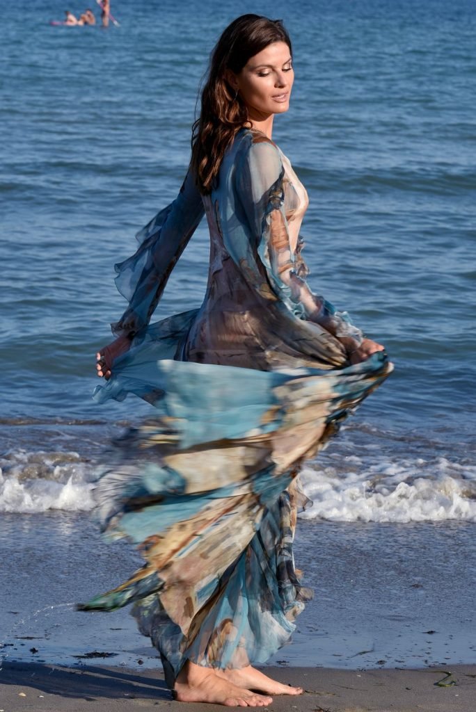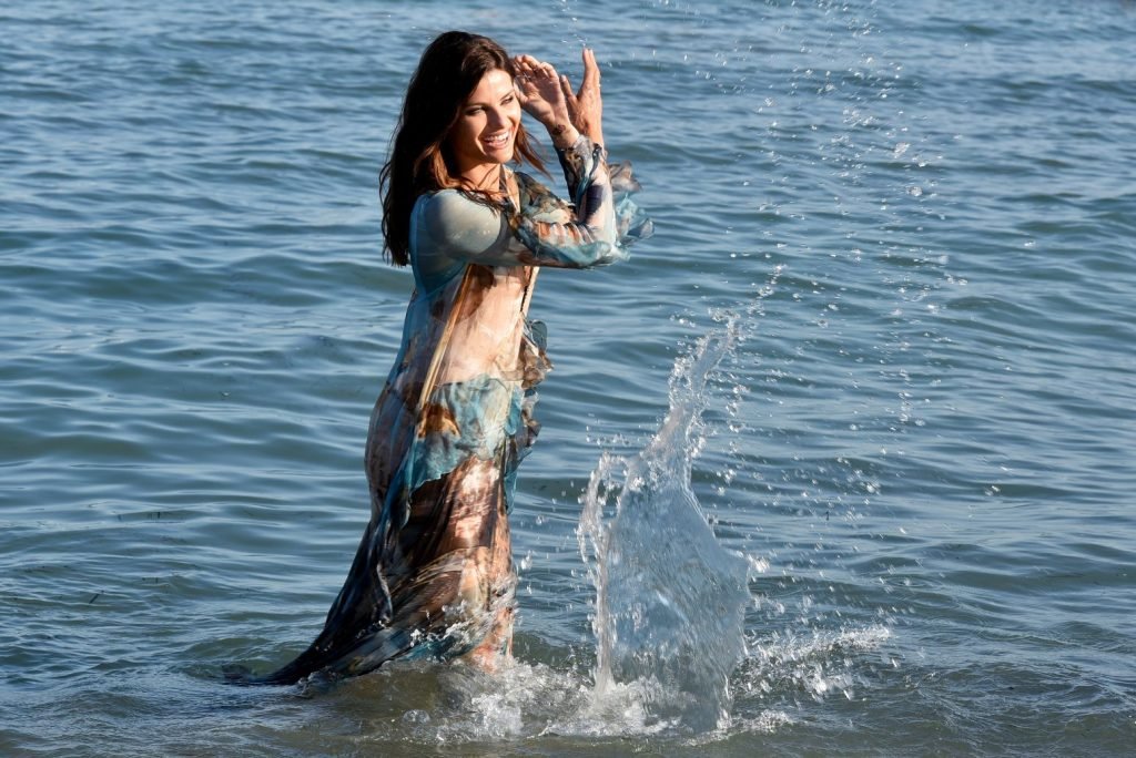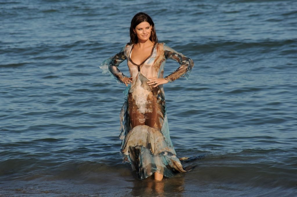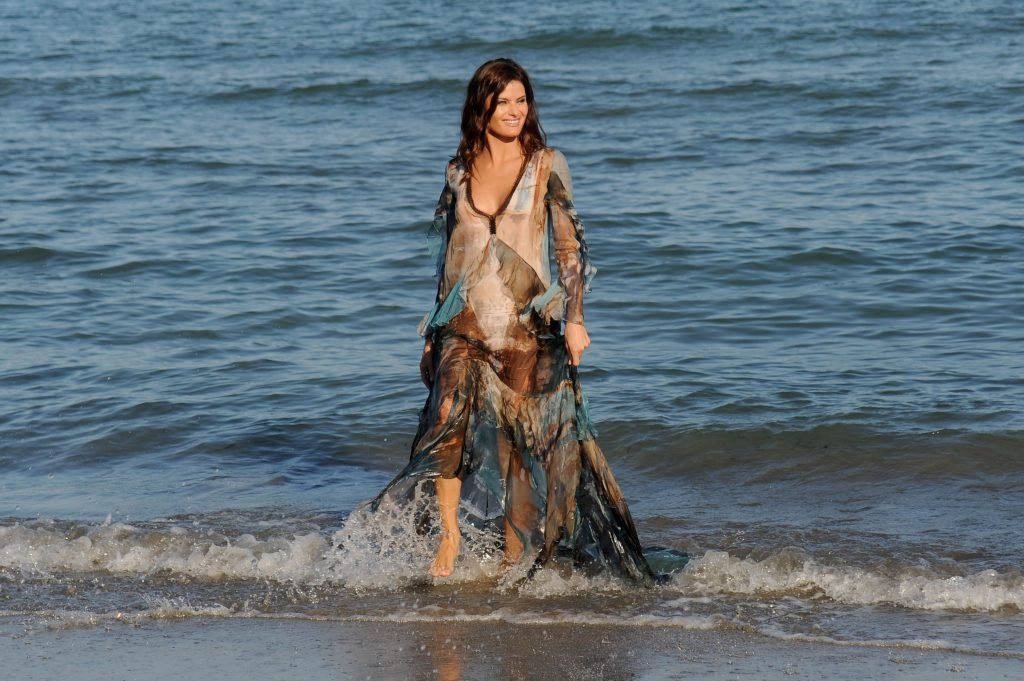 Le mannequin sans soutien-gorge Isabeli Fontana (34 ans) pose pour les photographes sur la plage de Venise, le 29/08/2017.