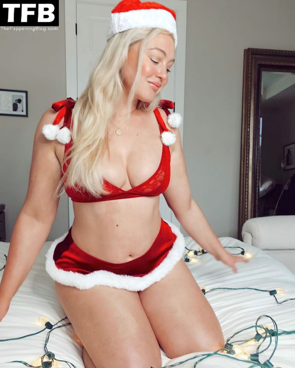 Le mannequin grande taille Iskra Lawrence pose en lingerie d’un nouveau ensemble Santa de la marque Mentionables, nous taquinant avec sa poitrine – Instagram (décembre 2021).