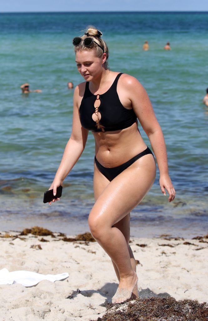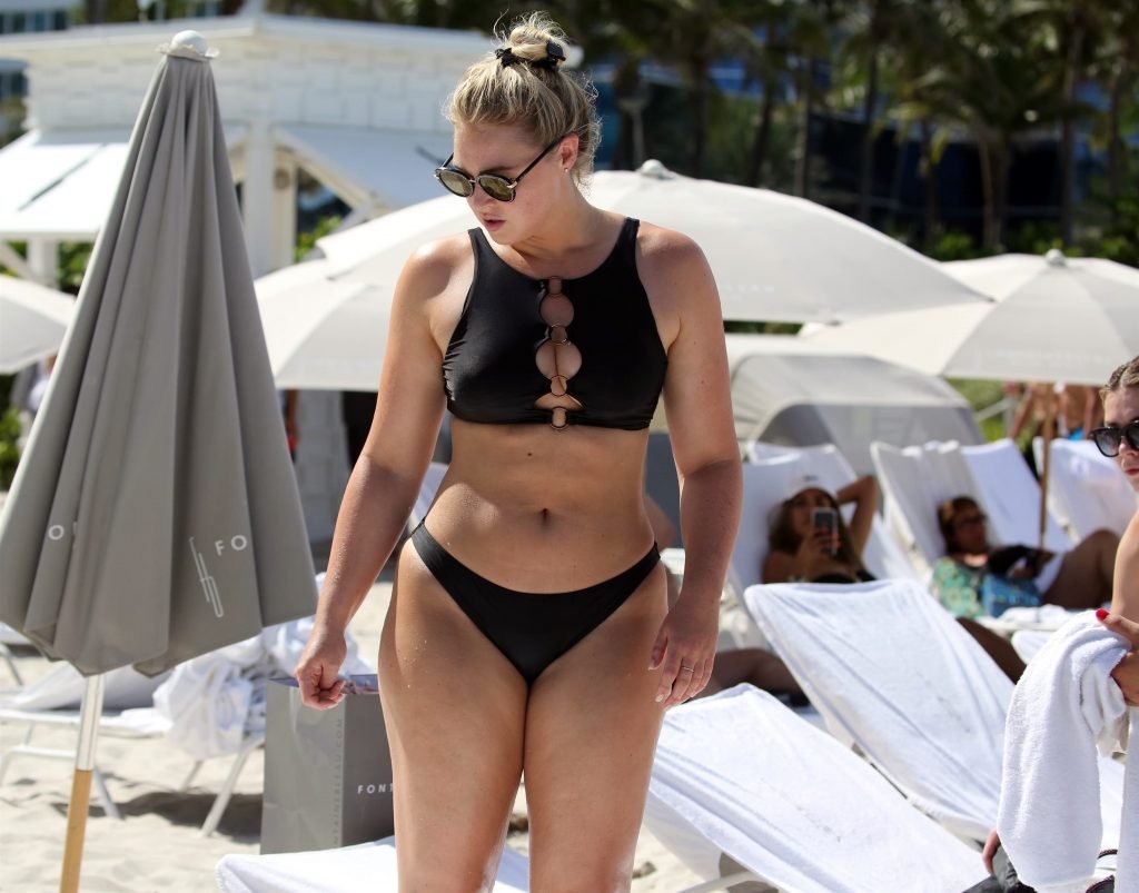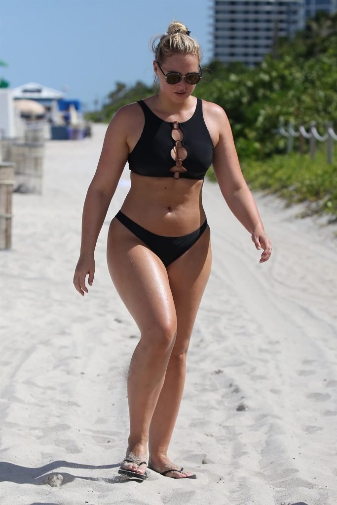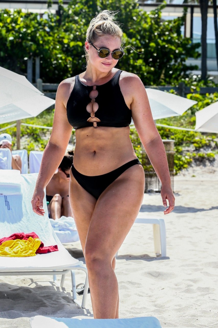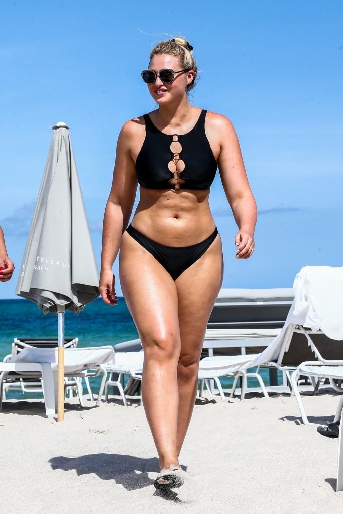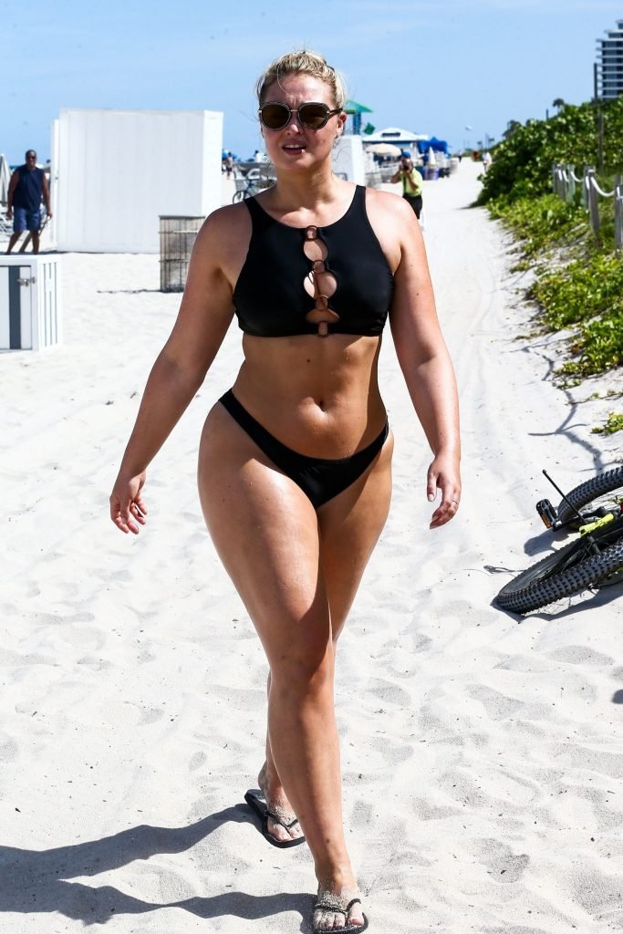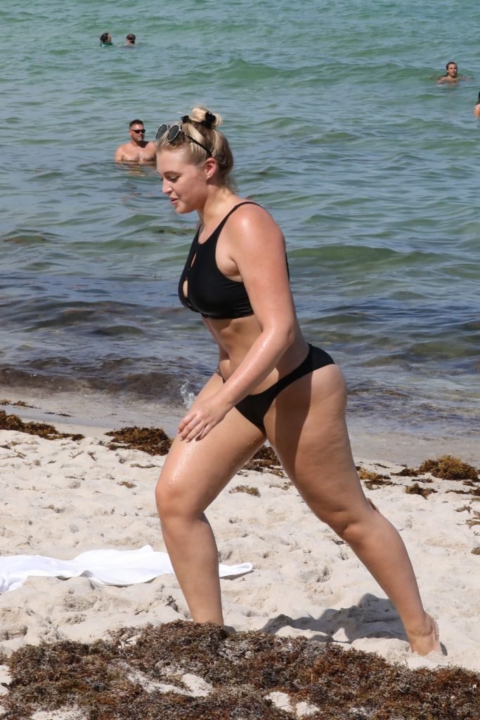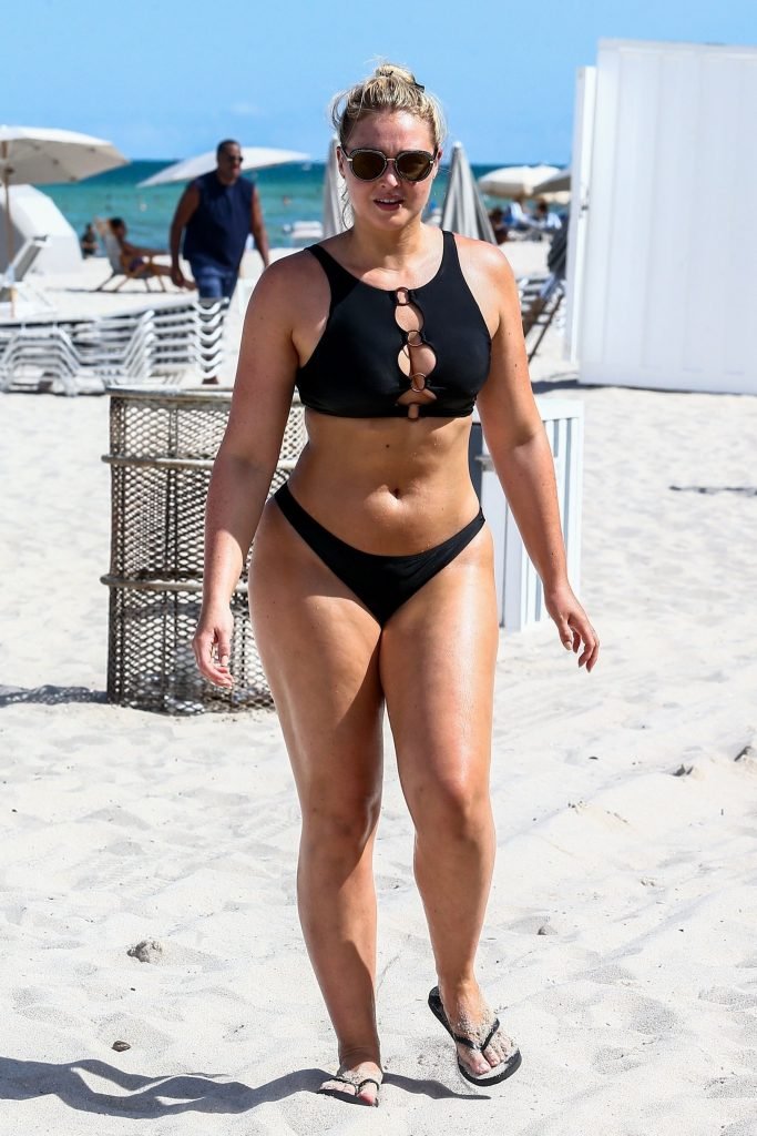 Le mannequin anglais Iskra Lawrence (27 ans) affiche sa silhouette voluptueuse dans un bikini noir minimaliste tout en profitant d’une journée ensoleillée sur la plage de Miami, 12/07/2018.