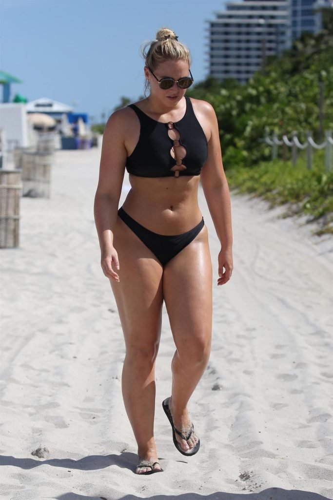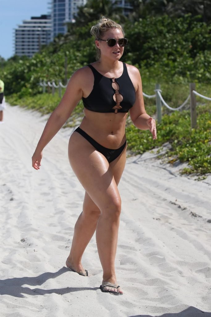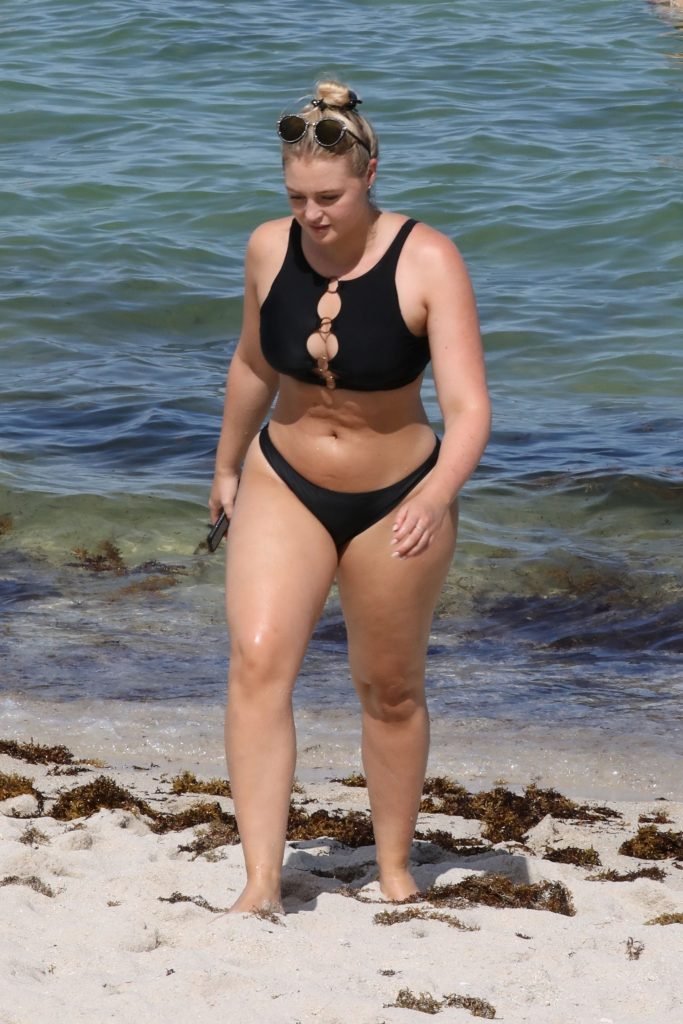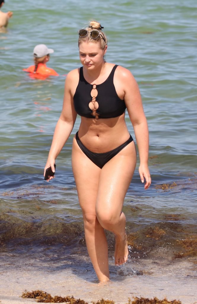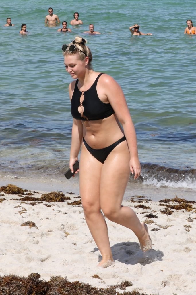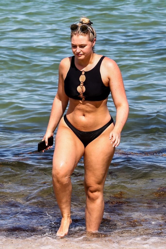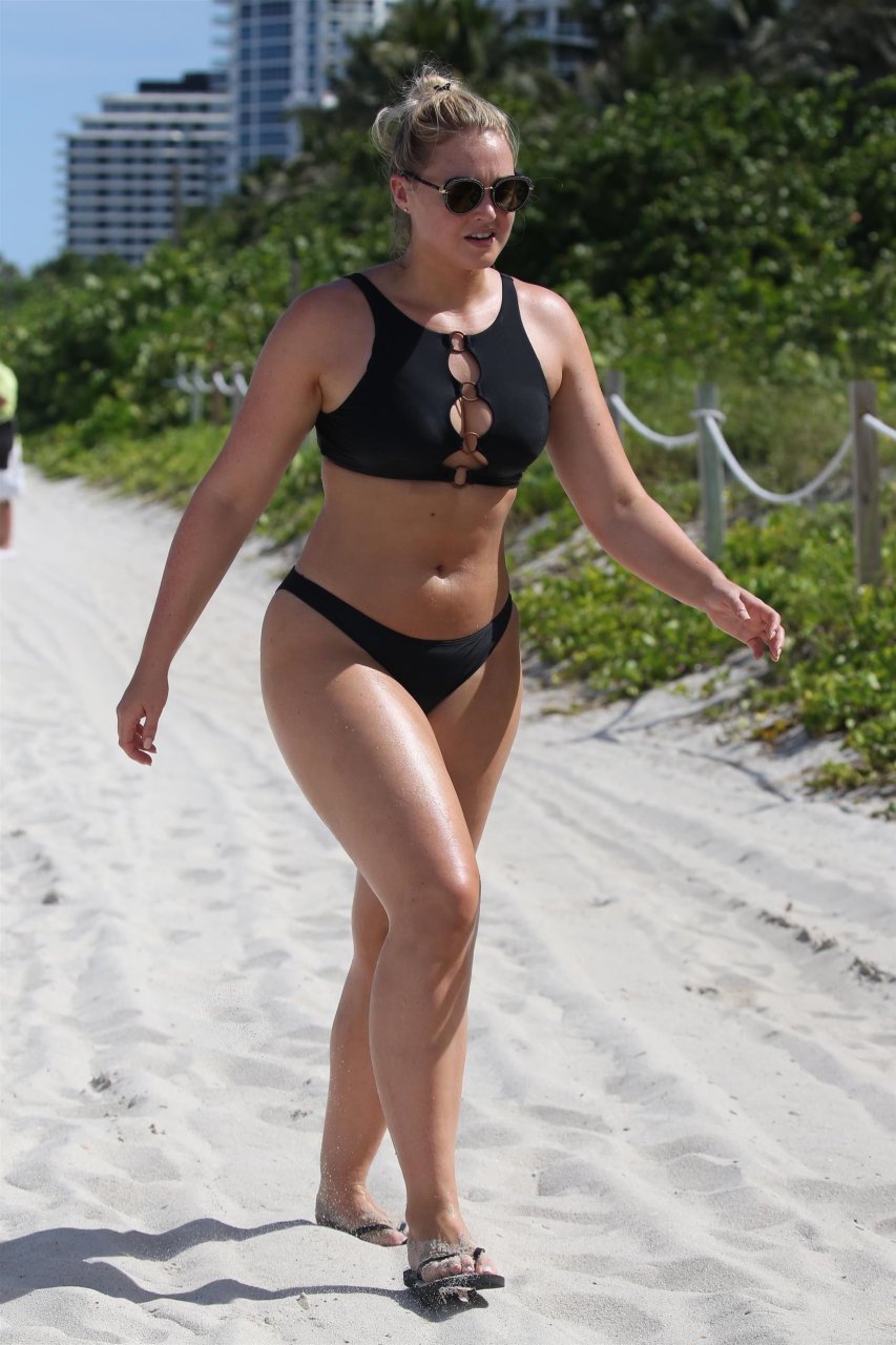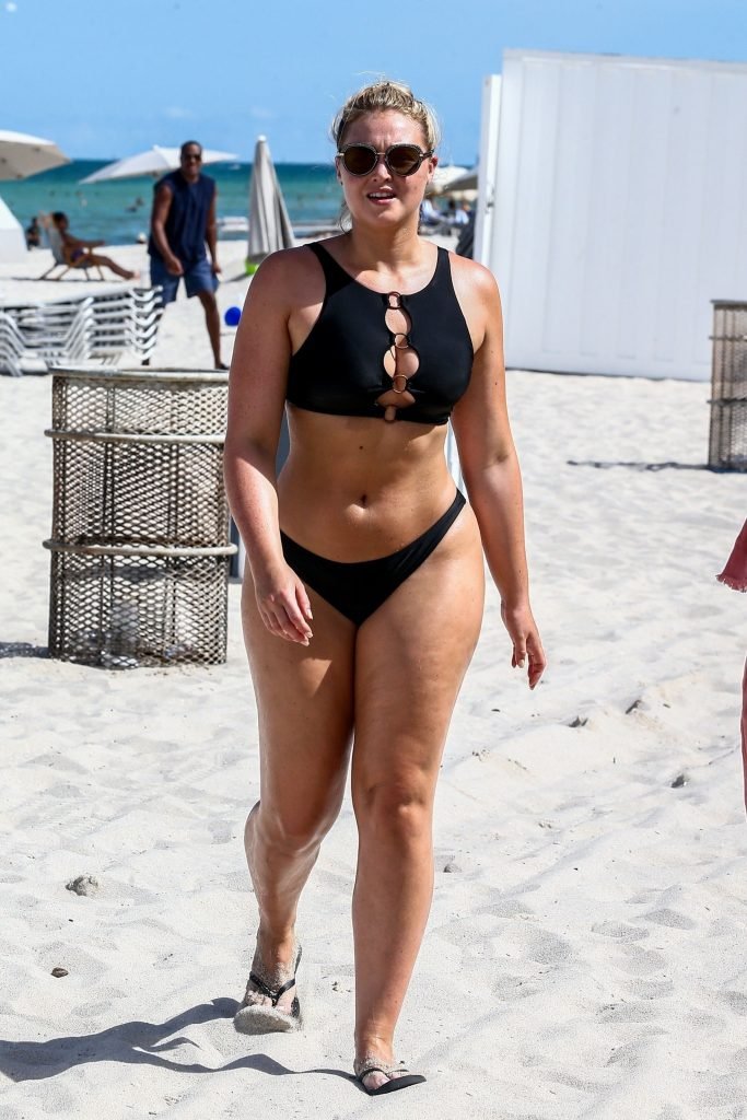 Le mannequin anglais Iskra Lawrence (27 ans) affiche sa silhouette voluptueuse dans un bikini noir minimaliste tout en profitant d’une journée ensoleillée sur la plage de Miami, 12/07/2018.