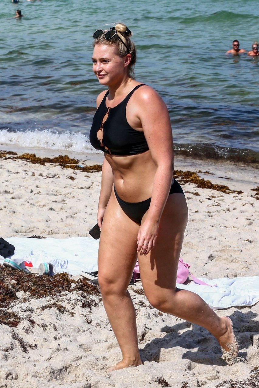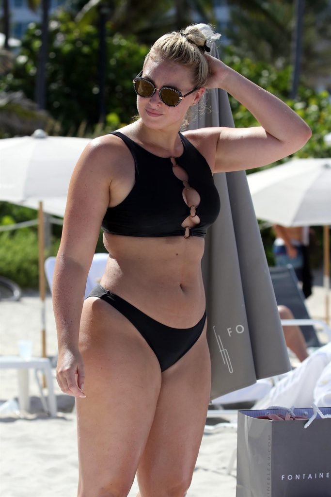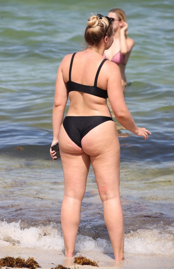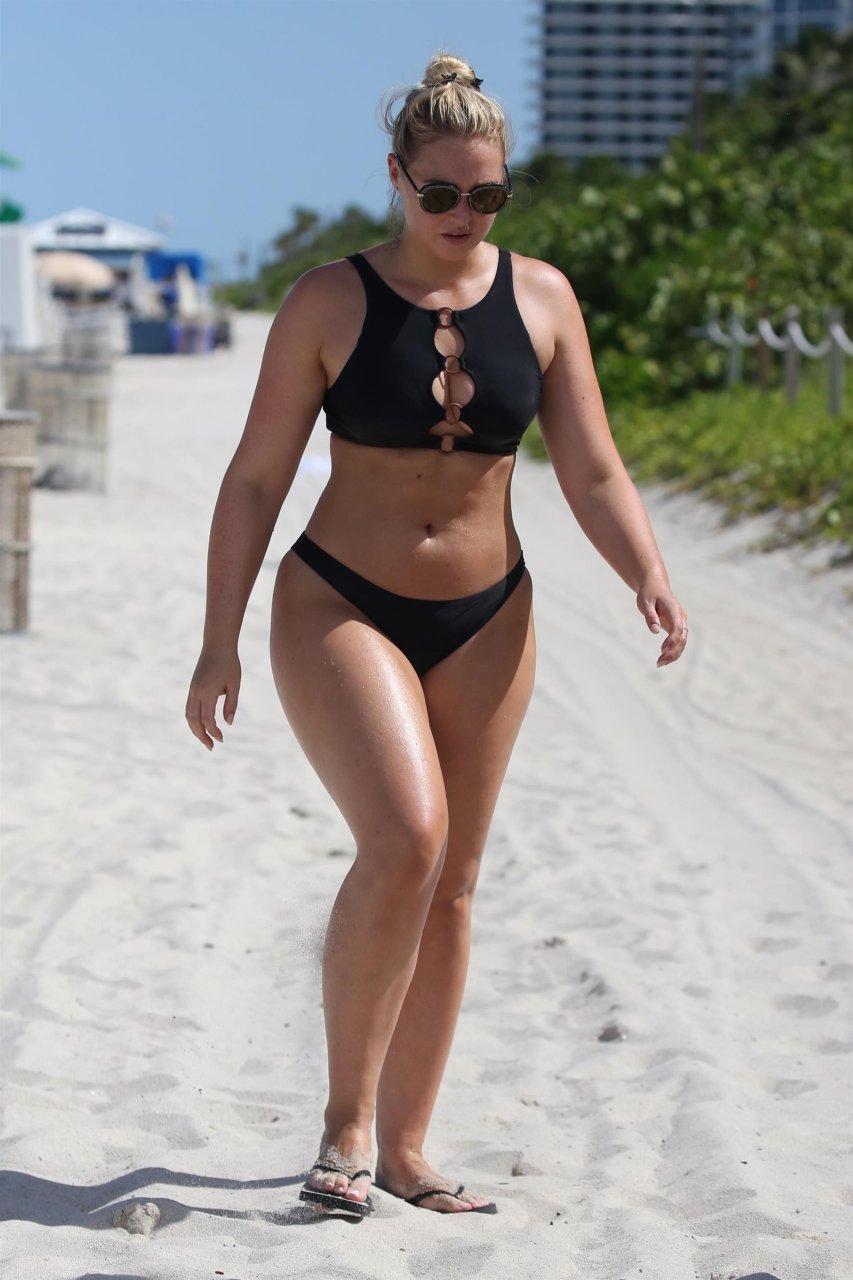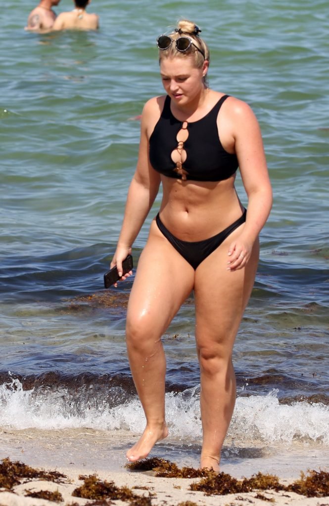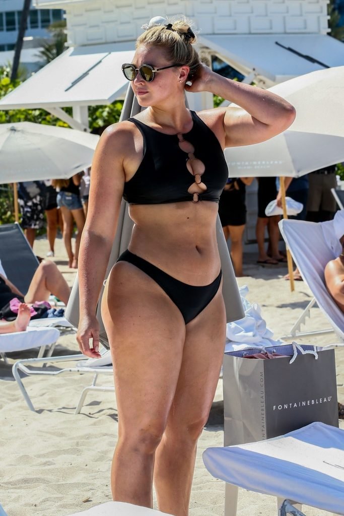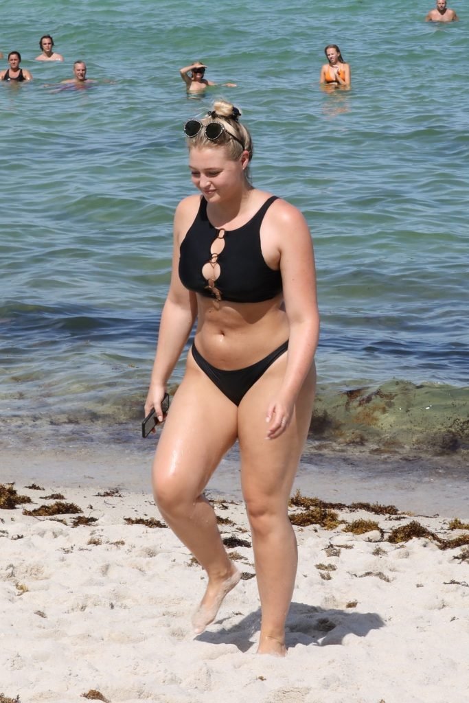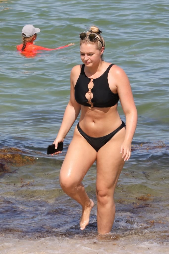 Le mannequin anglais Iskra Lawrence (27 ans) affiche sa silhouette voluptueuse dans un bikini noir minimaliste tout en profitant d’une journée ensoleillée sur la plage de Miami, 12/07/2018.