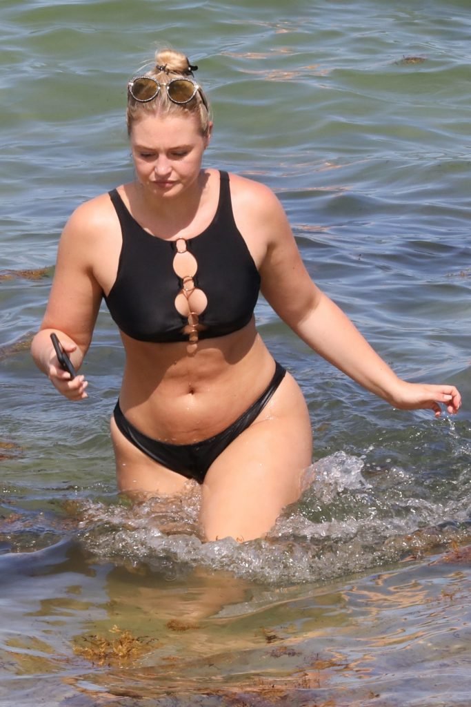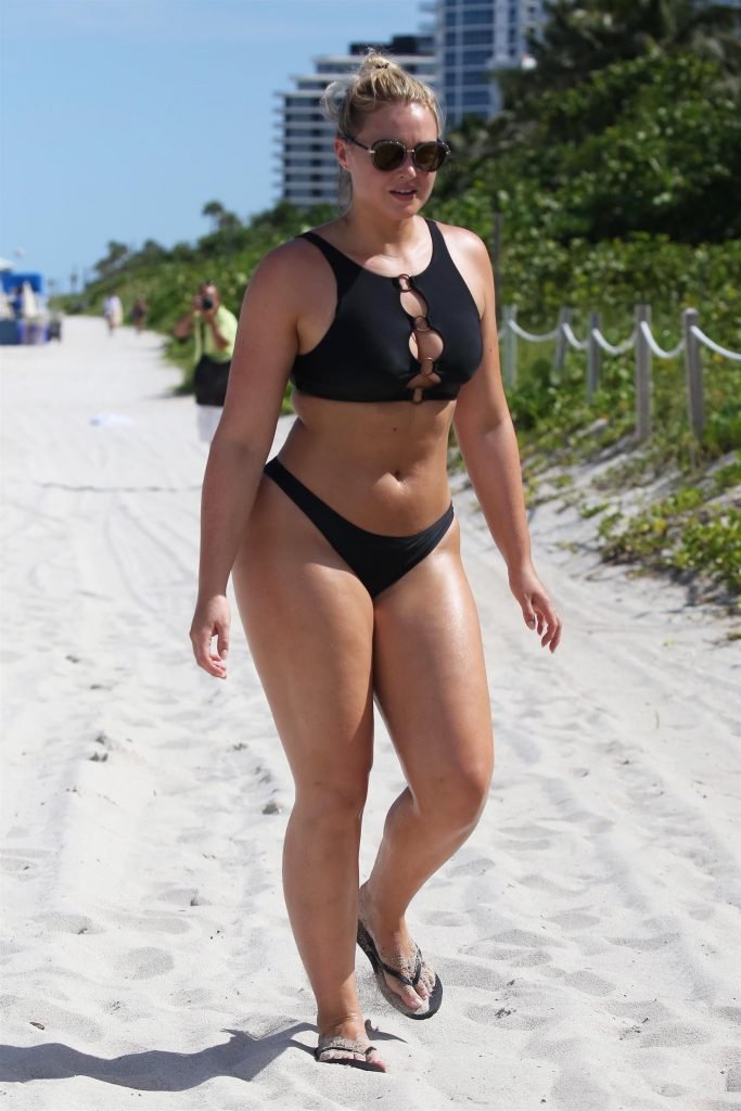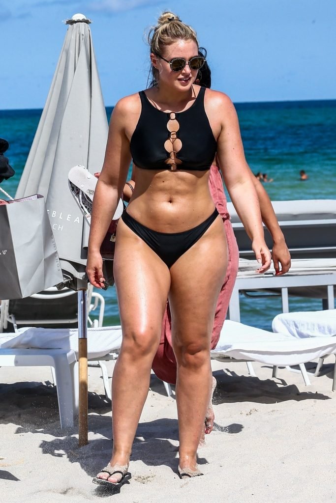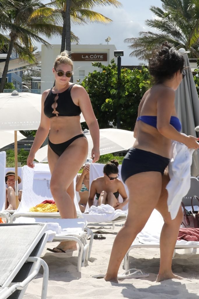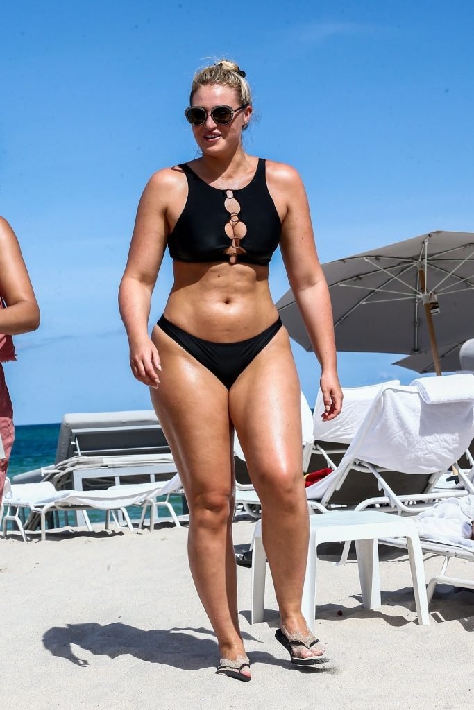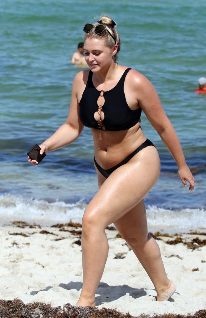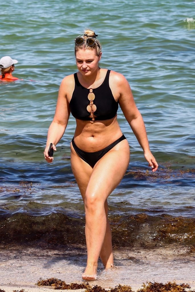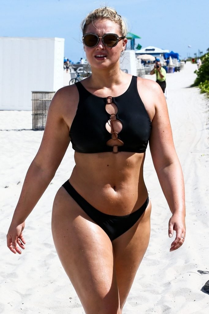 Le mannequin anglais Iskra Lawrence (27 ans) affiche sa silhouette voluptueuse dans un bikini noir minimaliste tout en profitant d’une journée ensoleillée sur la plage de Miami, 12/07/2018.