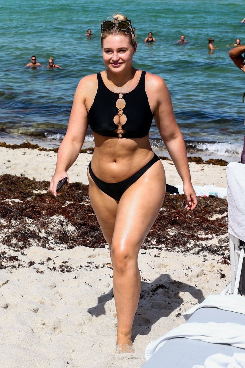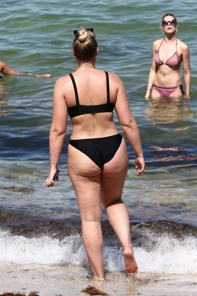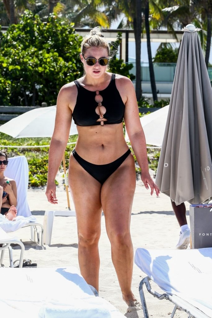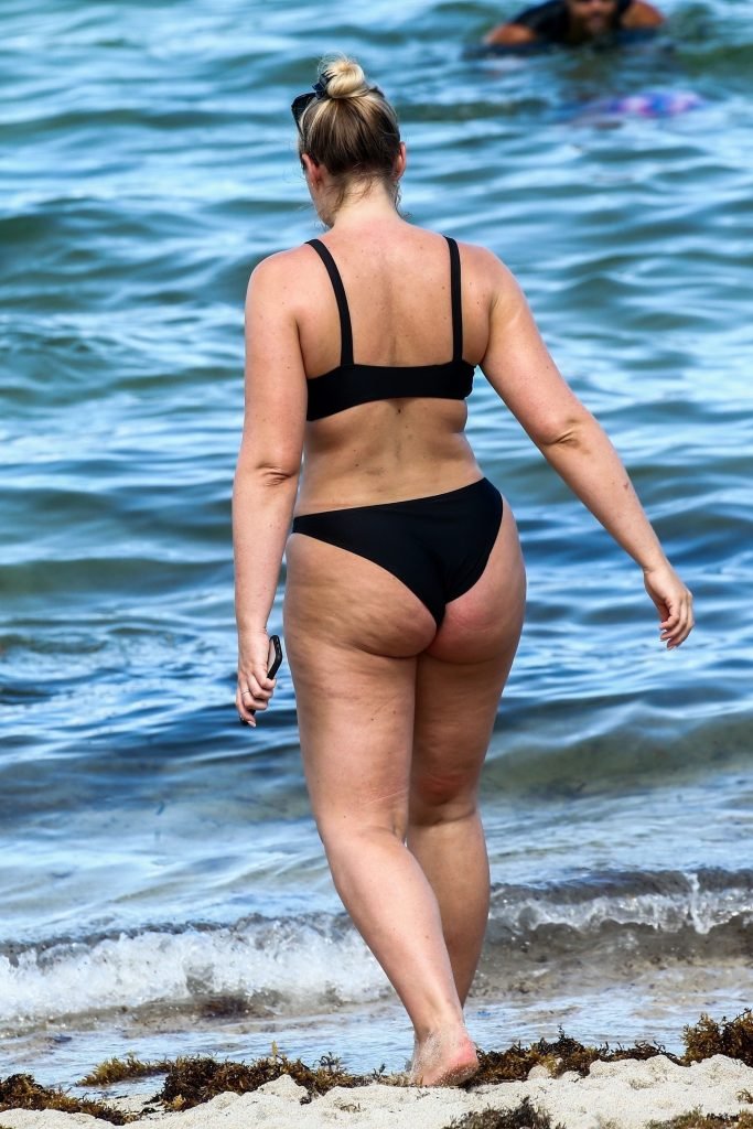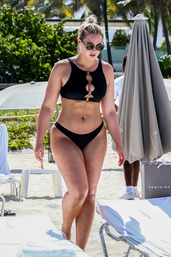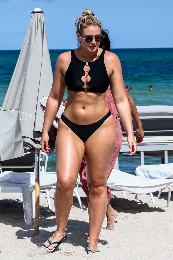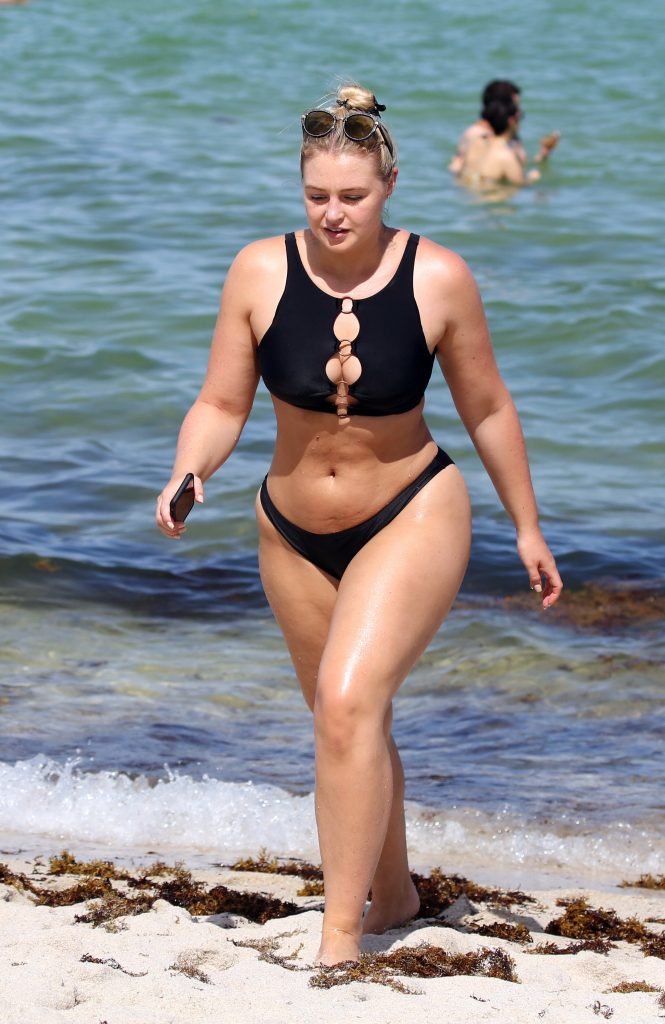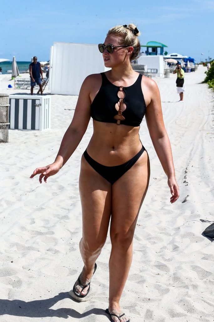 Le mannequin anglais Iskra Lawrence (27 ans) affiche sa silhouette voluptueuse dans un bikini noir minimaliste tout en profitant d’une journée ensoleillée sur la plage de Miami, 12/07/2018.