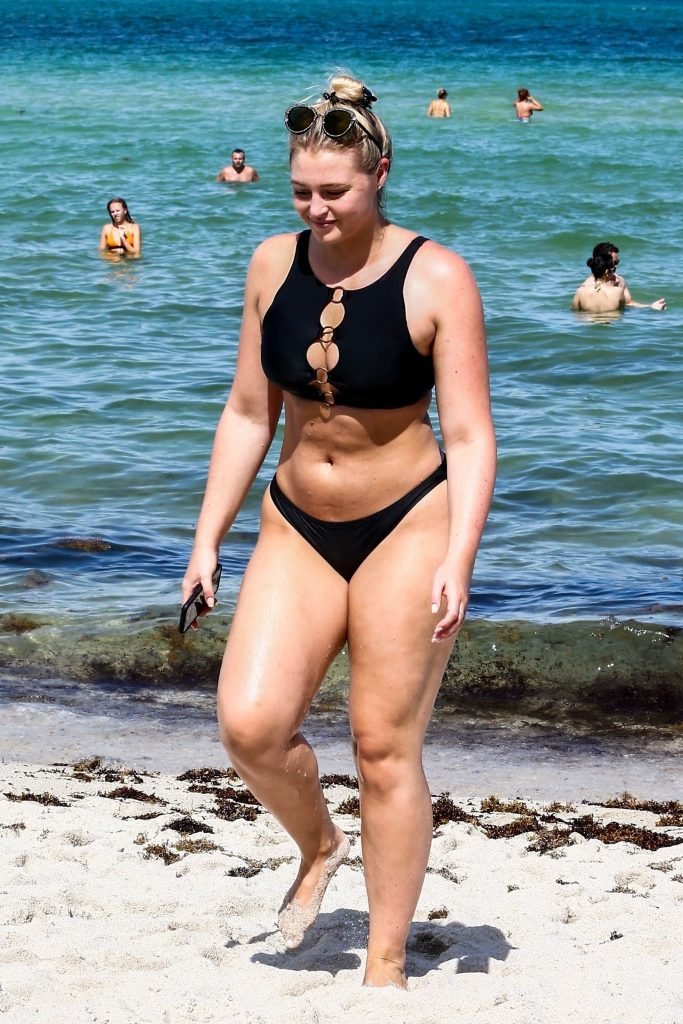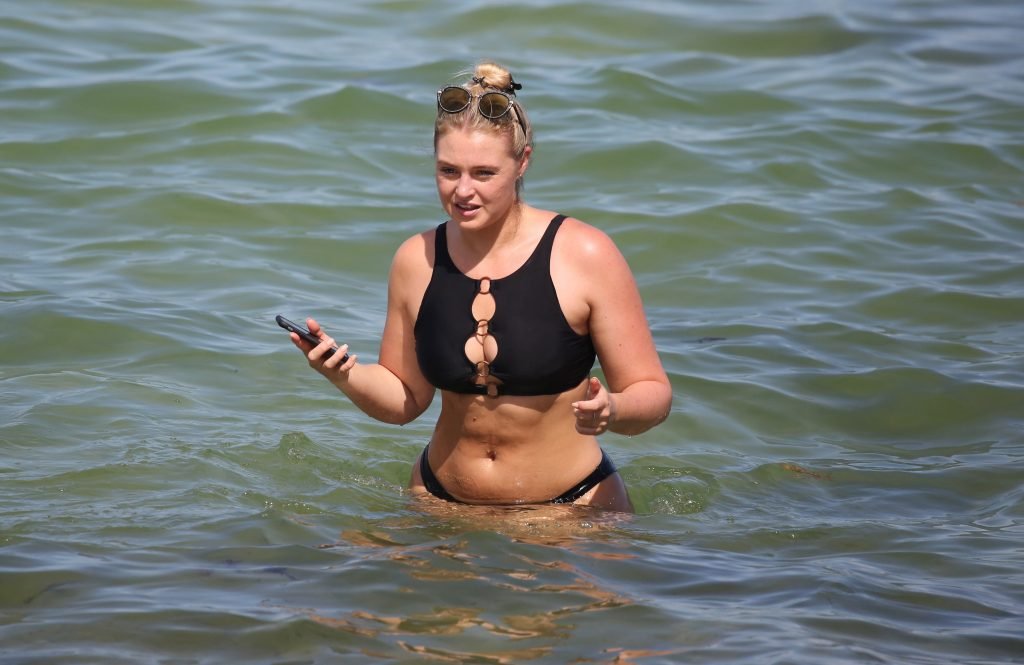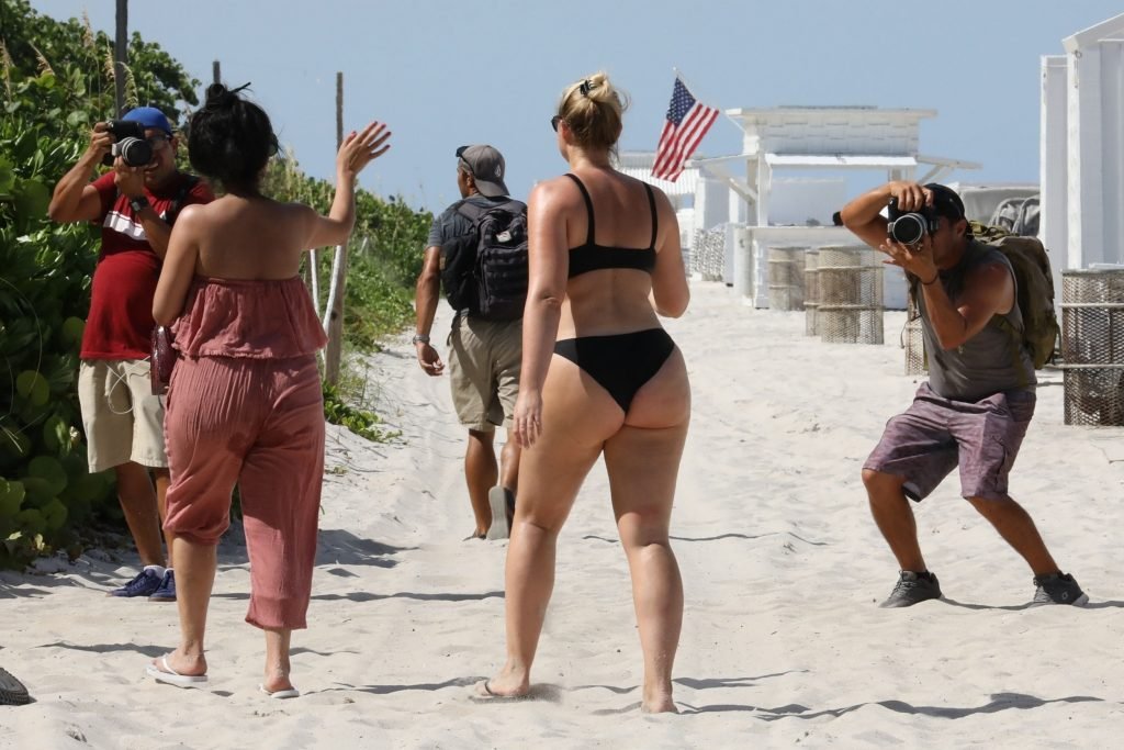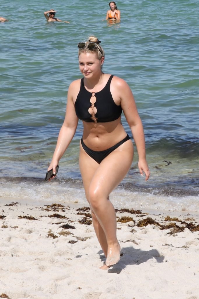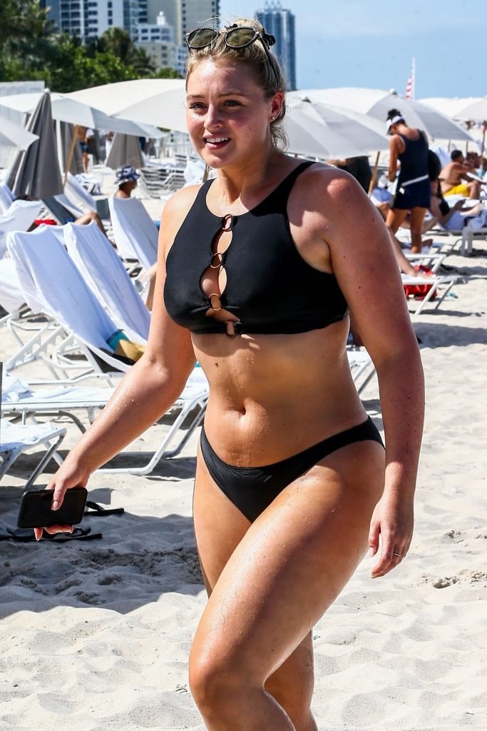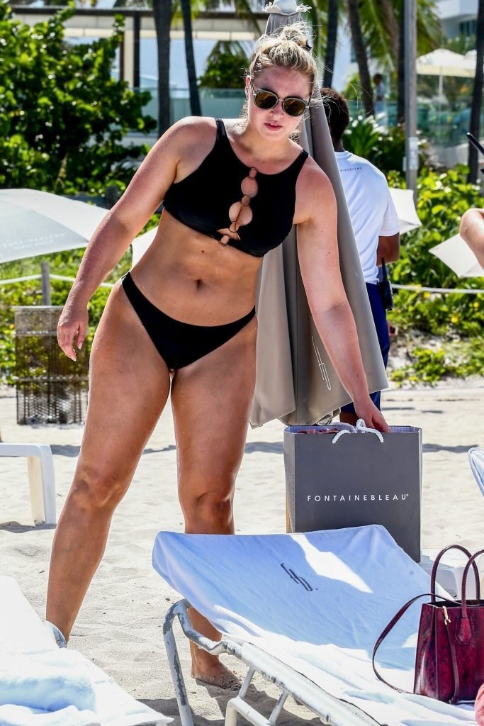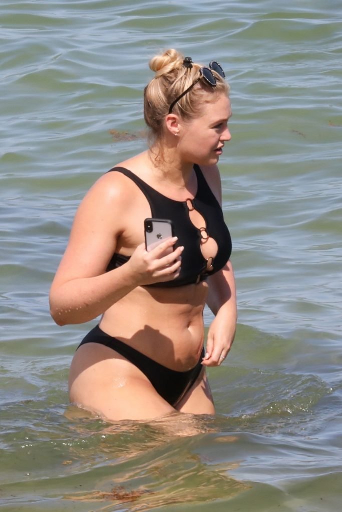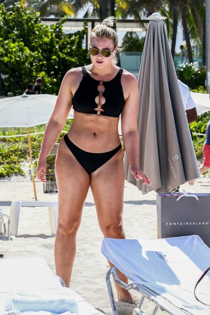Le mannequin anglais Iskra Lawrence (27 ans) affiche sa silhouette voluptueuse dans un bikini noir minimaliste tout en profitant d’une journée ensoleillée sur la plage de Miami, 12/07/2018.