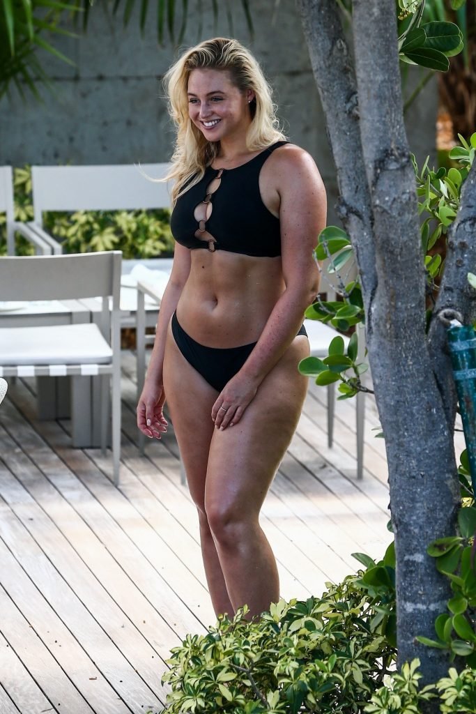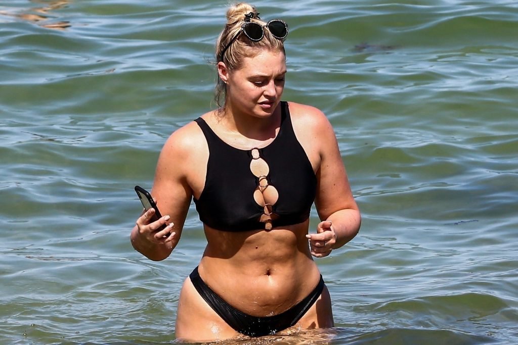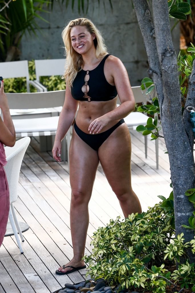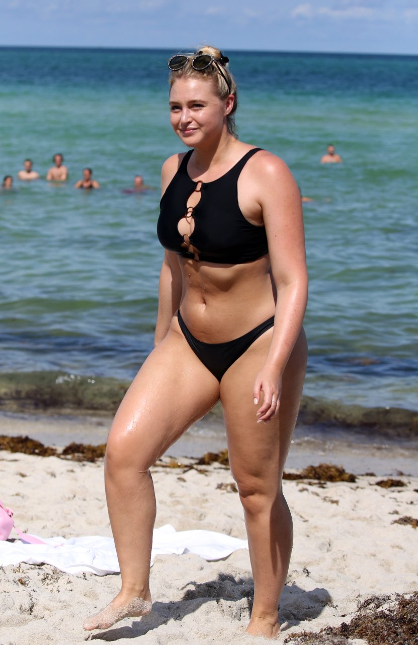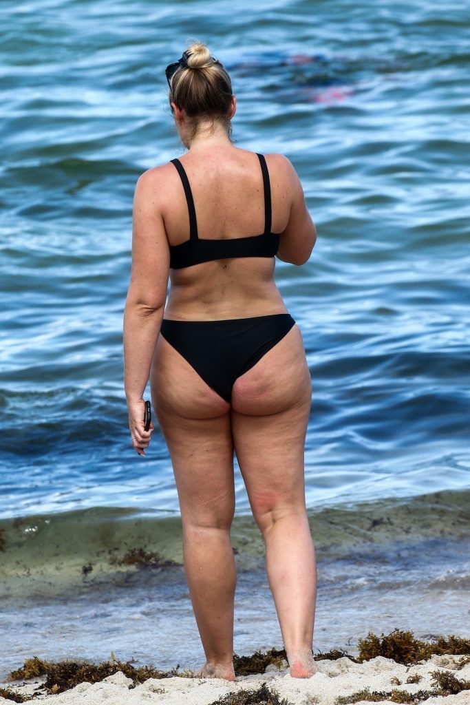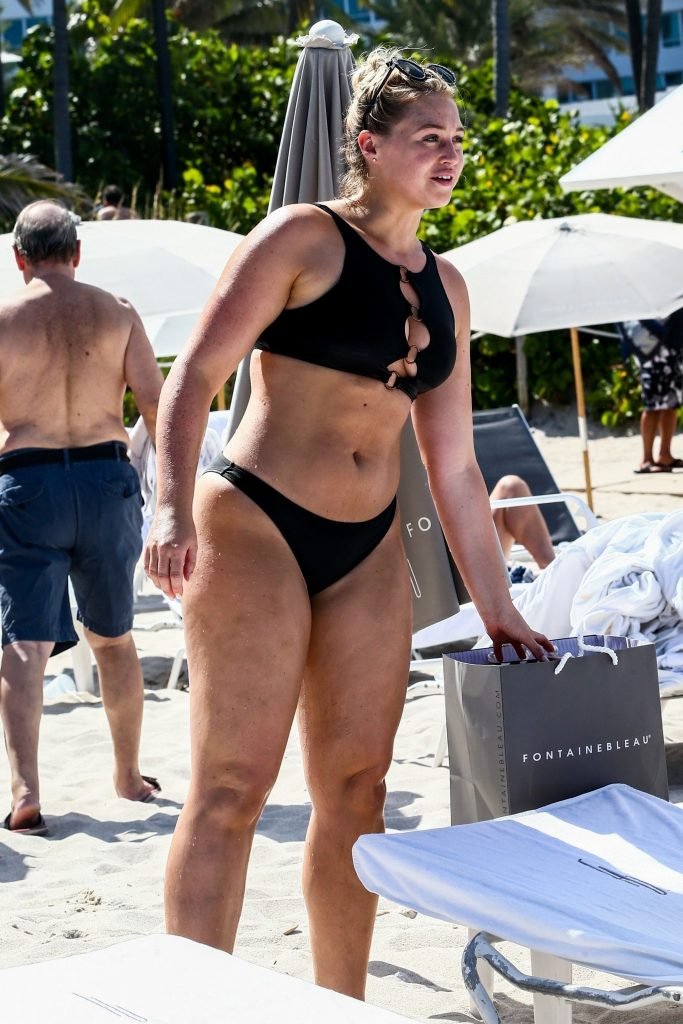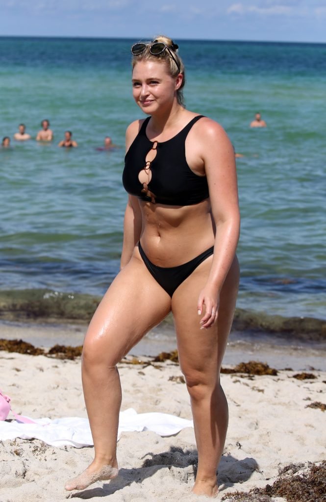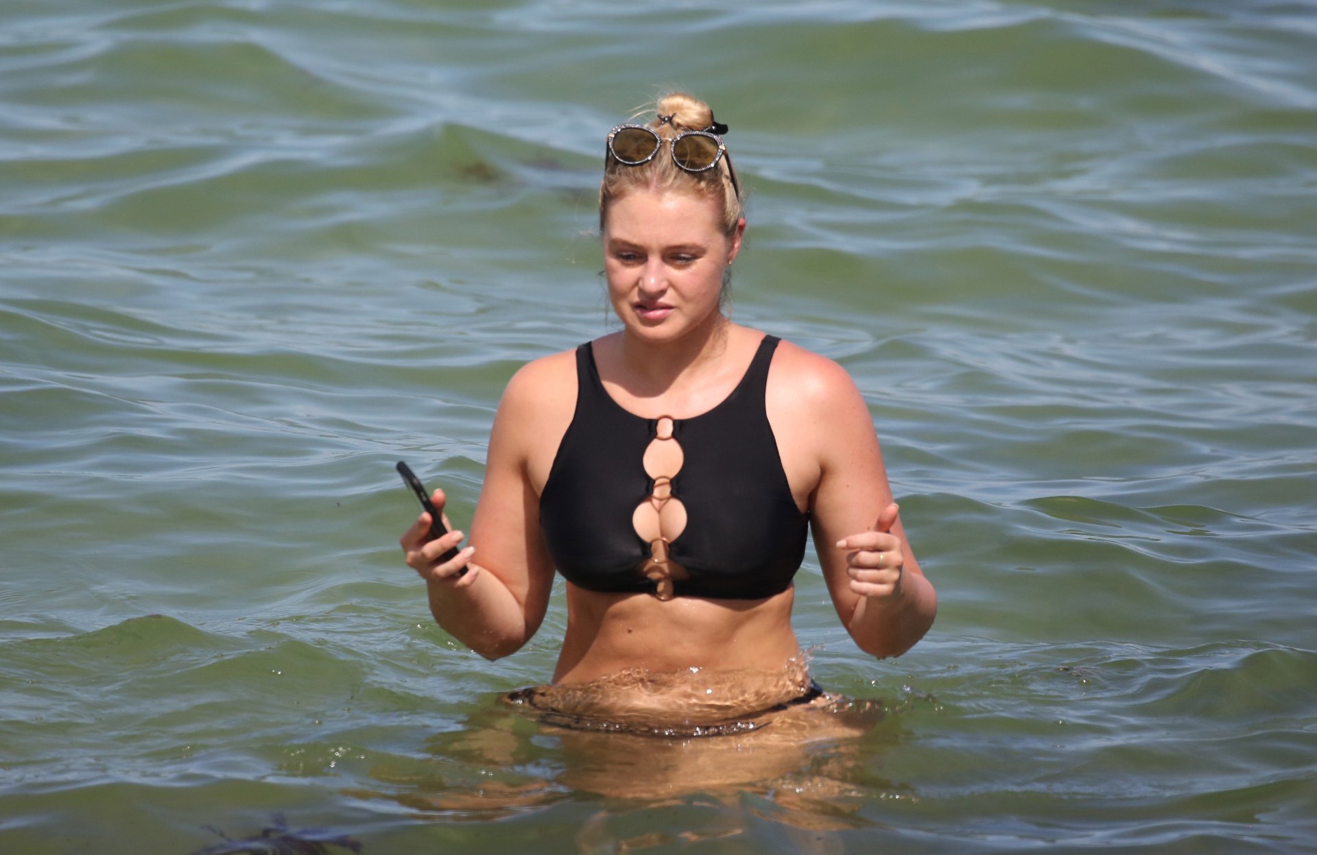 Le mannequin anglais Iskra Lawrence (27 ans) affiche sa silhouette voluptueuse dans un bikini noir minimaliste tout en profitant d’une journée ensoleillée sur la plage de Miami, 12/07/2018.