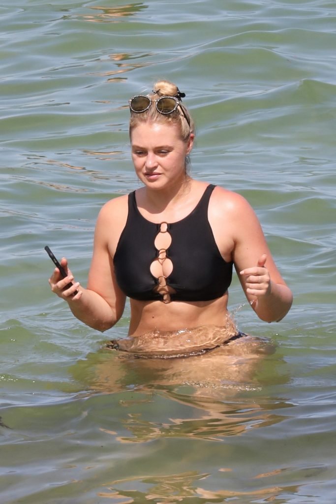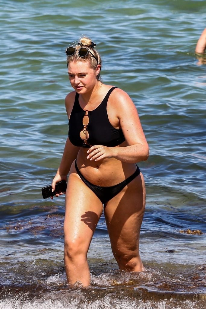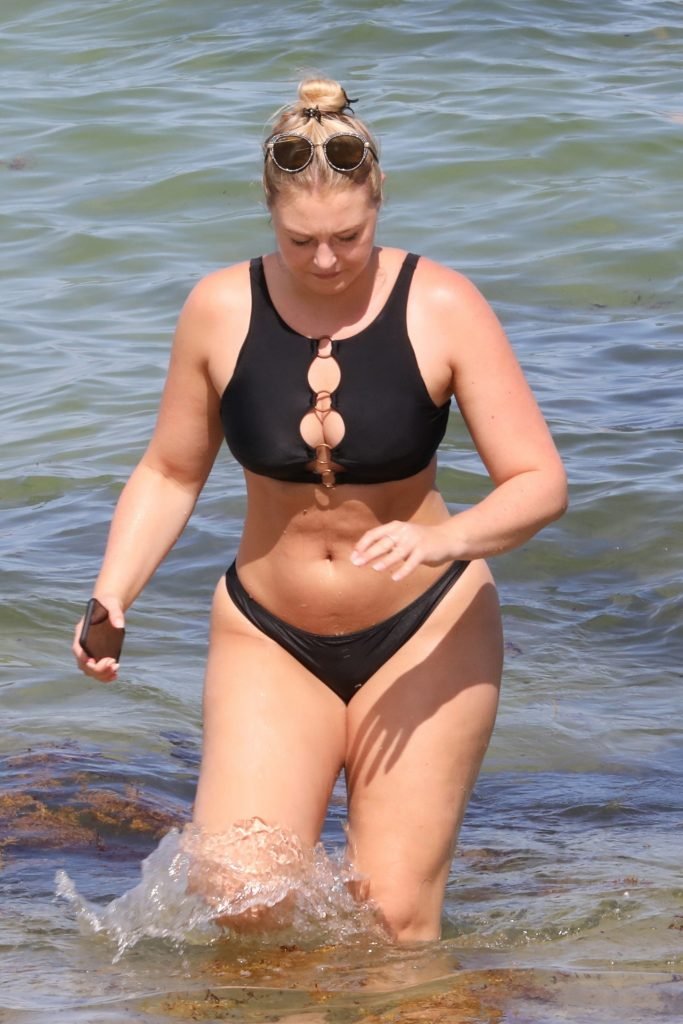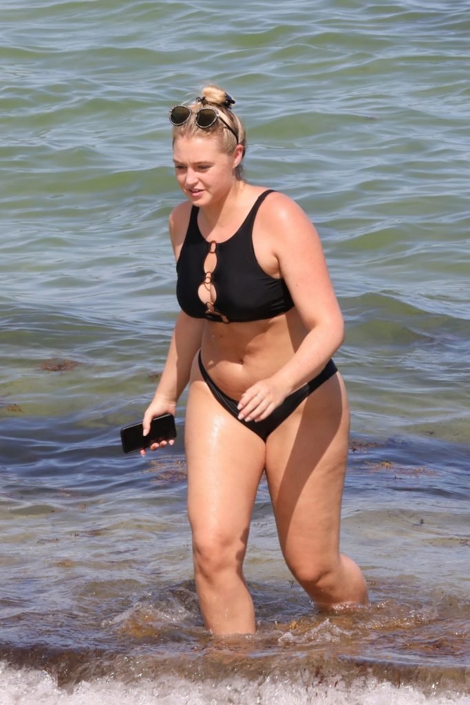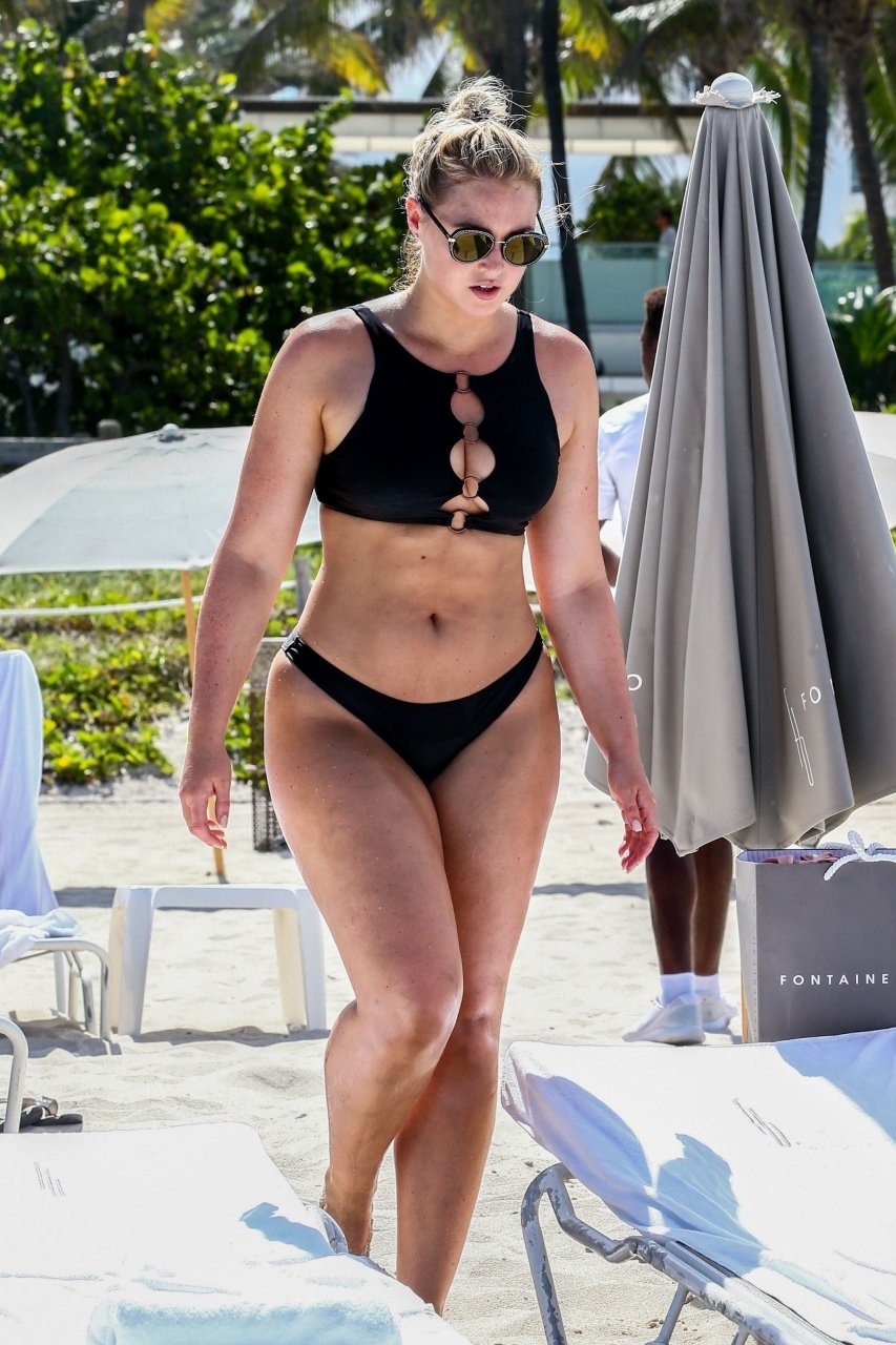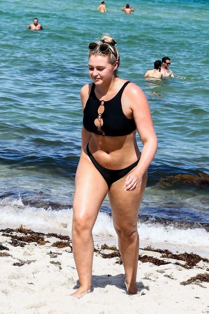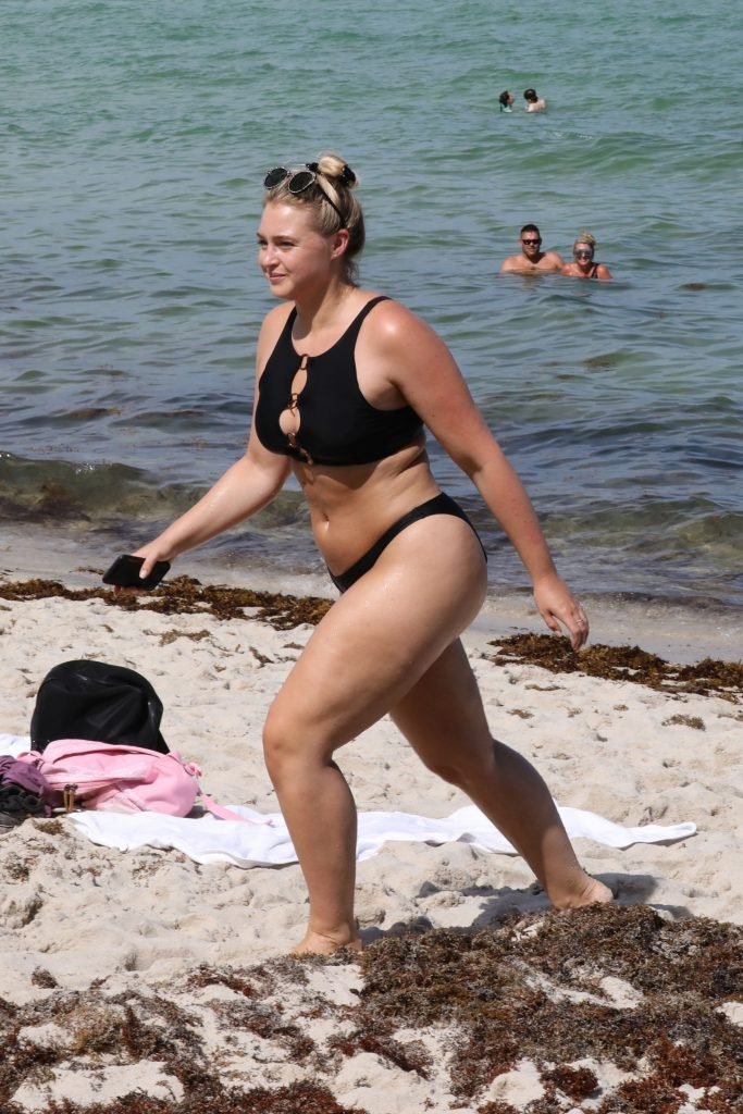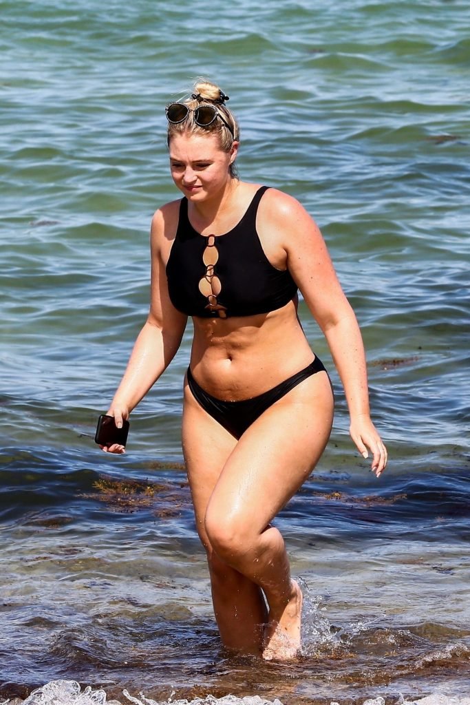 Le mannequin anglais Iskra Lawrence (27 ans) affiche sa silhouette voluptueuse dans un bikini noir minimaliste tout en profitant d’une journée ensoleillée sur la plage de Miami, 12/07/2018.