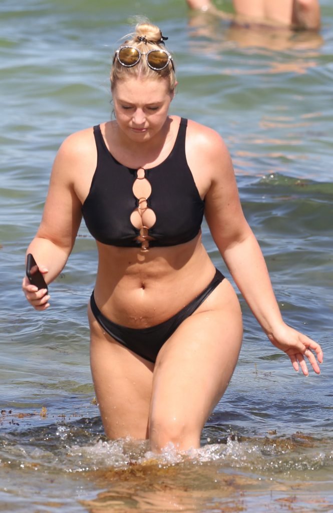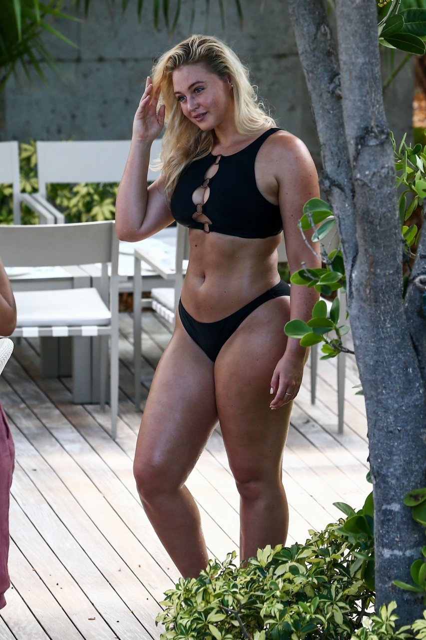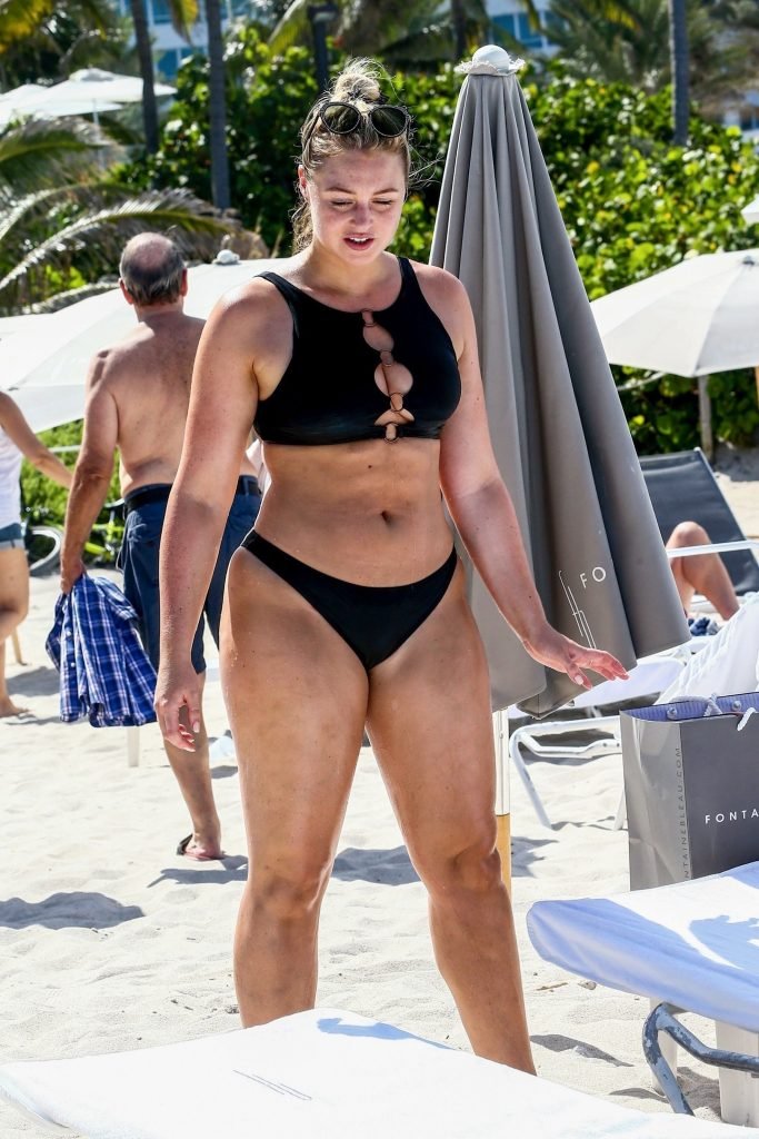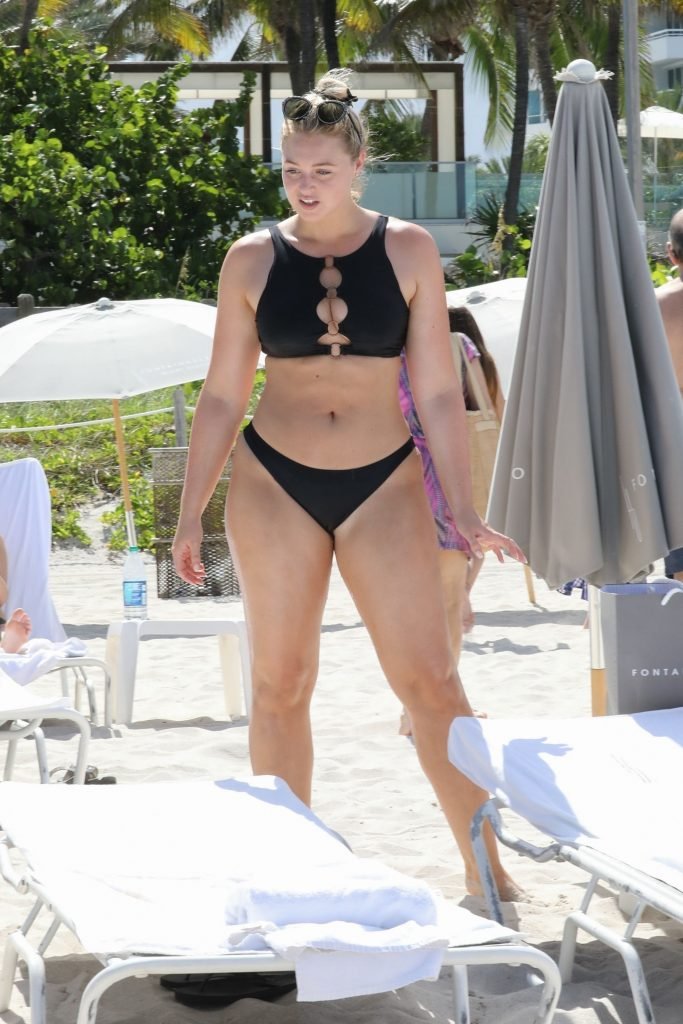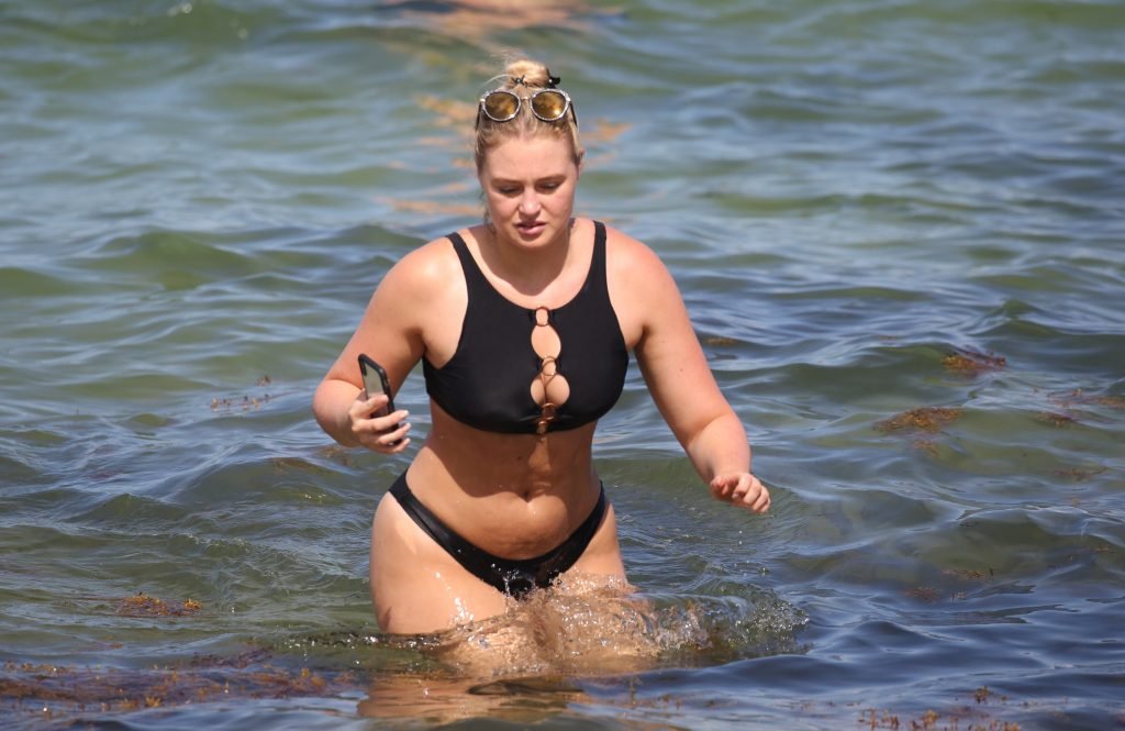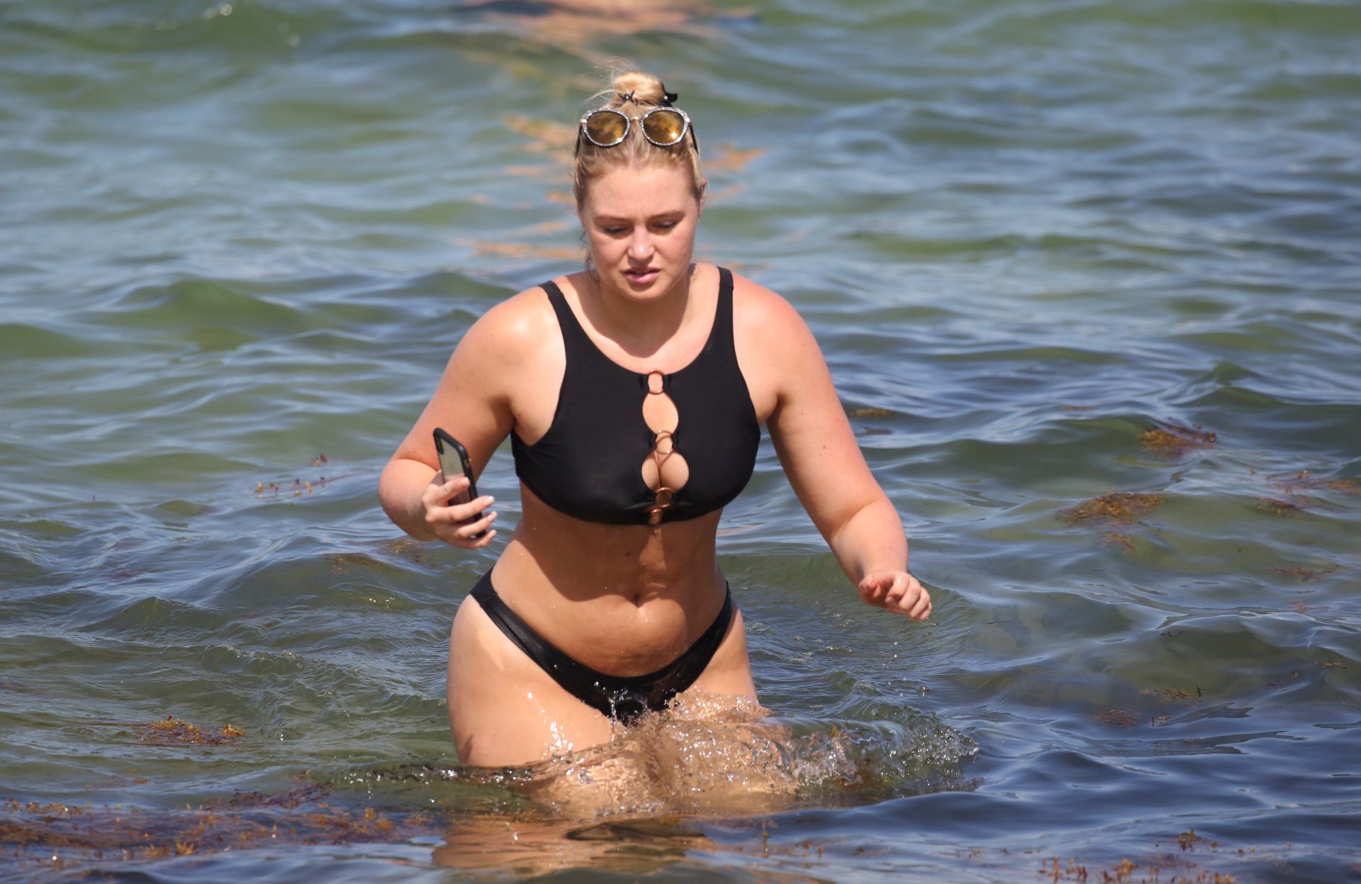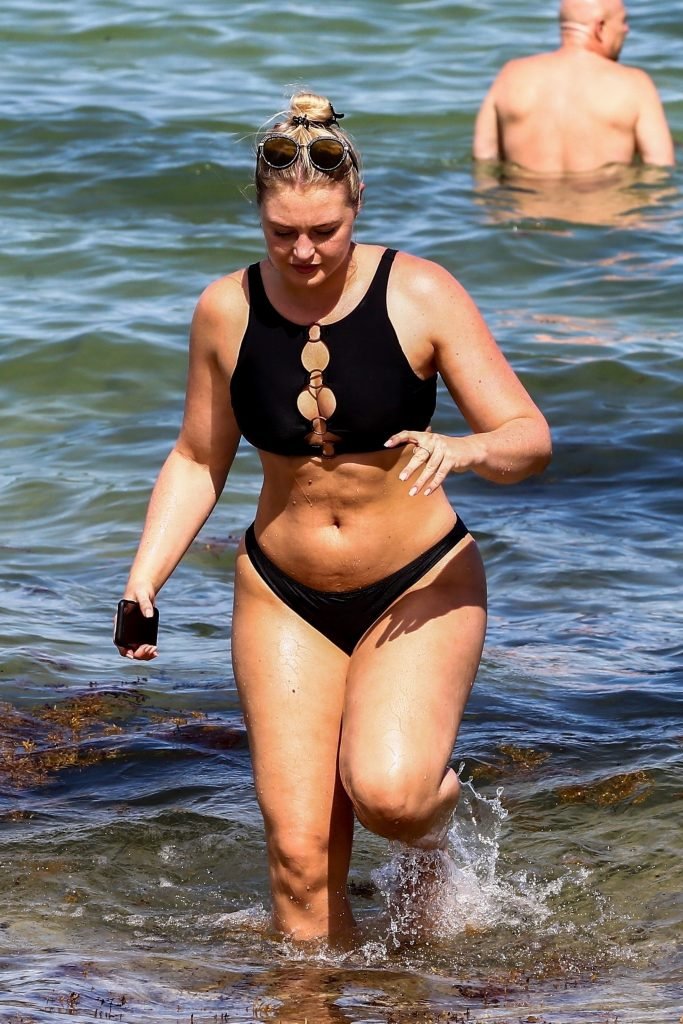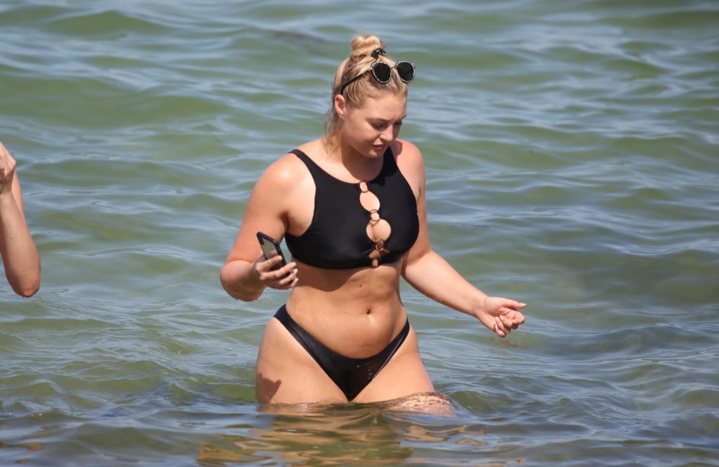 Le mannequin anglais Iskra Lawrence (27 ans) affiche sa silhouette voluptueuse dans un bikini noir minimaliste tout en profitant d’une journée ensoleillée sur la plage de Miami, 12/07/2018.