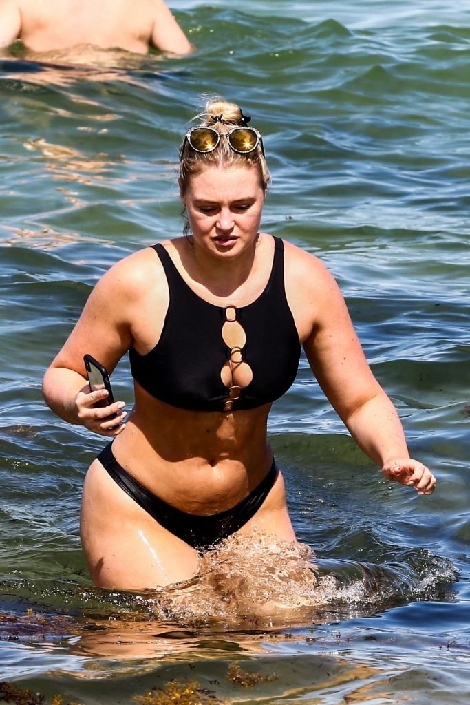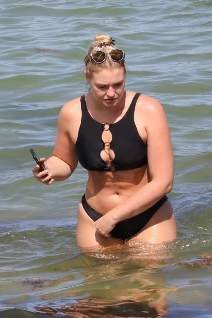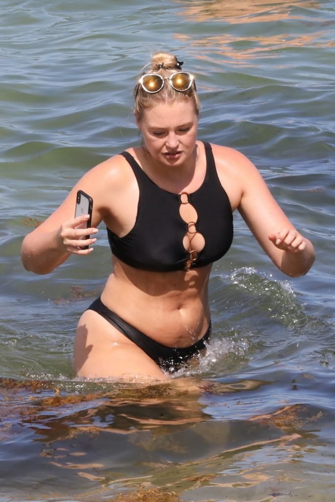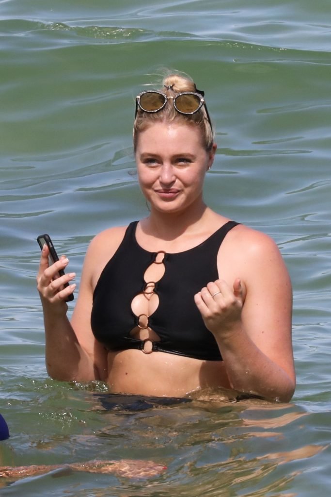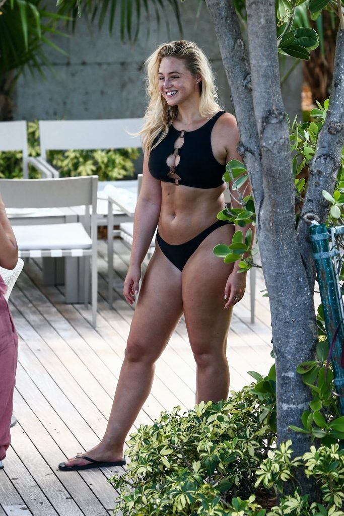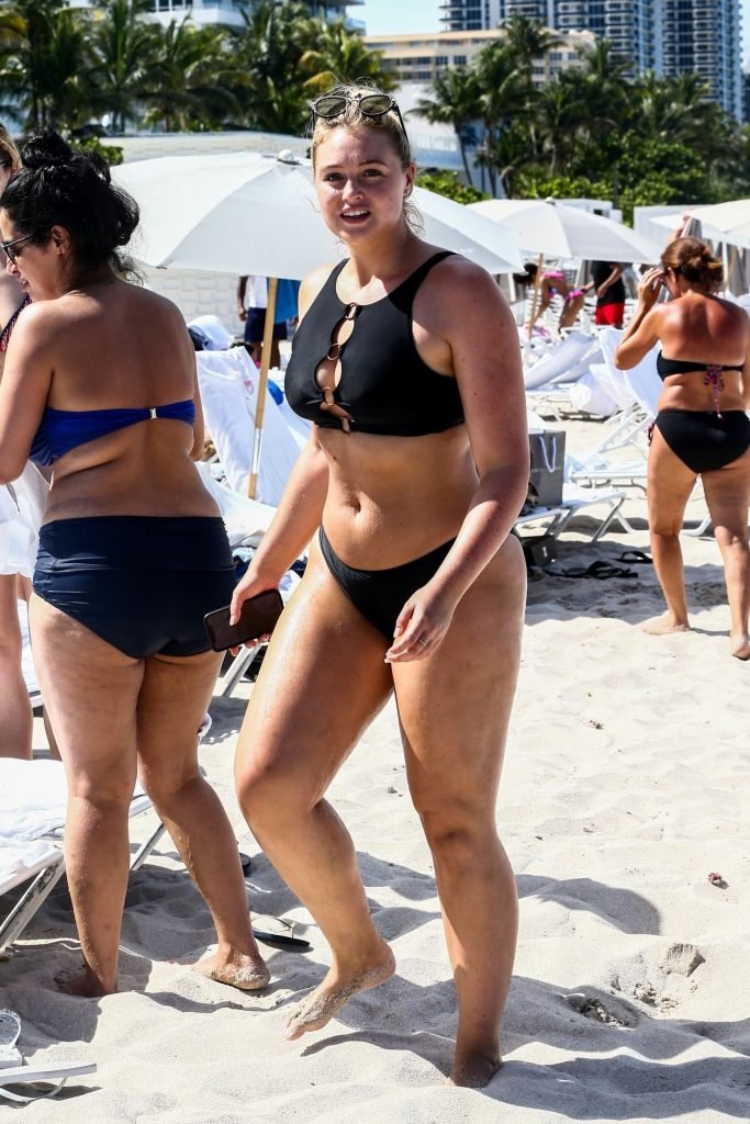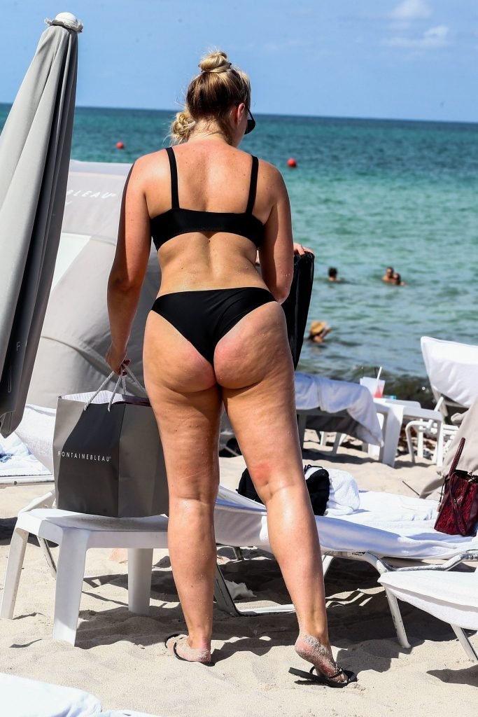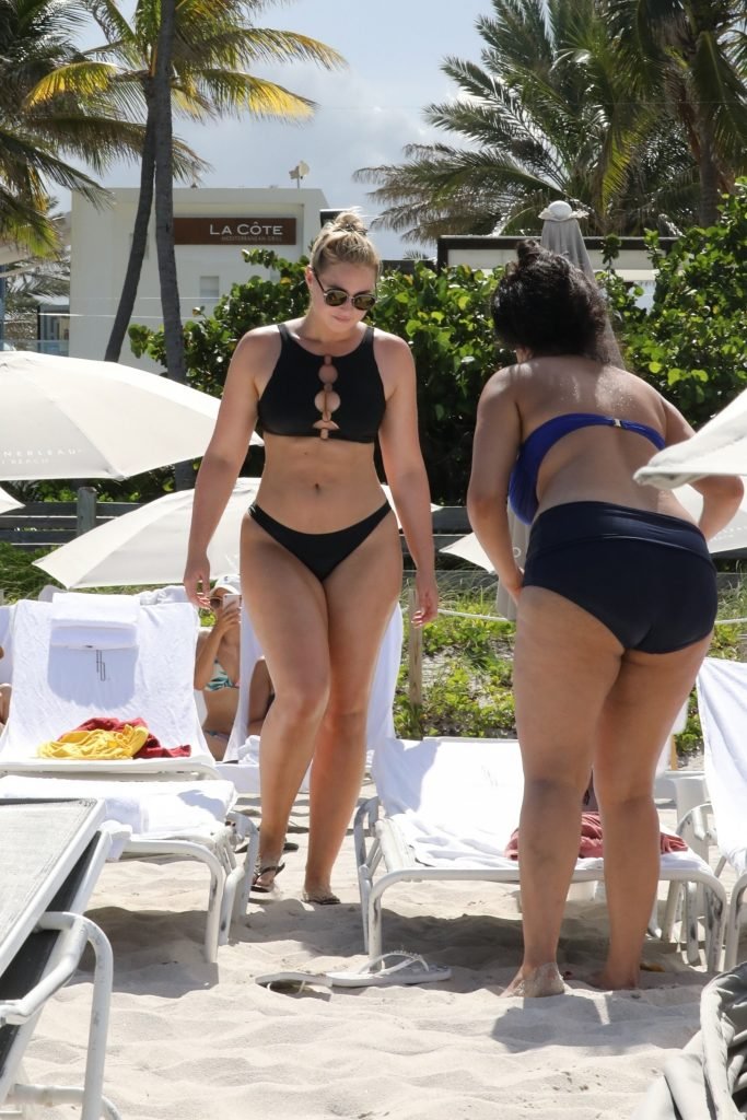 Le mannequin anglais Iskra Lawrence (27 ans) affiche sa silhouette voluptueuse dans un bikini noir minimaliste tout en profitant d’une journée ensoleillée sur la plage de Miami, 12/07/2018.