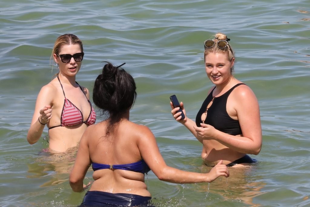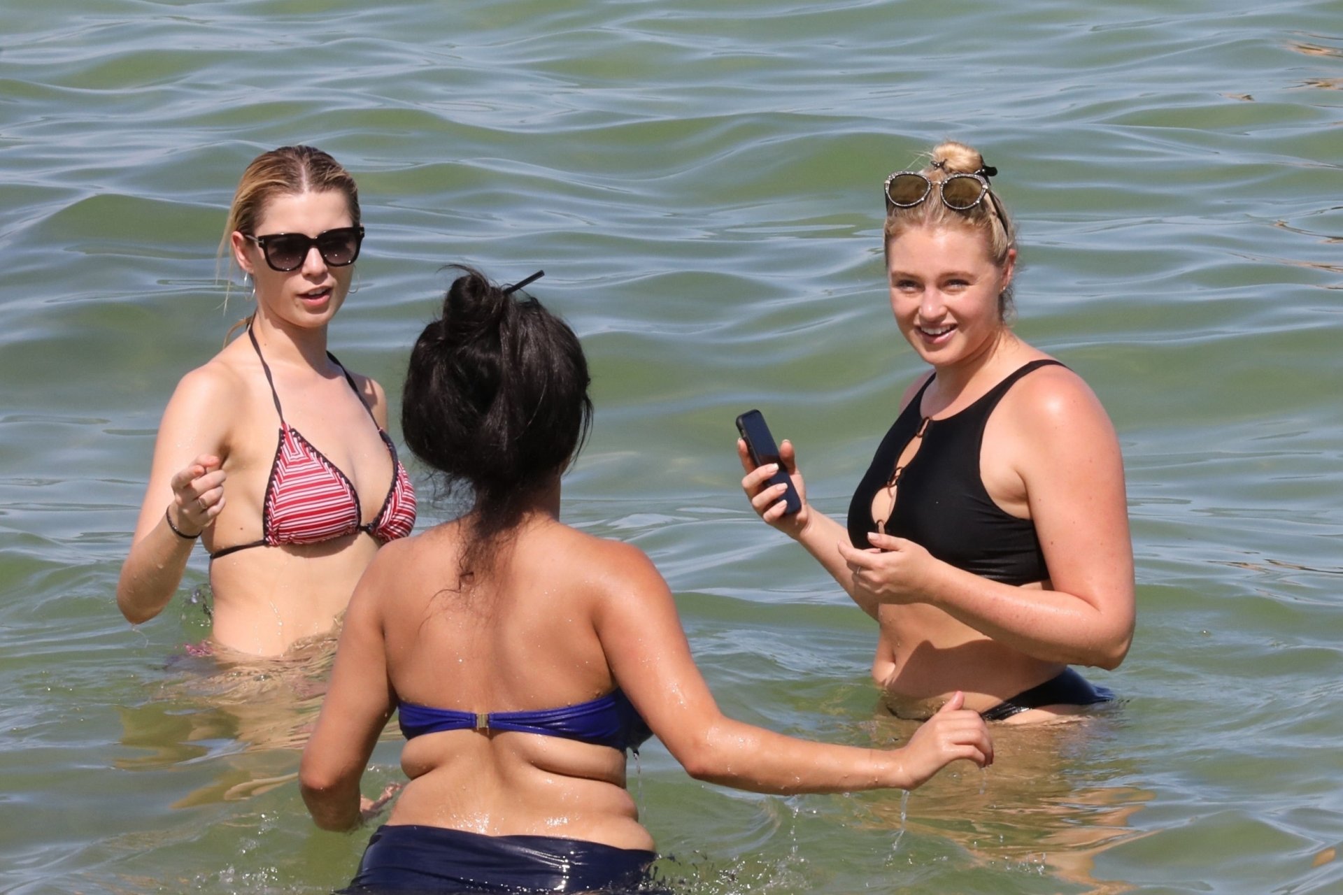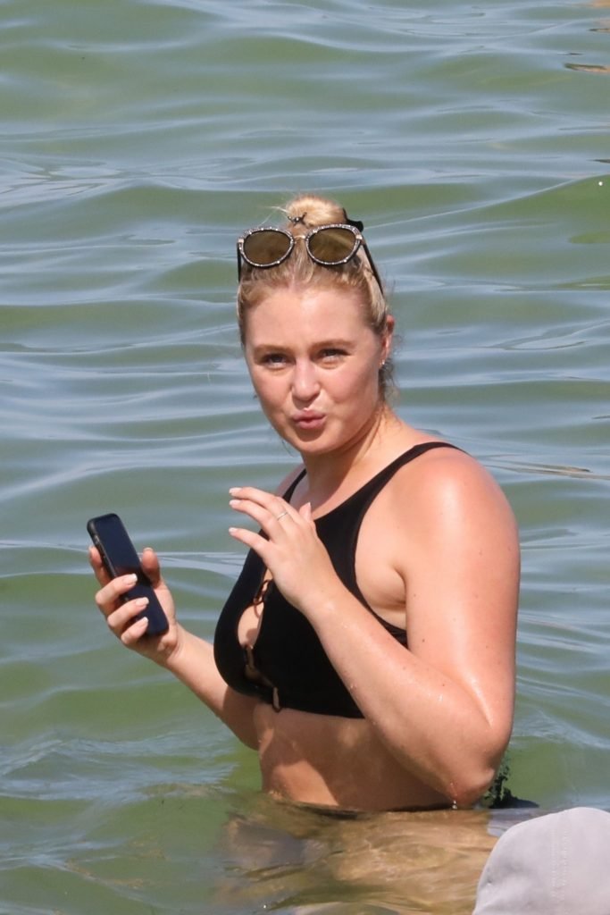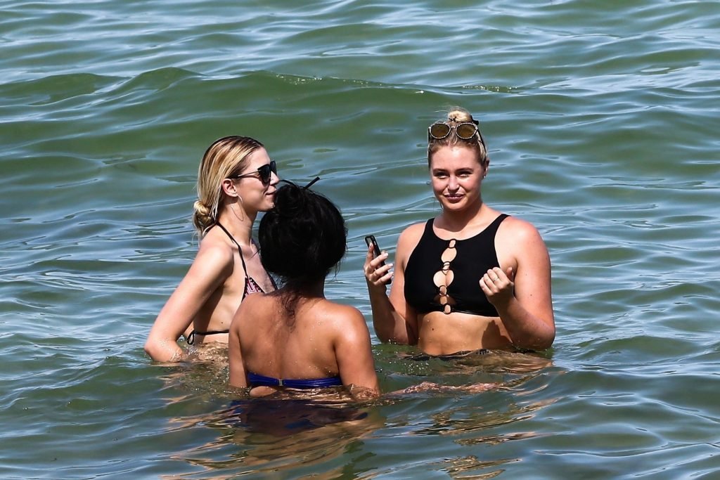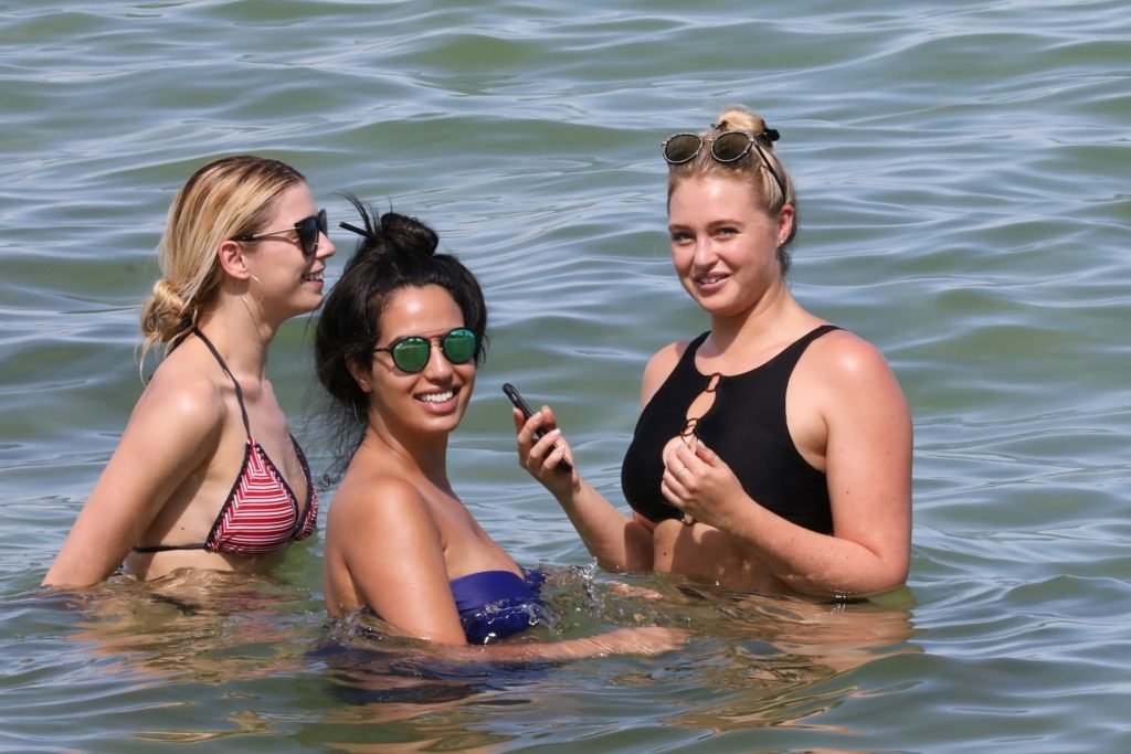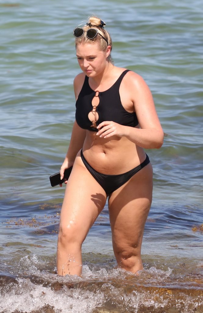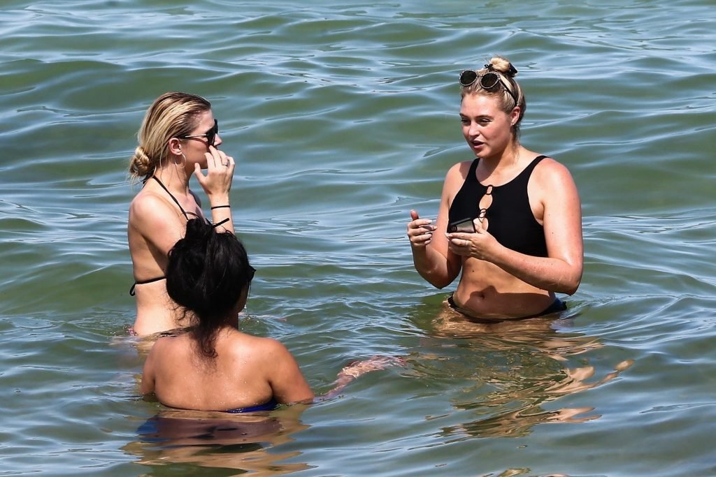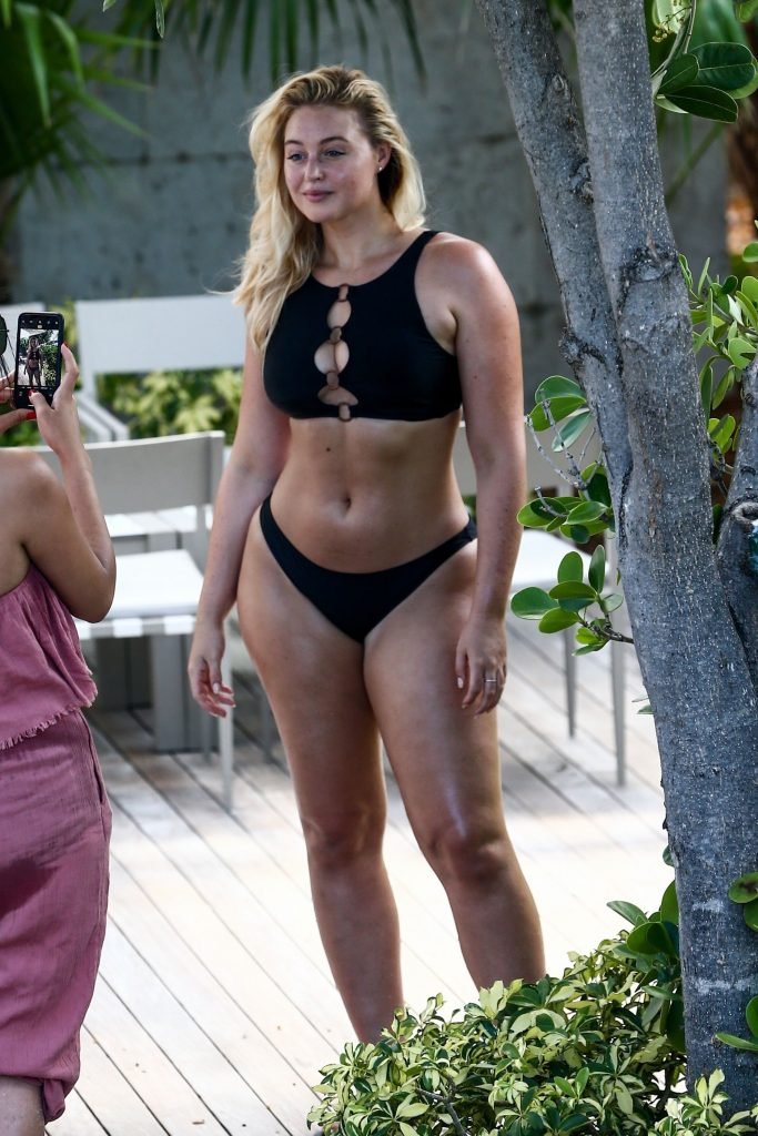 Le mannequin anglais Iskra Lawrence (27 ans) affiche sa silhouette voluptueuse dans un bikini noir minimaliste tout en profitant d’une journée ensoleillée sur la plage de Miami, 12/07/2018.