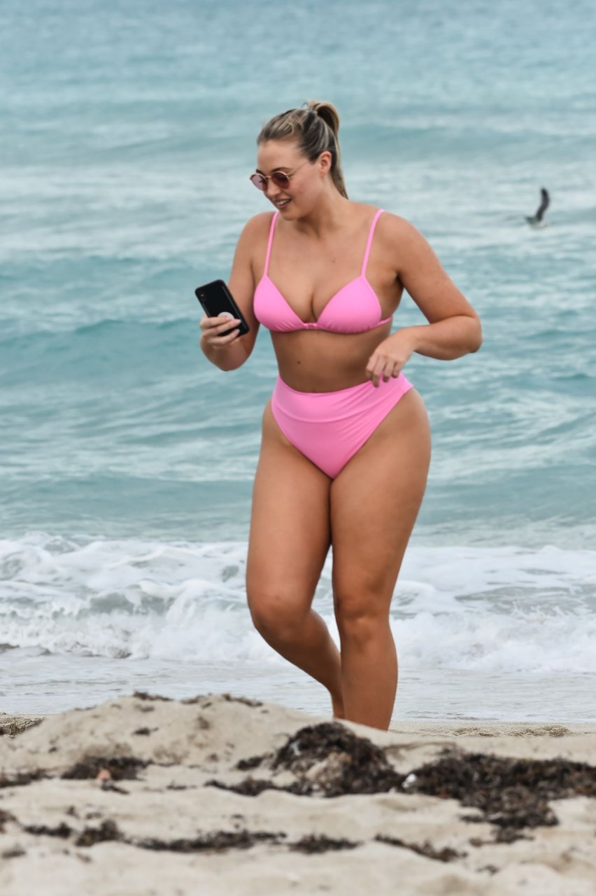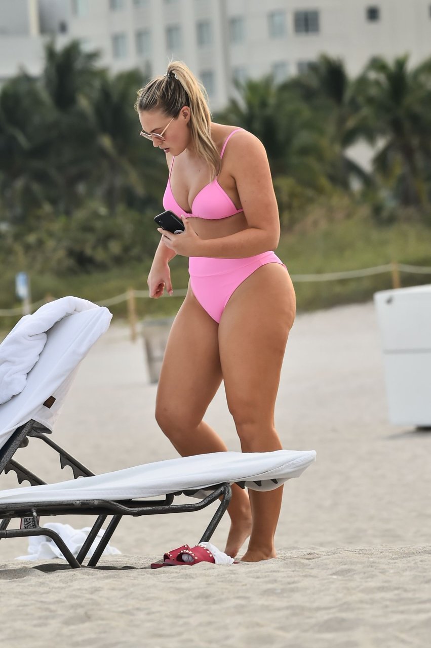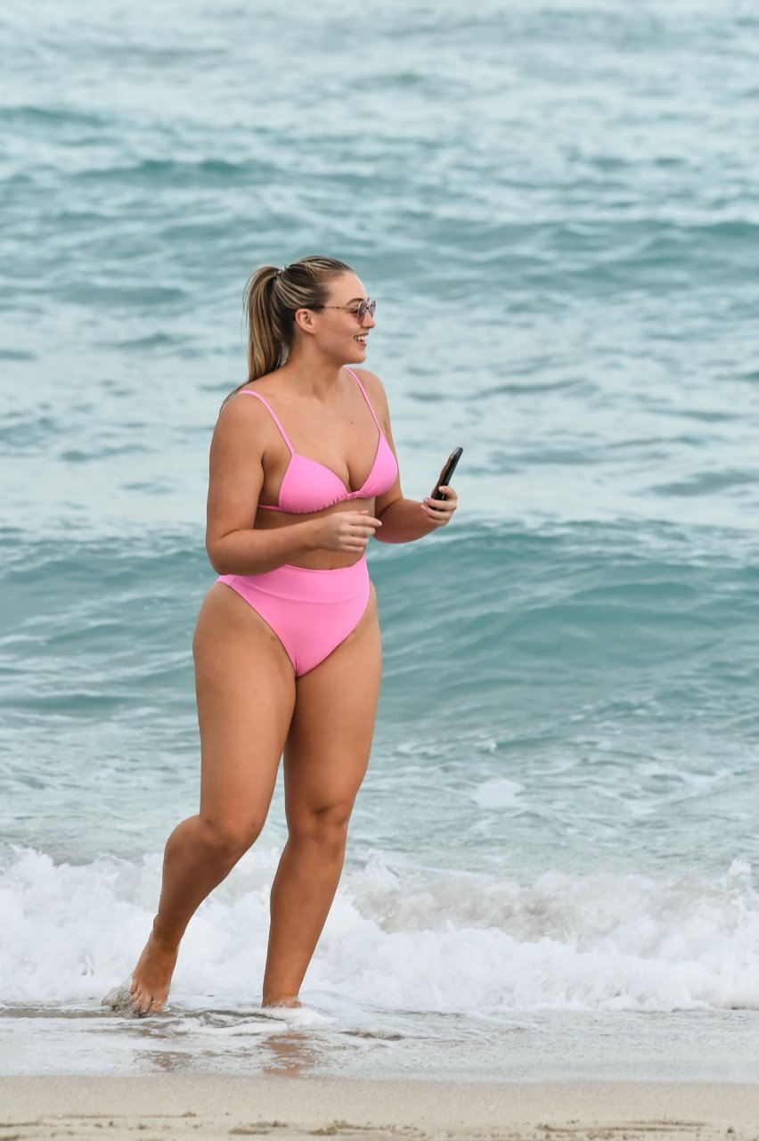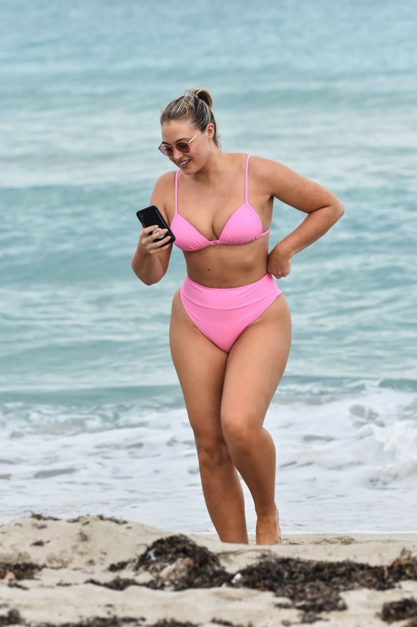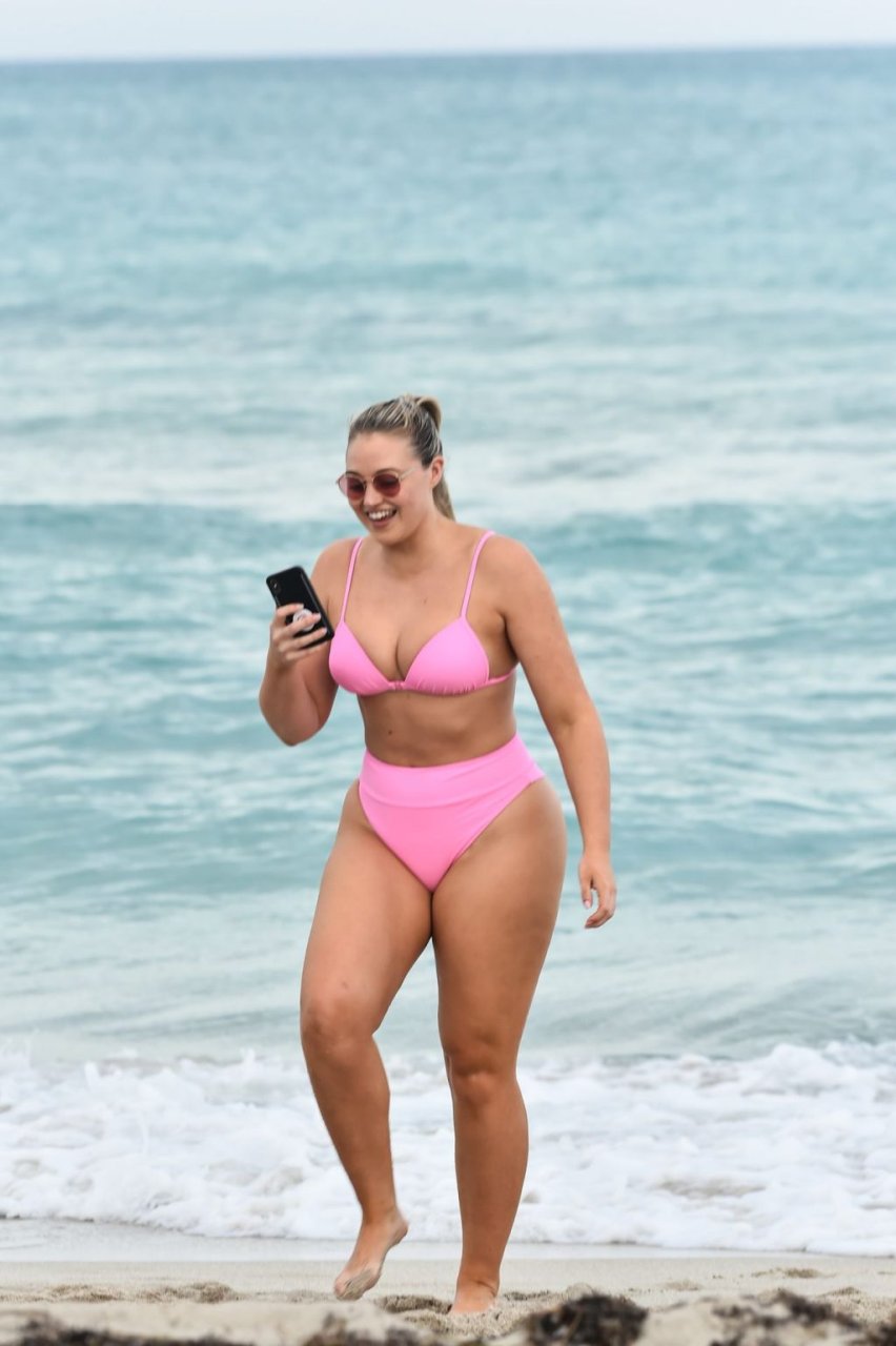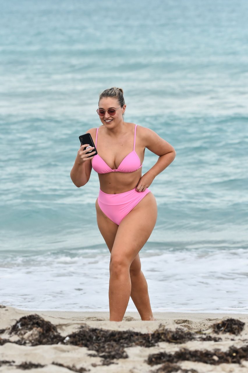 Le mannequin Iskra Lawrence met en valeur ses courbes à la plage dans un bikini rose à Miami, le 12/09/2018. Iskra est superbe alors qu’elle profite de sa journée à la plage.