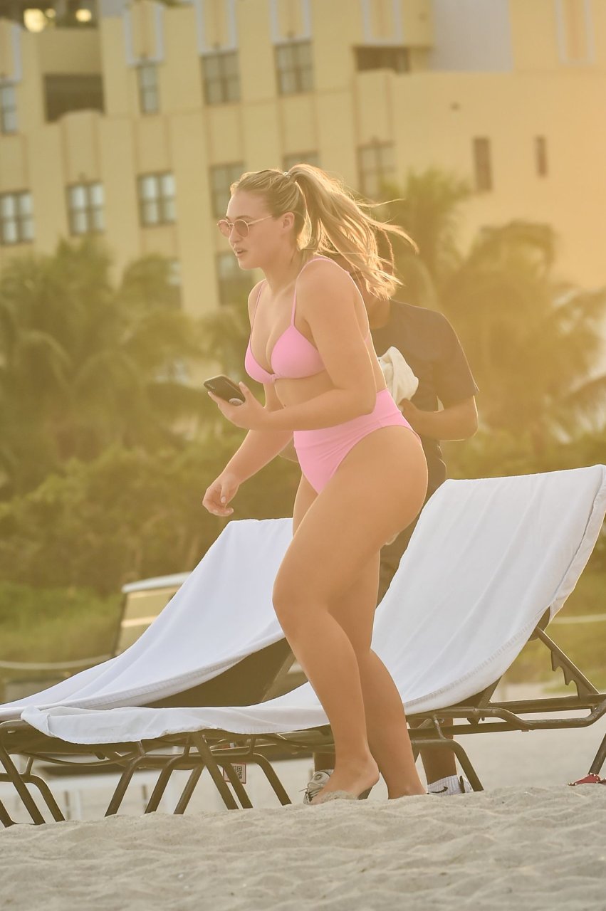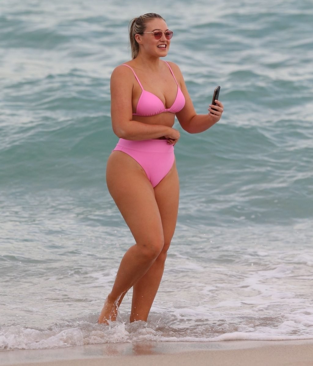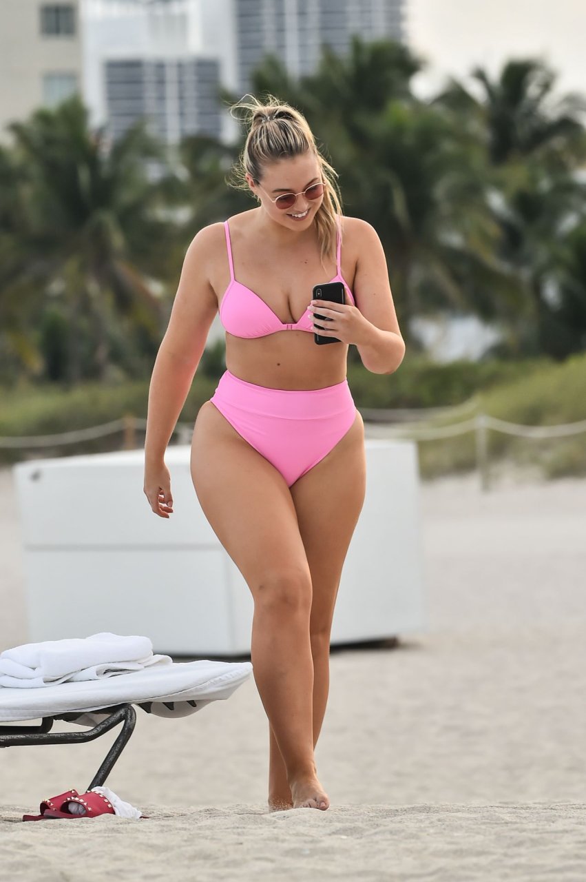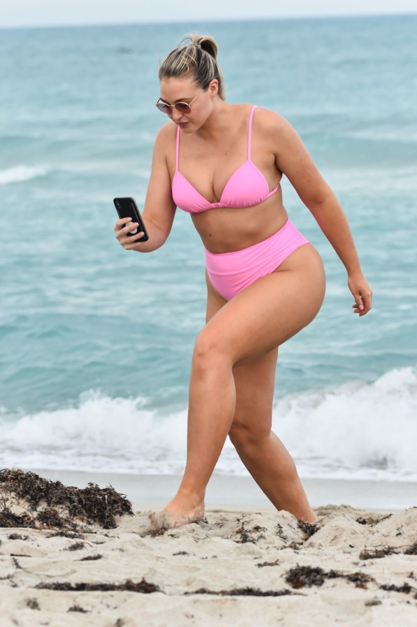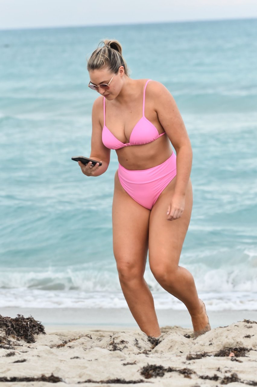 Le mannequin Iskra Lawrence met en valeur ses courbes à la plage dans un bikini rose à Miami, le 12/09/2018. Iskra est superbe alors qu’elle profite de sa journée à la plage.
