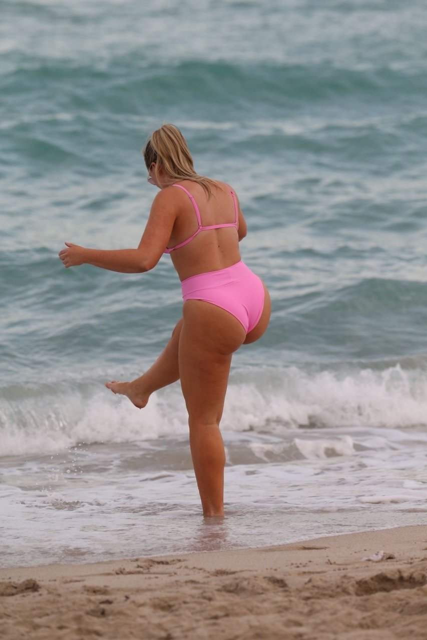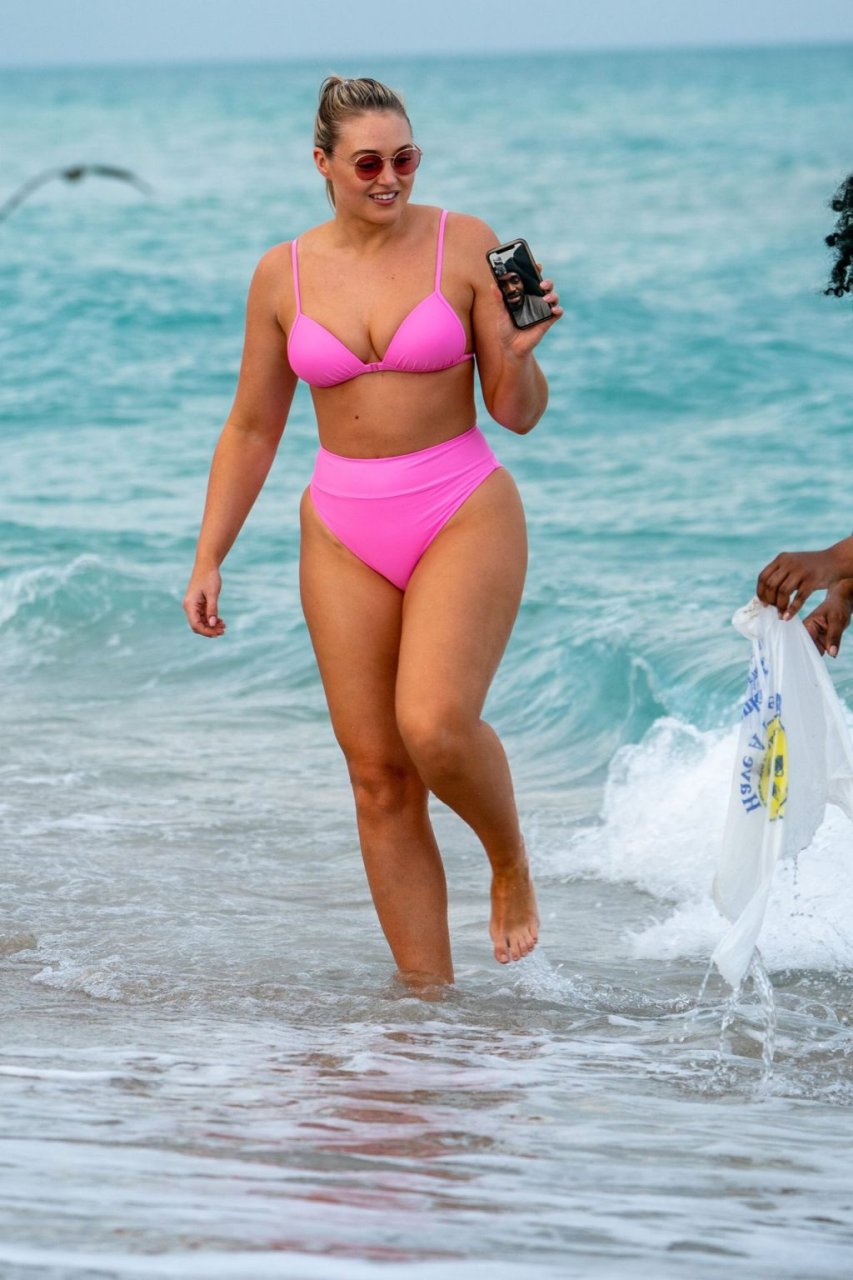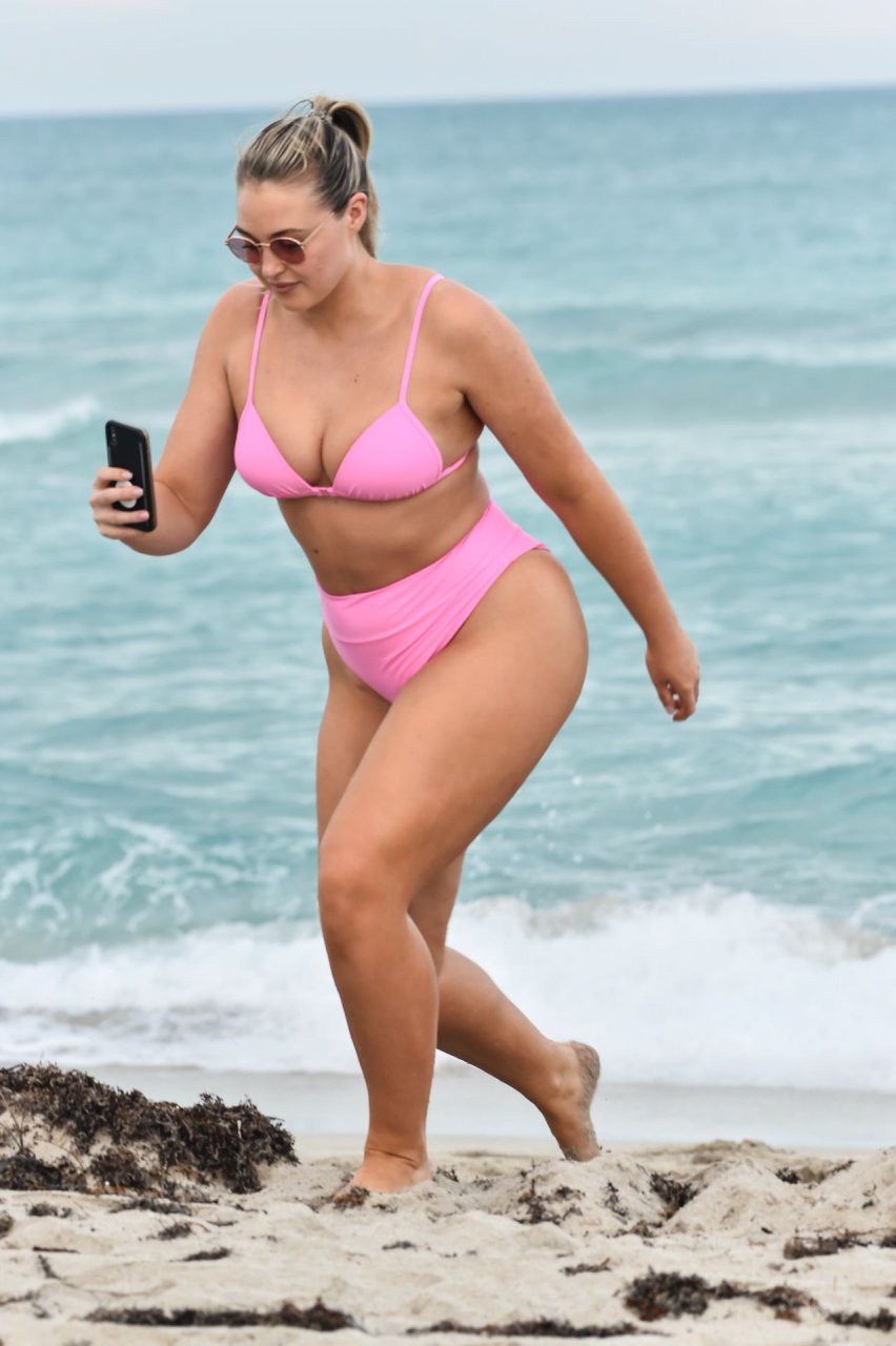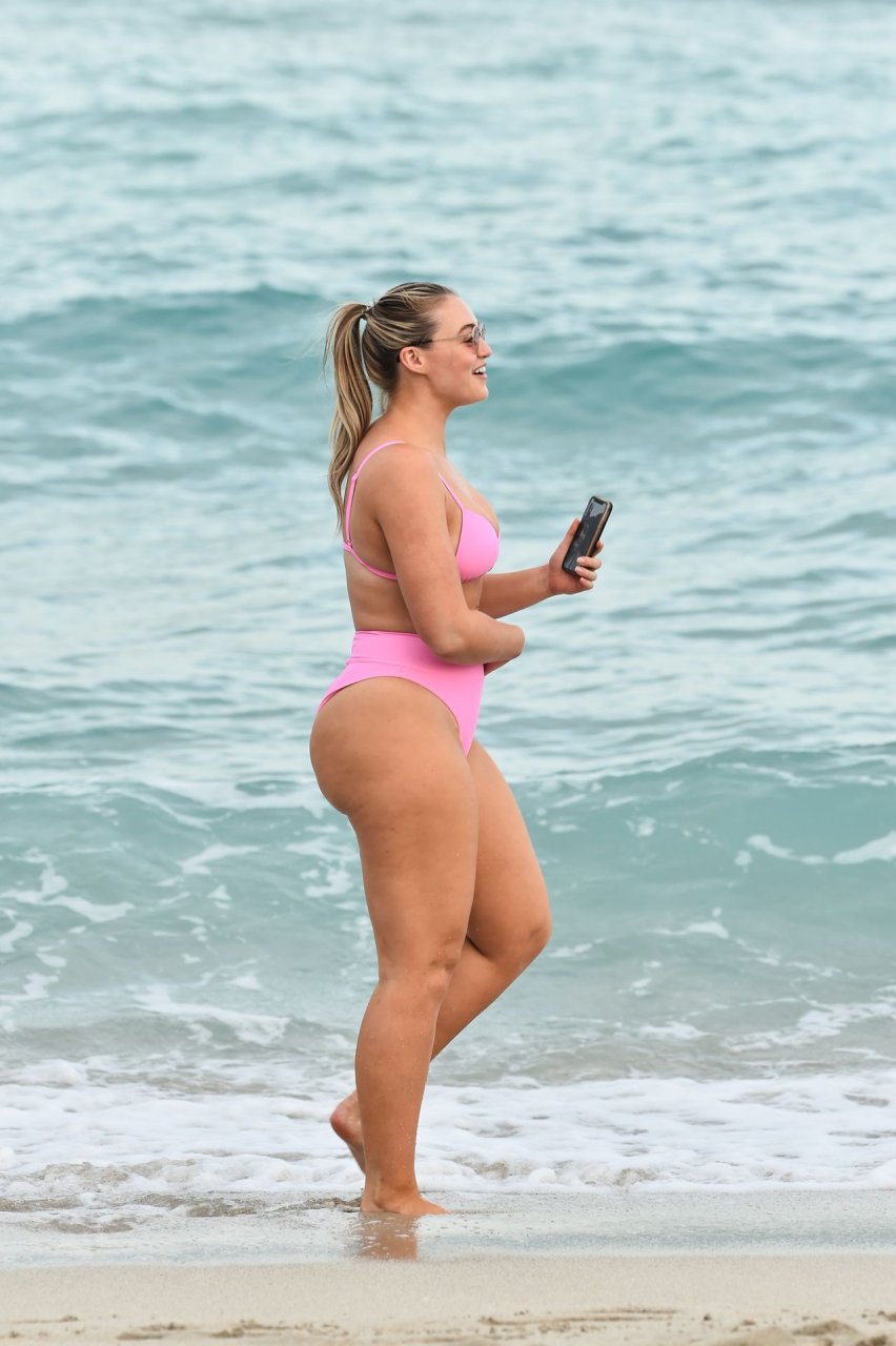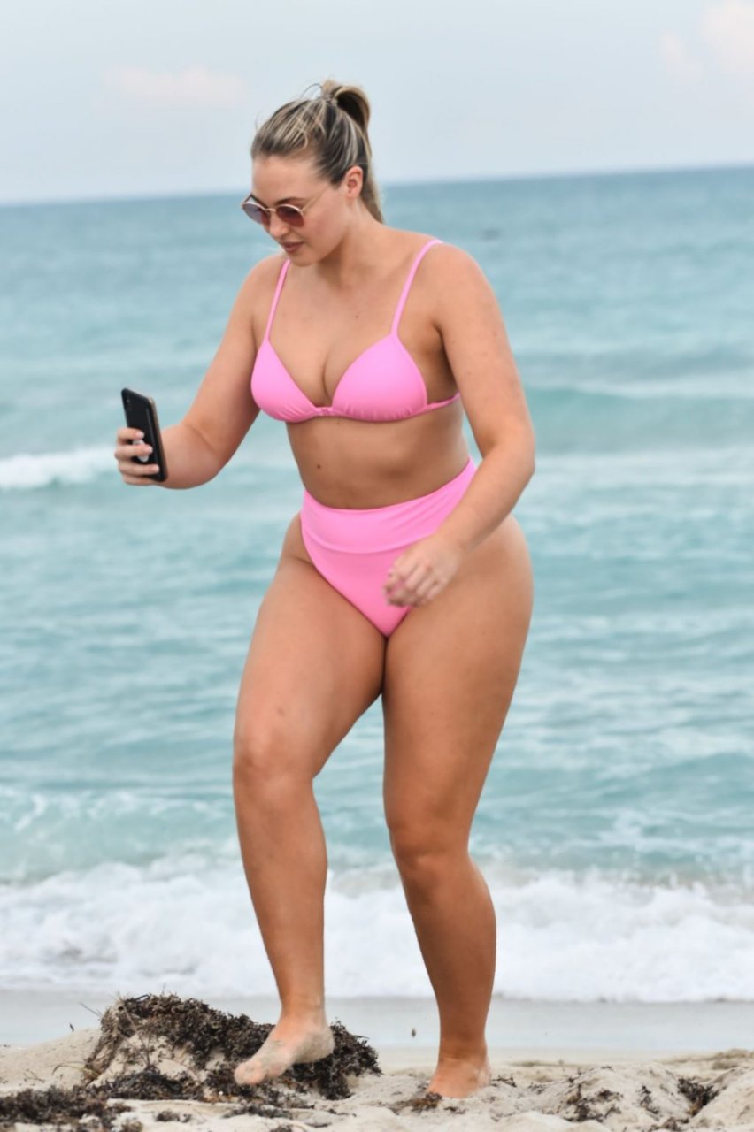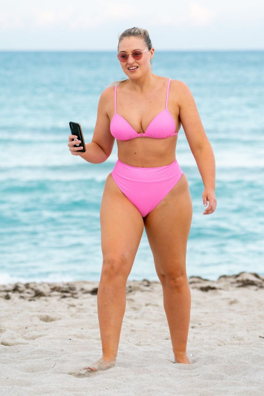 Le mannequin Iskra Lawrence met en valeur ses courbes à la plage dans un bikini rose à Miami, le 12/09/2018. Iskra est superbe alors qu’elle profite de sa journée à la plage.