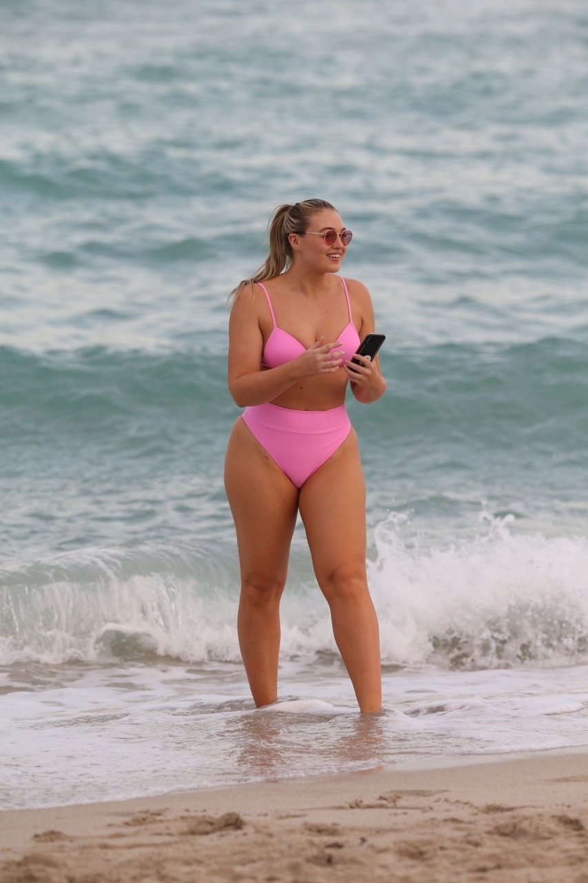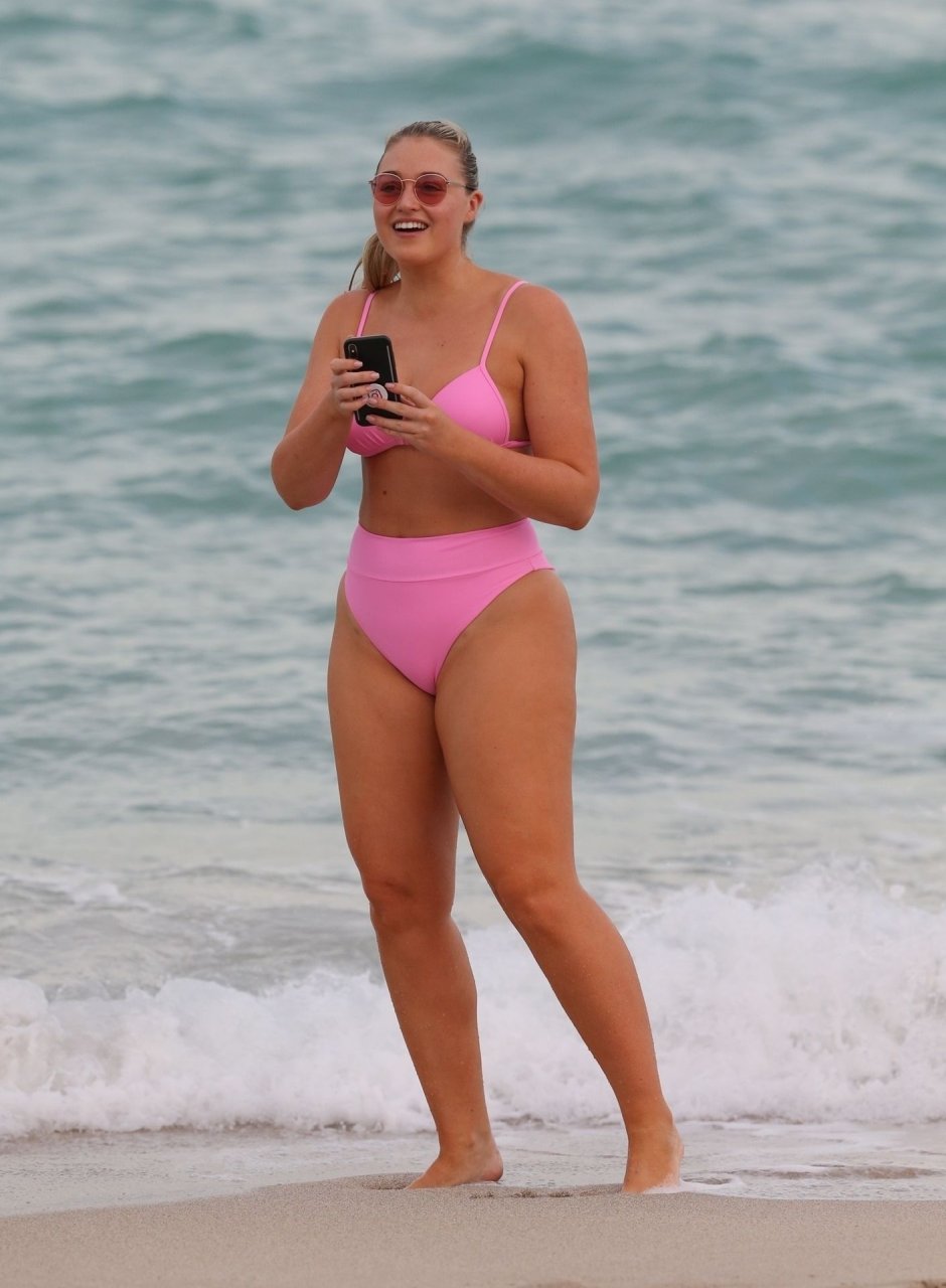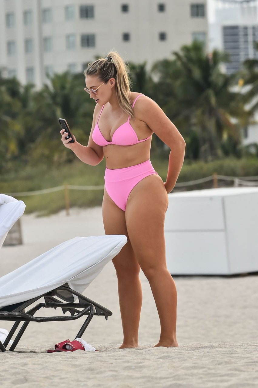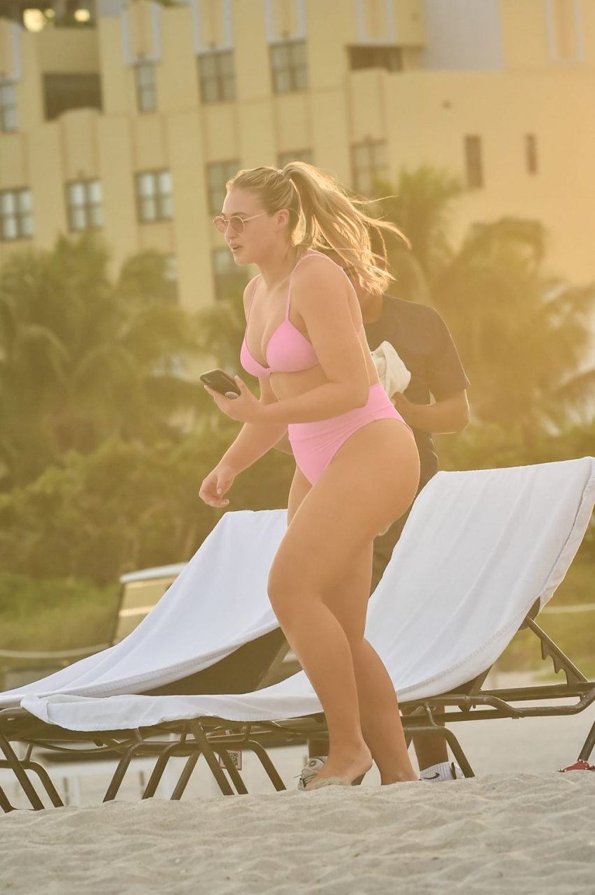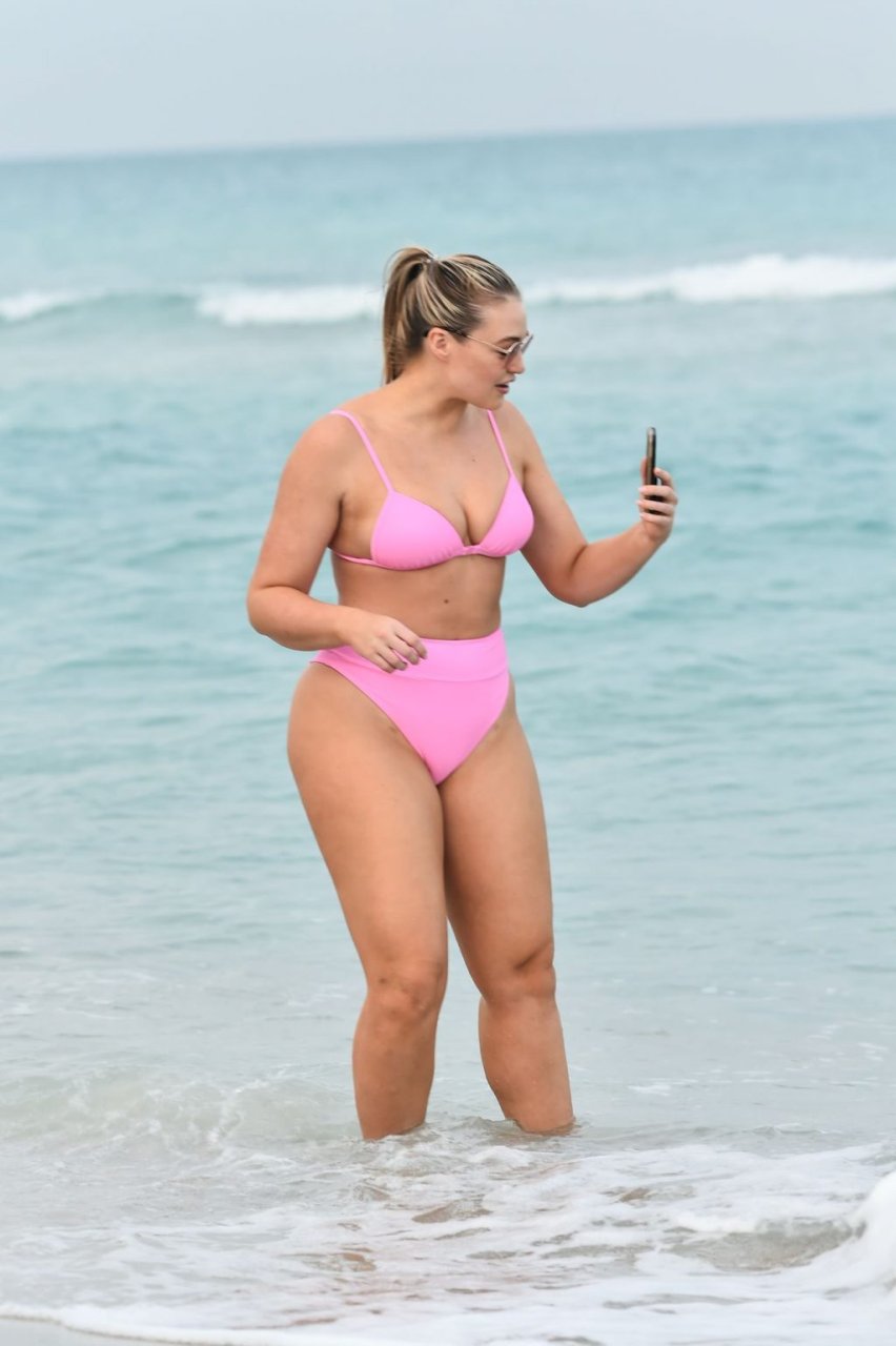 Le mannequin Iskra Lawrence met en valeur ses courbes à la plage dans un bikini rose à Miami, le 12/09/2018. Iskra est superbe alors qu’elle profite de sa journée à la plage.