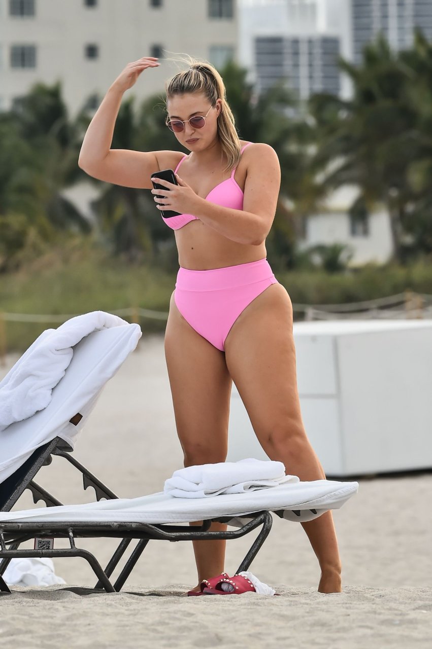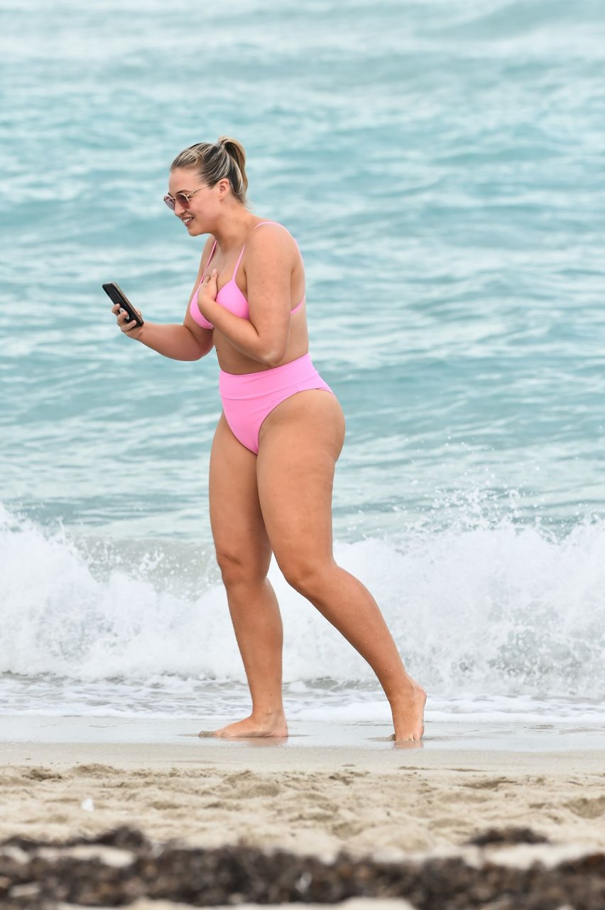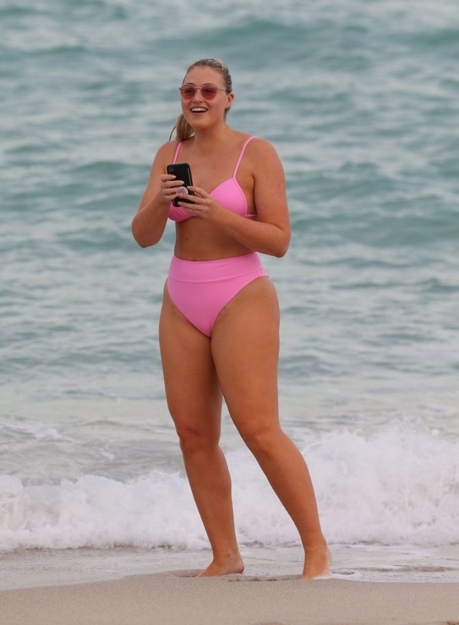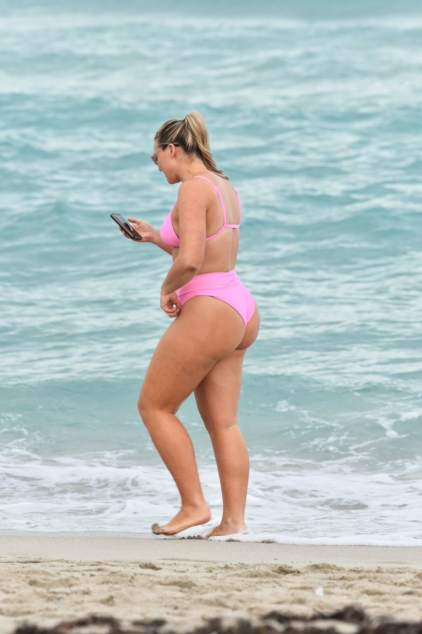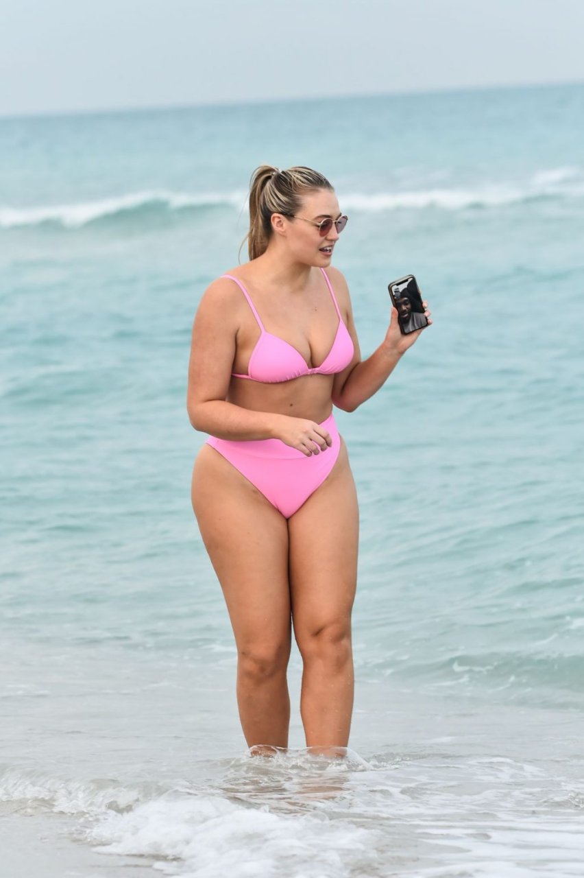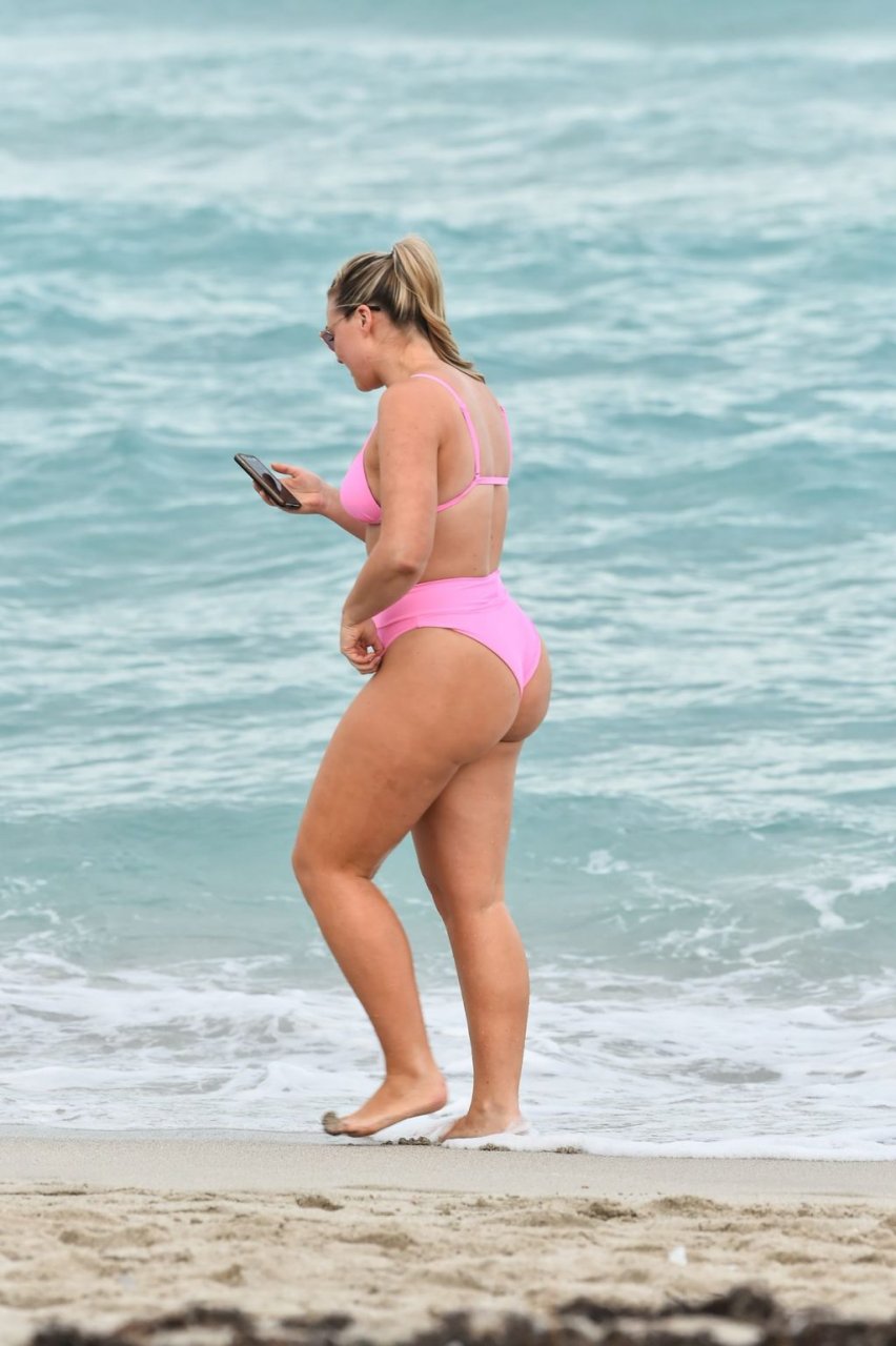 Le mannequin Iskra Lawrence met en valeur ses courbes à la plage dans un bikini rose à Miami, le 12/09/2018. Iskra est superbe alors qu’elle profite de sa journée à la plage.