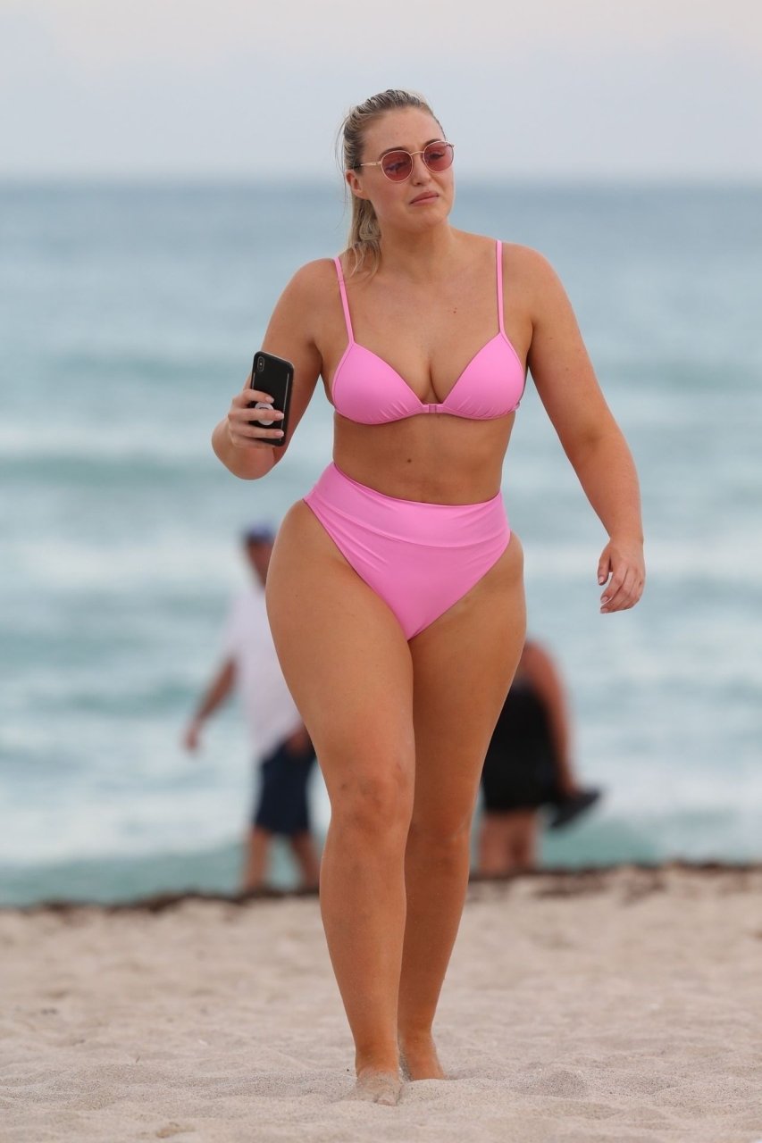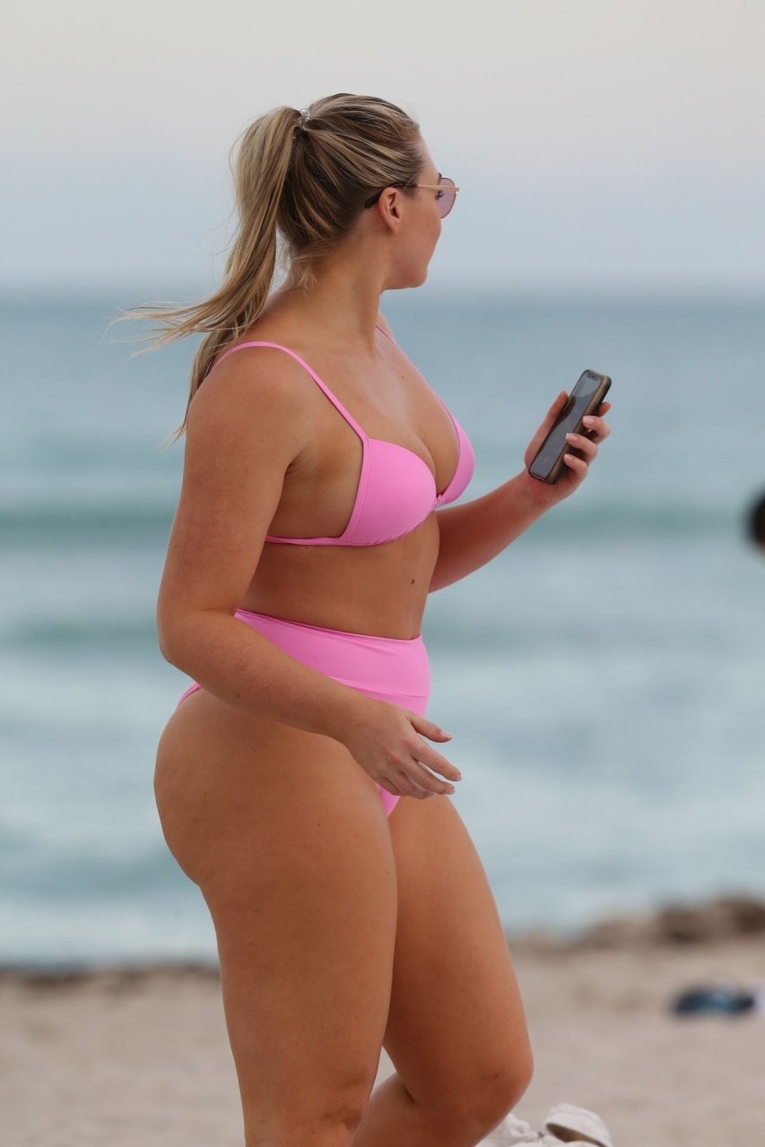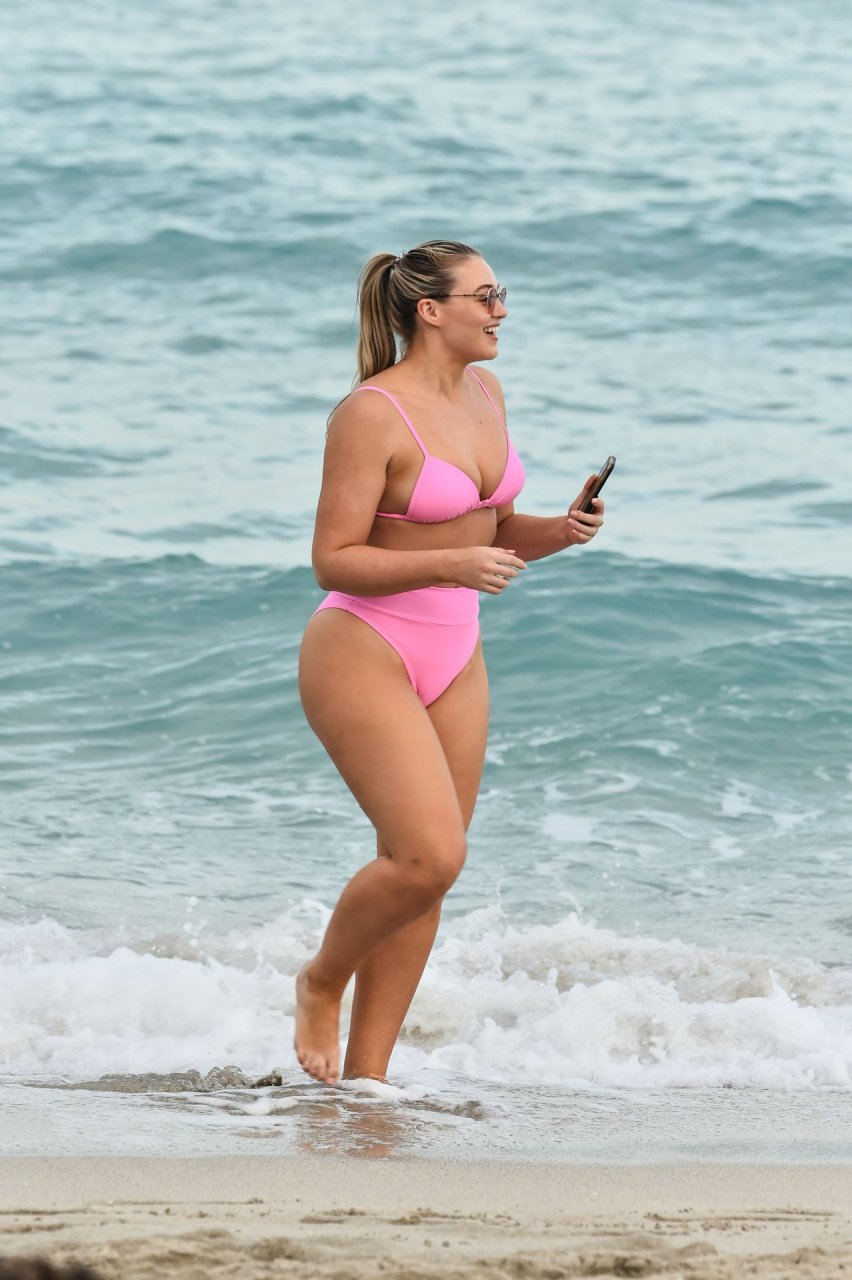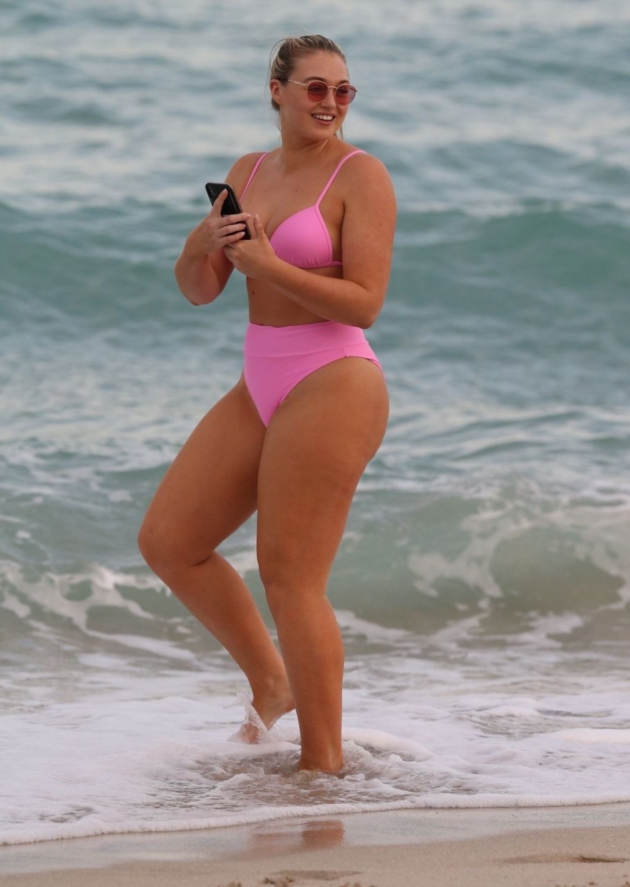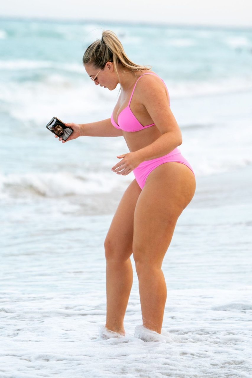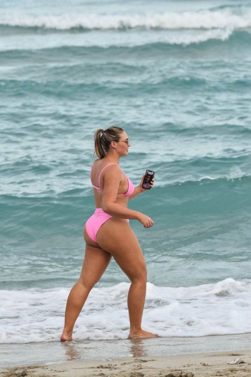 Le mannequin Iskra Lawrence met en valeur ses courbes à la plage dans un bikini rose à Miami, le 12/09/2018. Iskra est superbe alors qu’elle profite de sa journée à la plage.