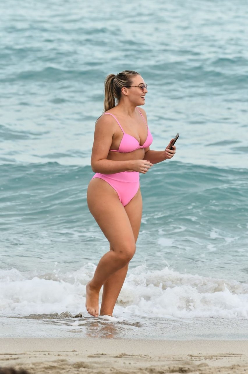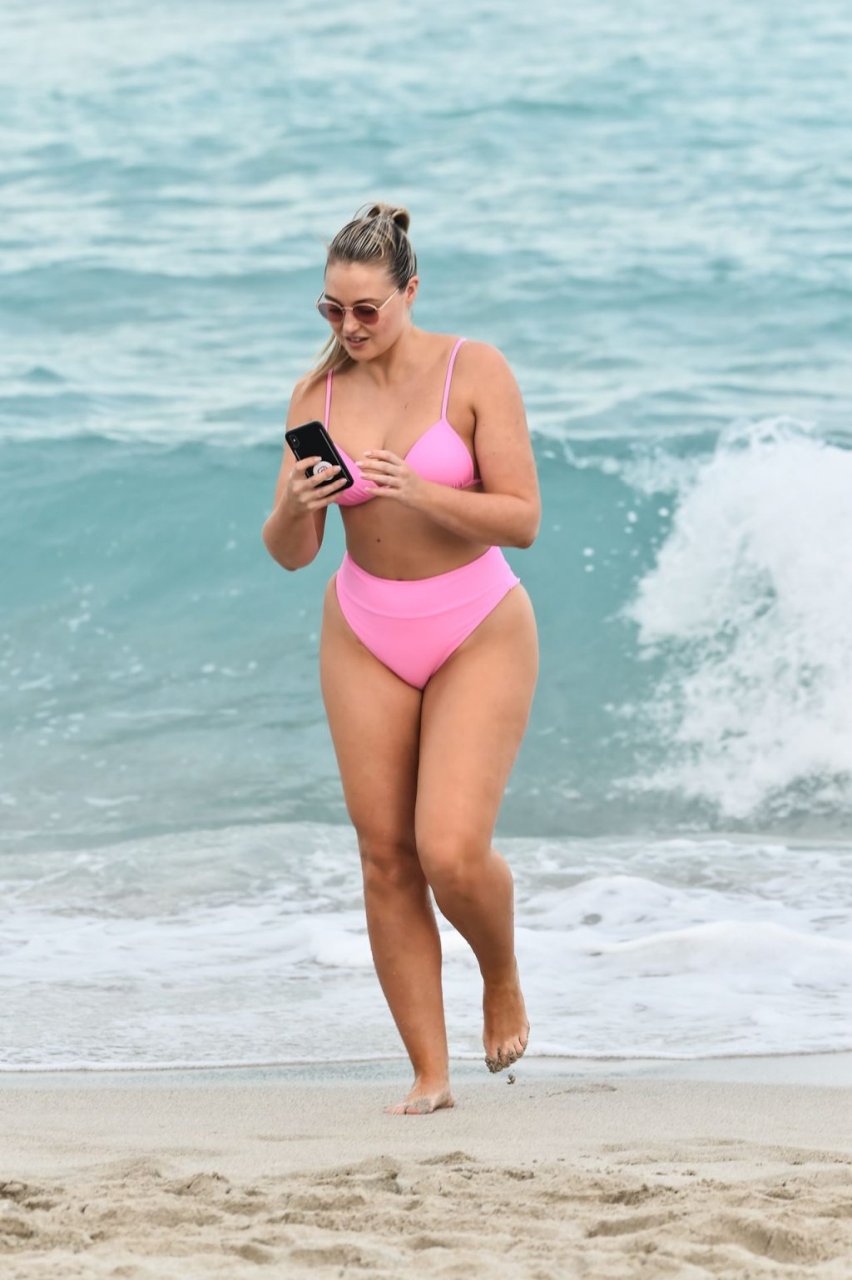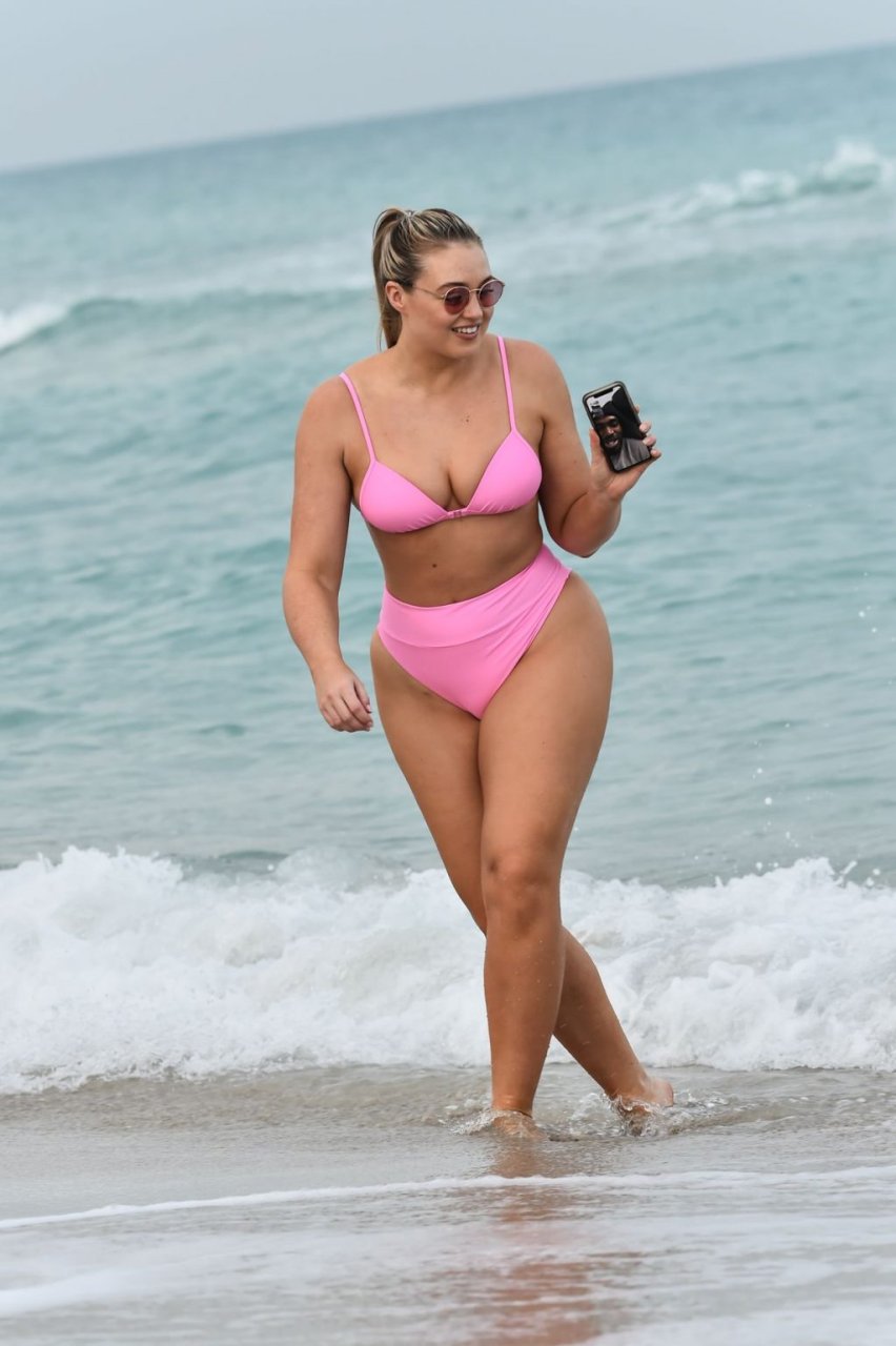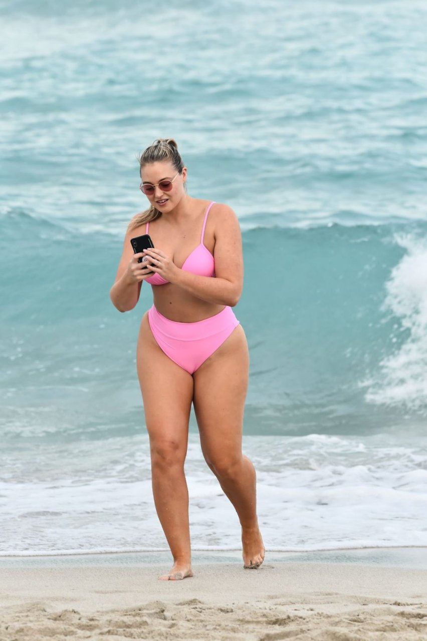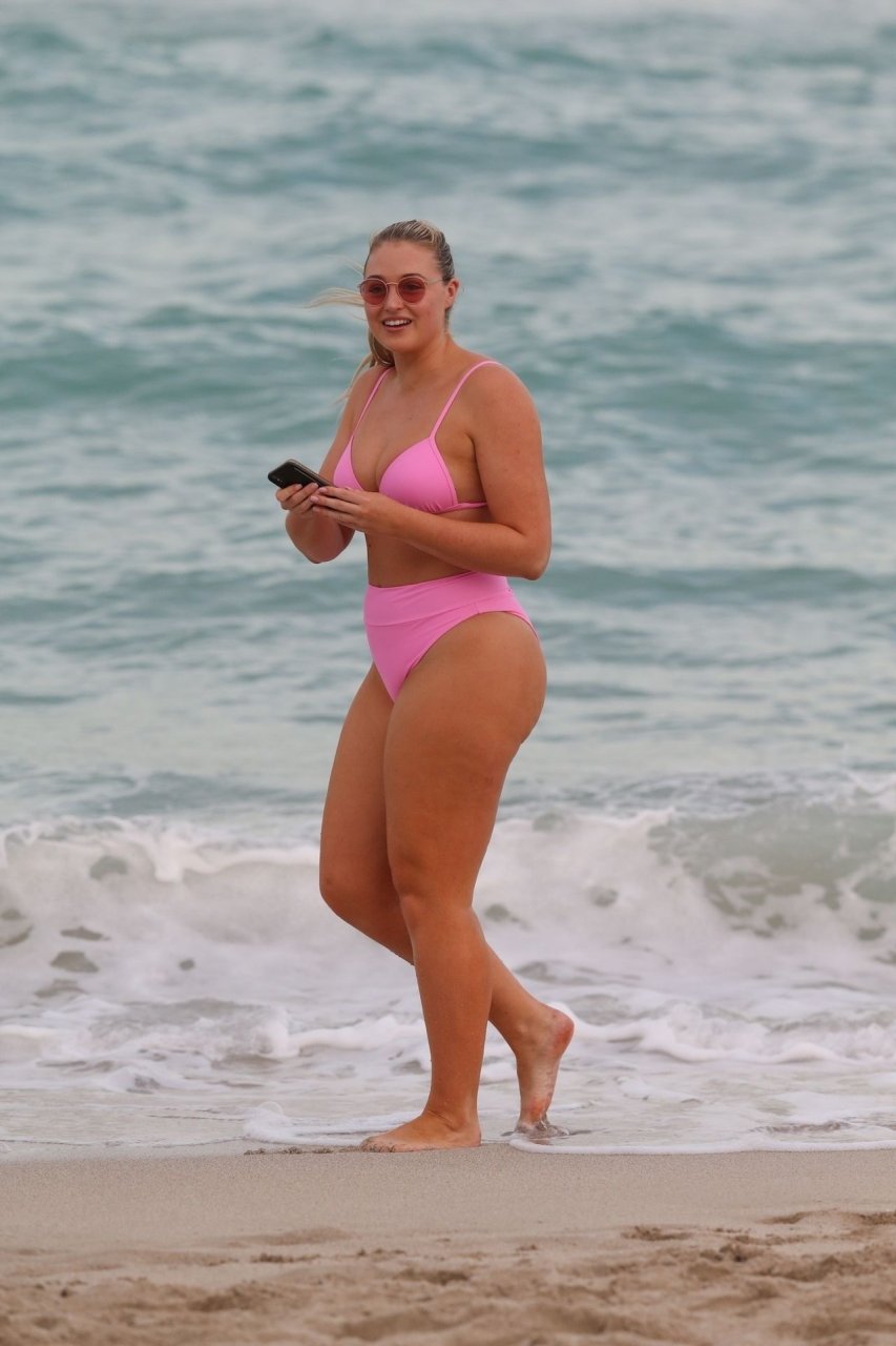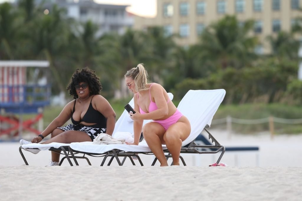 Le mannequin Iskra Lawrence met en valeur ses courbes à la plage dans un bikini rose à Miami, le 12/09/2018. Iskra est superbe alors qu’elle profite de sa journée à la plage.
