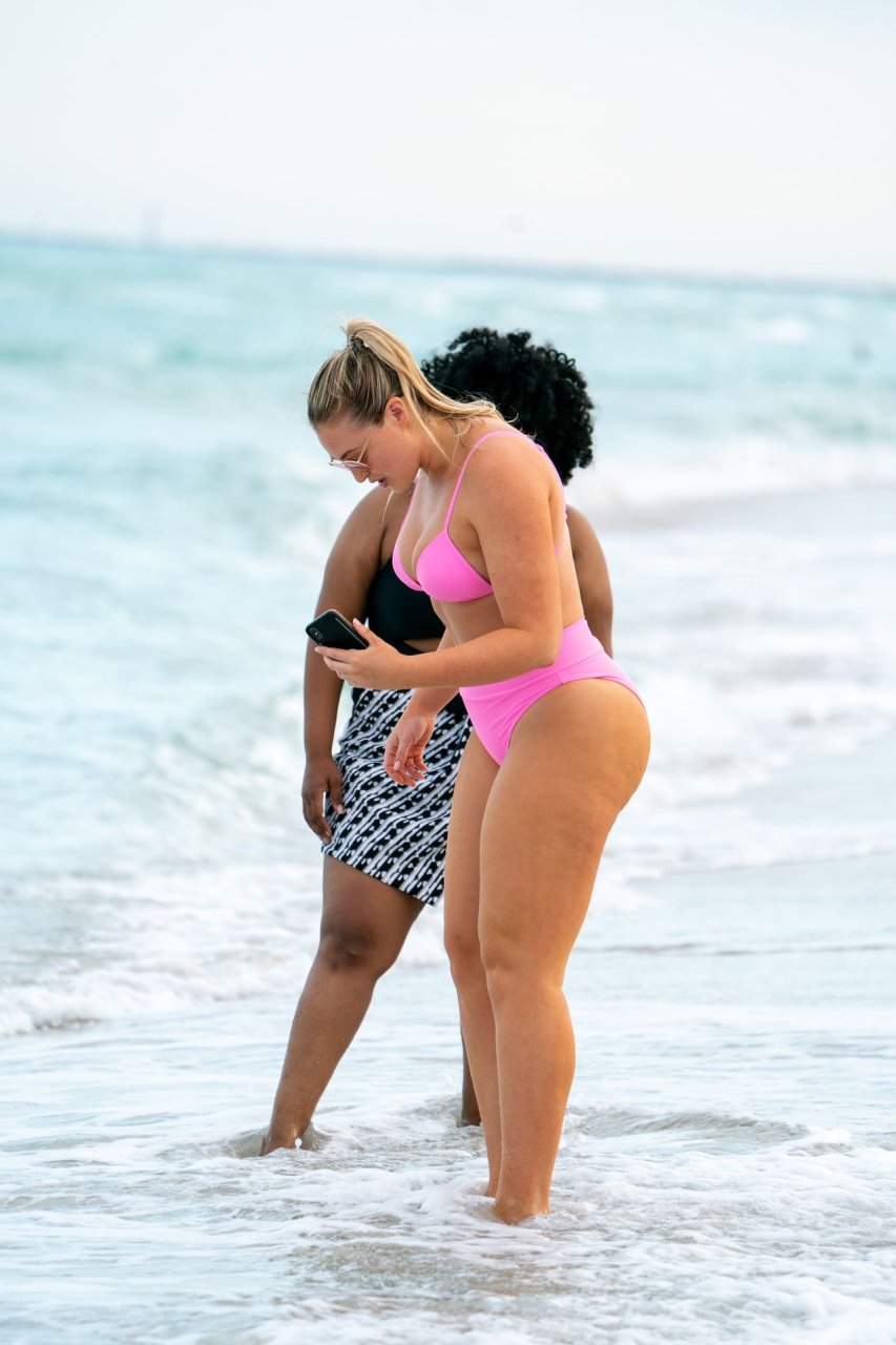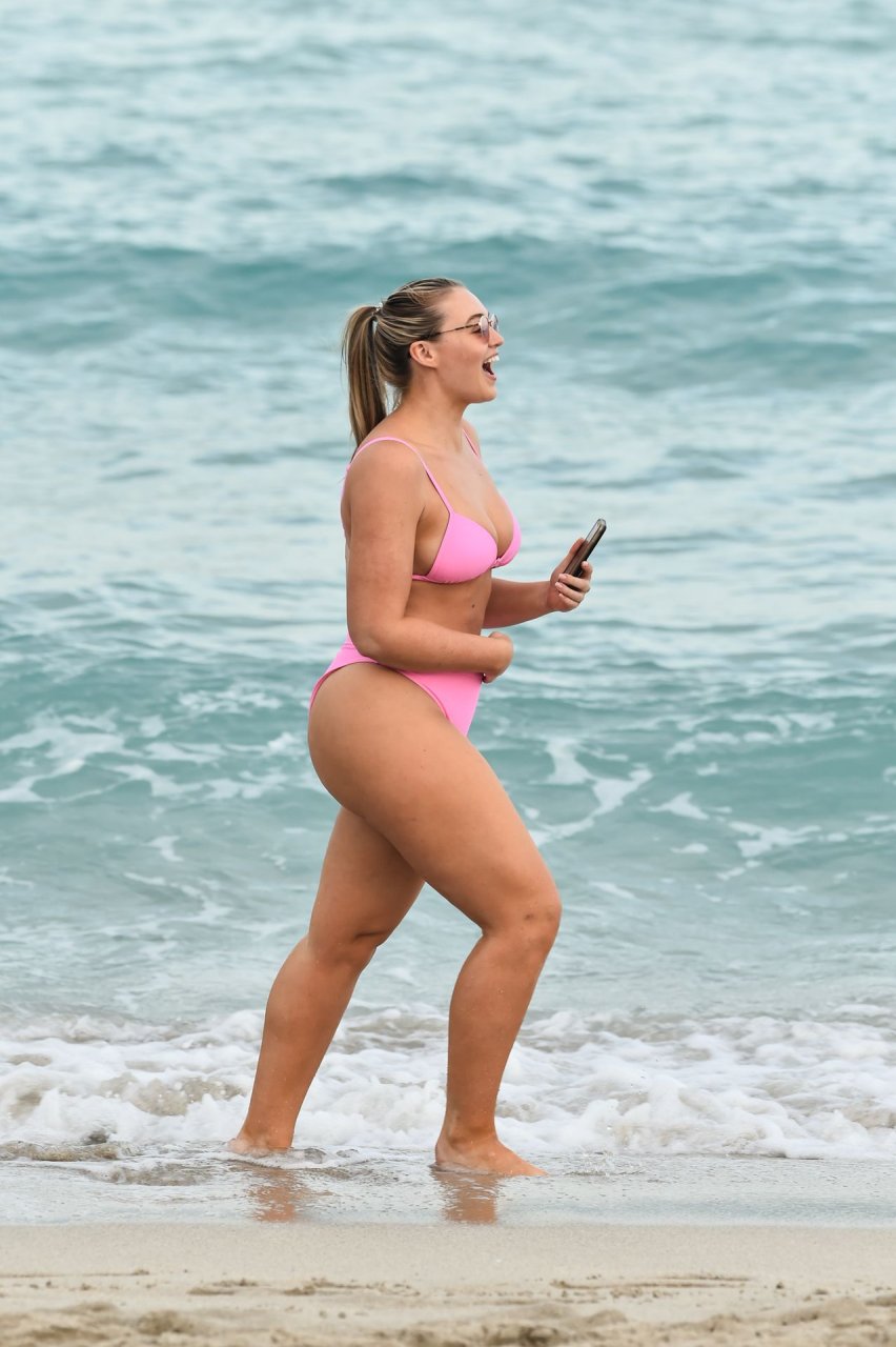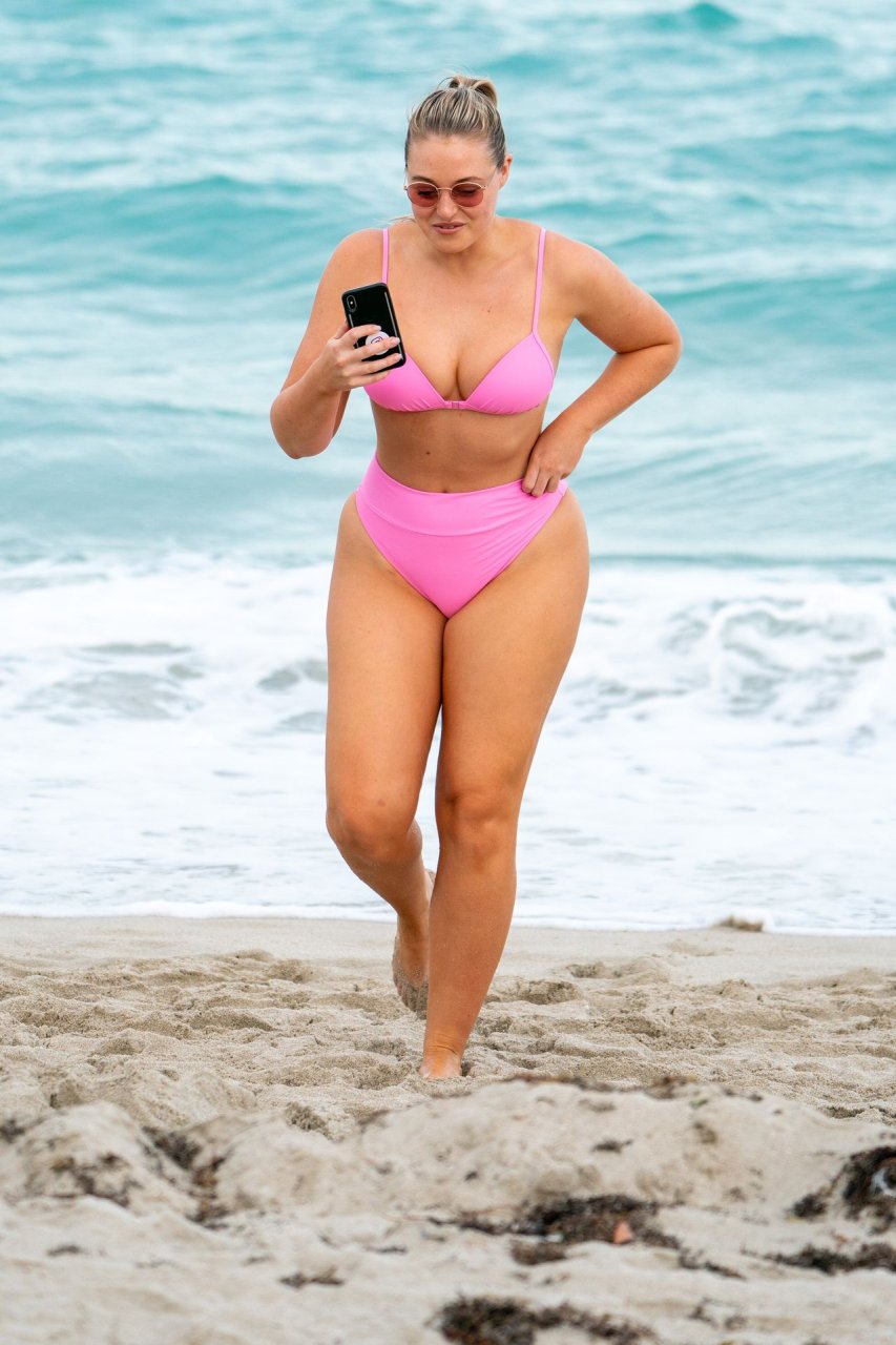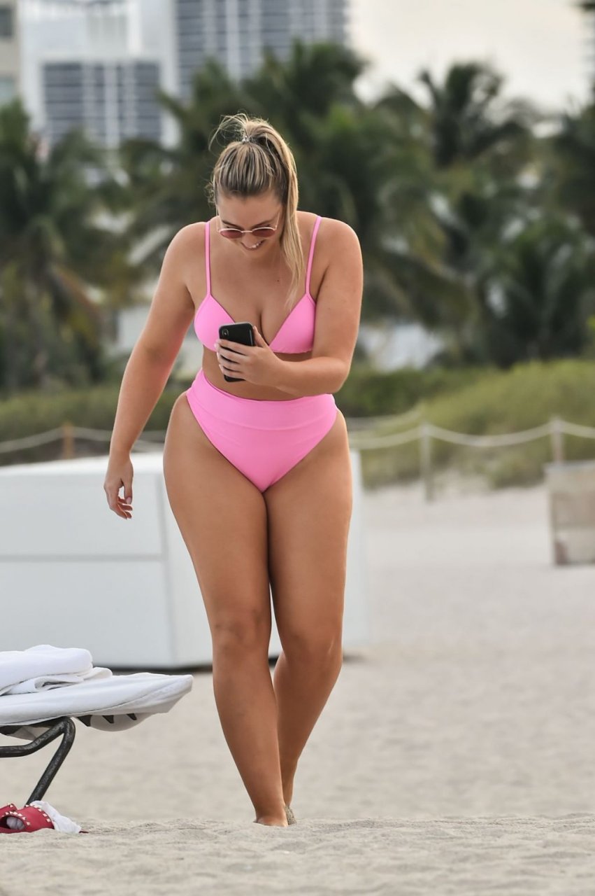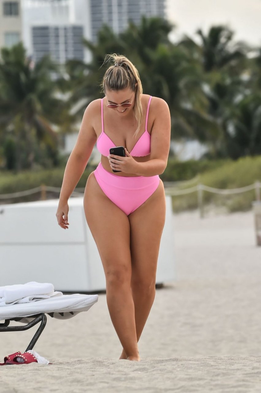 Le mannequin Iskra Lawrence met en valeur ses courbes à la plage dans un bikini rose à Miami, le 12/09/2018. Iskra est superbe alors qu’elle profite de sa journée à la plage.