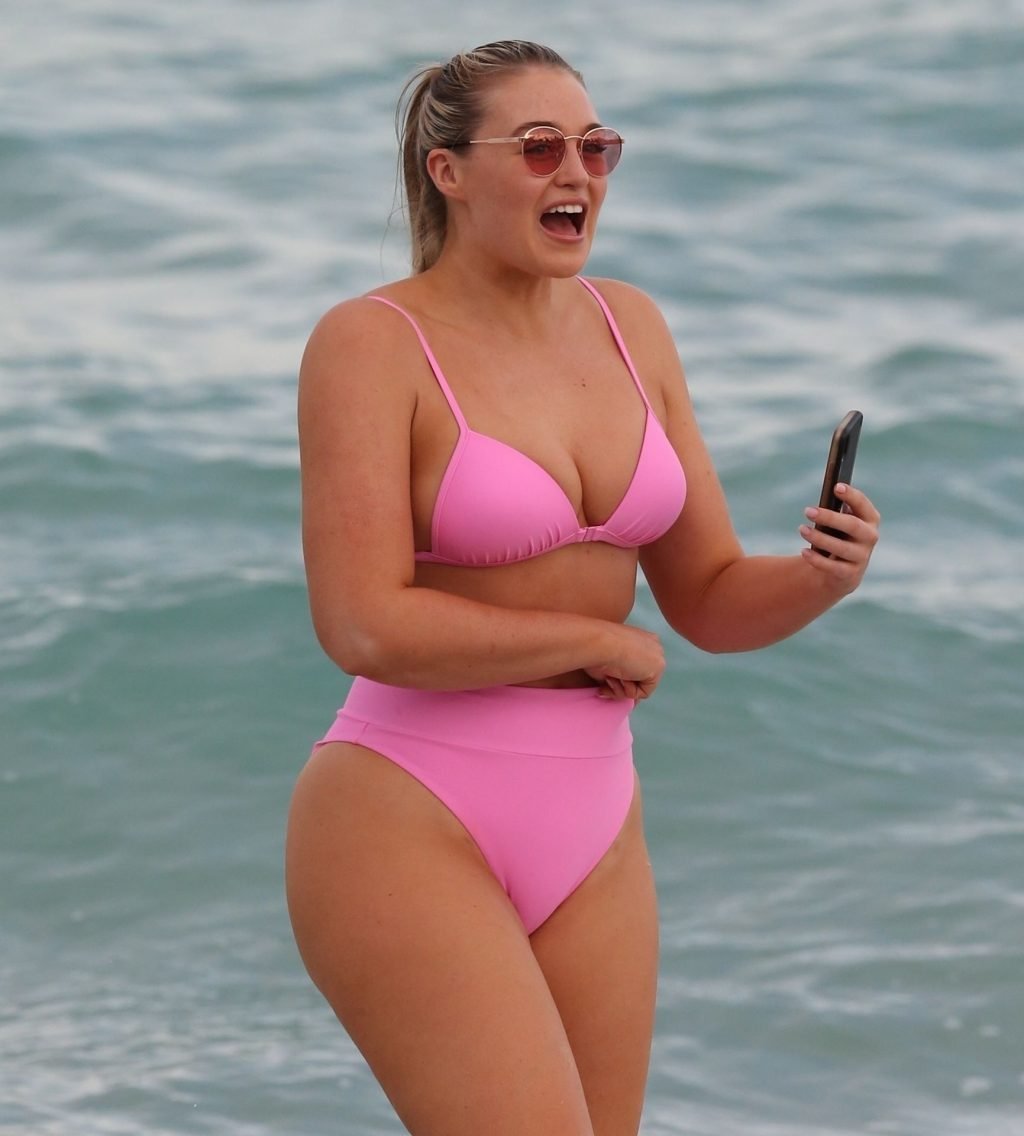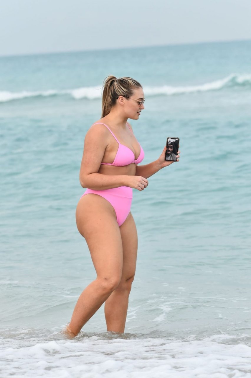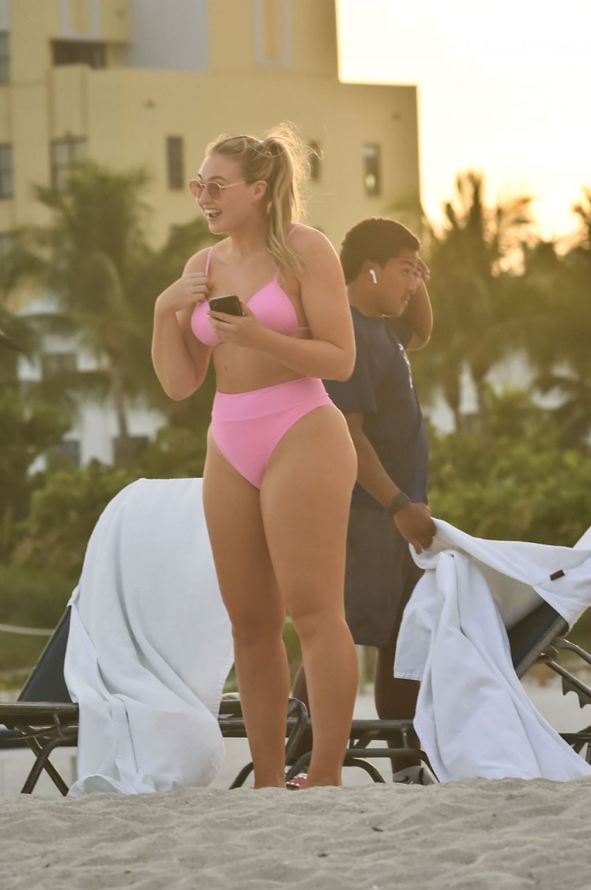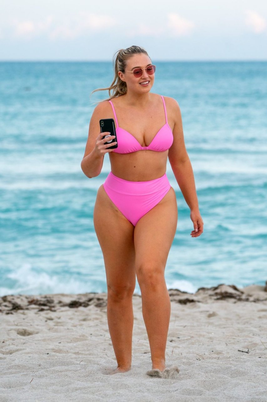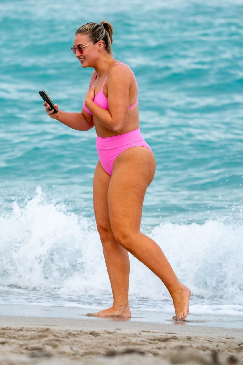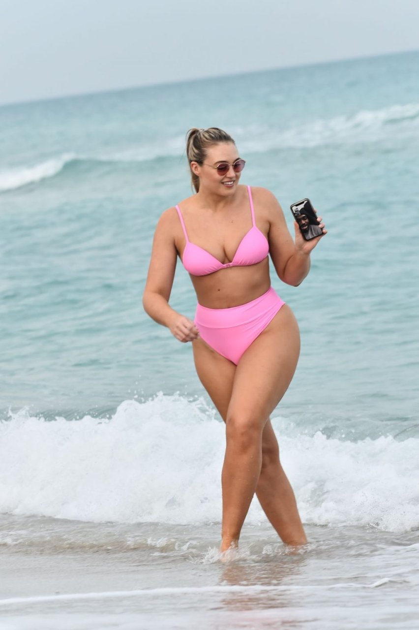 Le mannequin Iskra Lawrence met en valeur ses courbes à la plage dans un bikini rose à Miami, le 12/09/2018. Iskra est superbe alors qu’elle profite de sa journée à la plage.