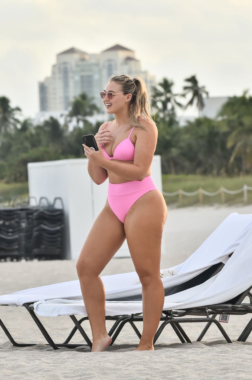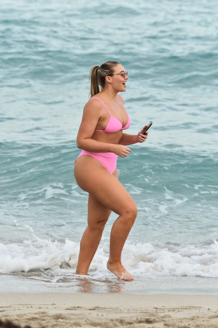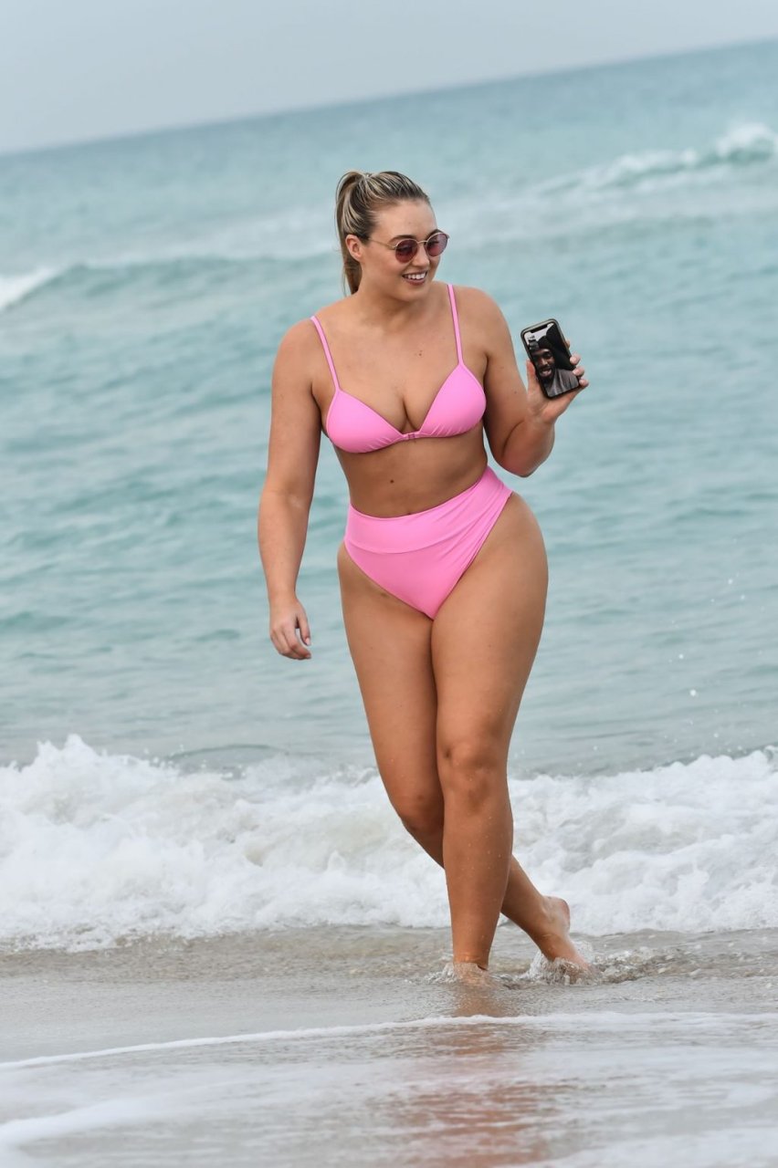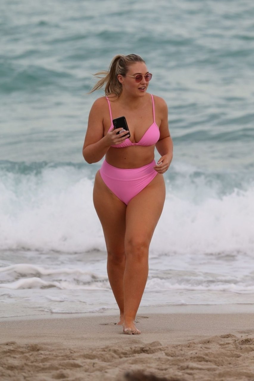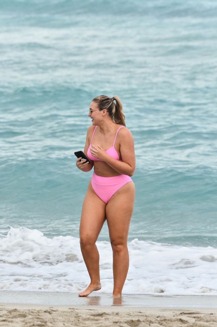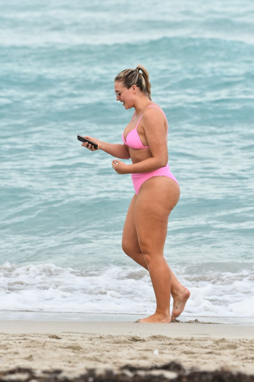 Le mannequin Iskra Lawrence met en valeur ses courbes à la plage dans un bikini rose à Miami, le 12/09/2018. Iskra est superbe alors qu’elle profite de sa journée à la plage.