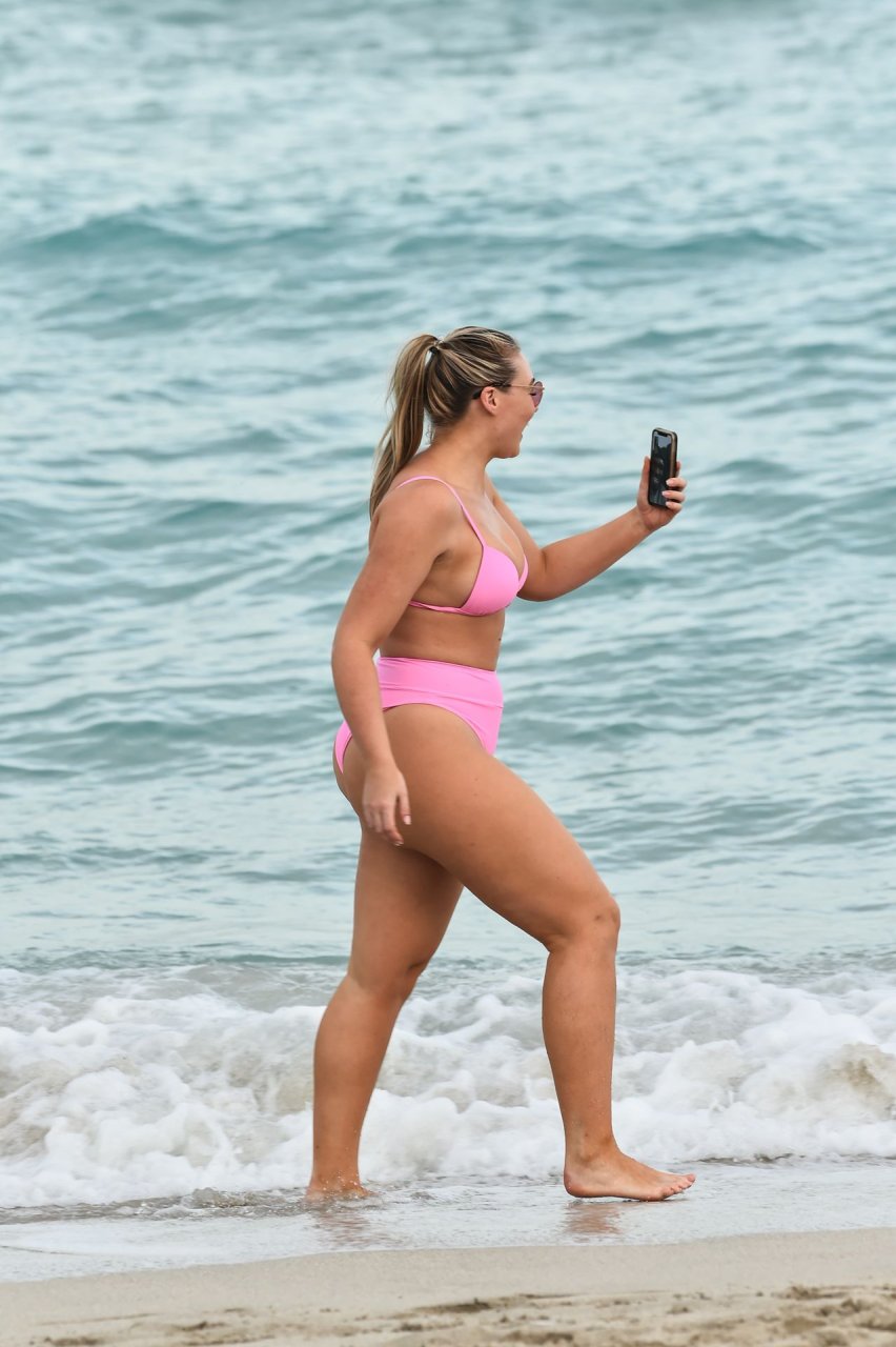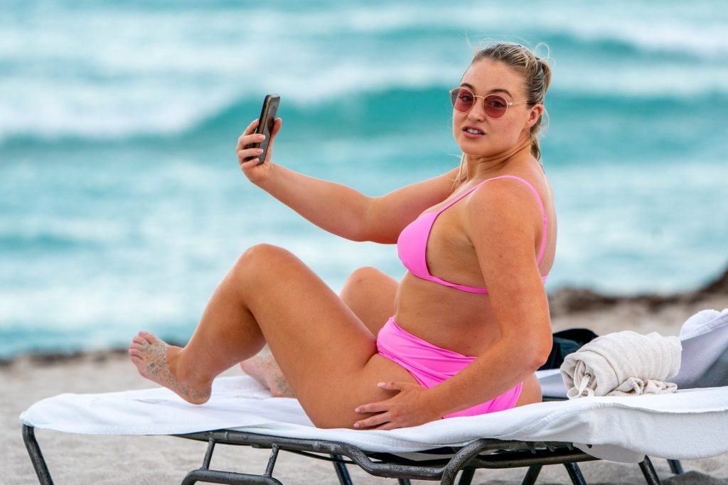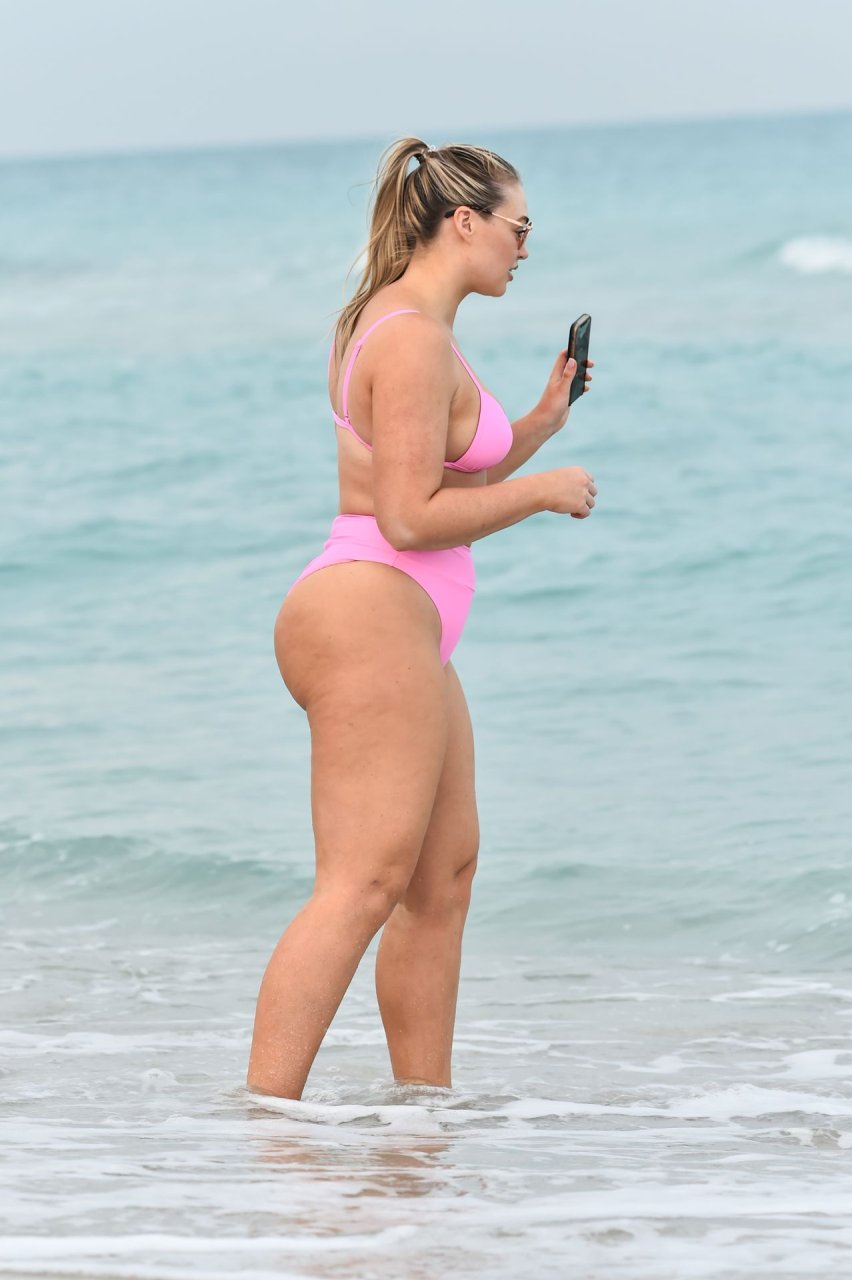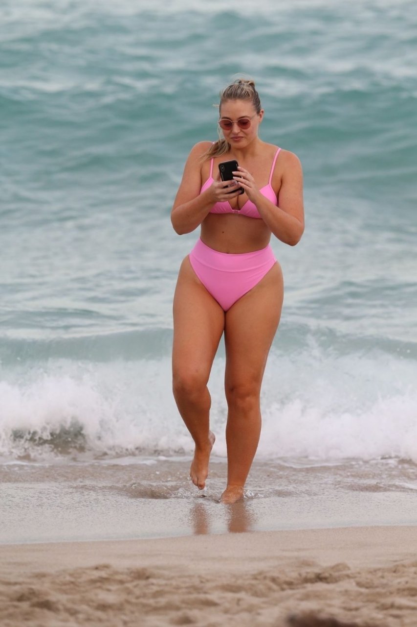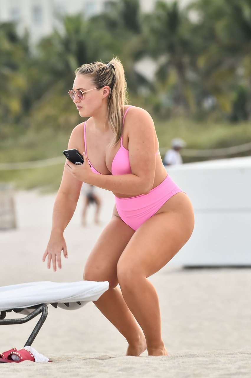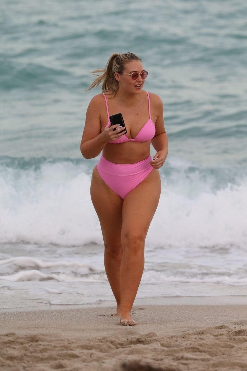 Le mannequin Iskra Lawrence met en valeur ses courbes à la plage dans un bikini rose à Miami, le 12/09/2018. Iskra est superbe alors qu’elle profite de sa journée à la plage.