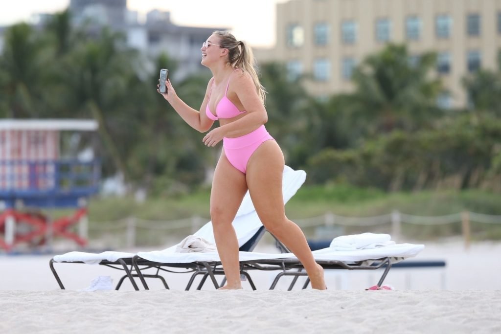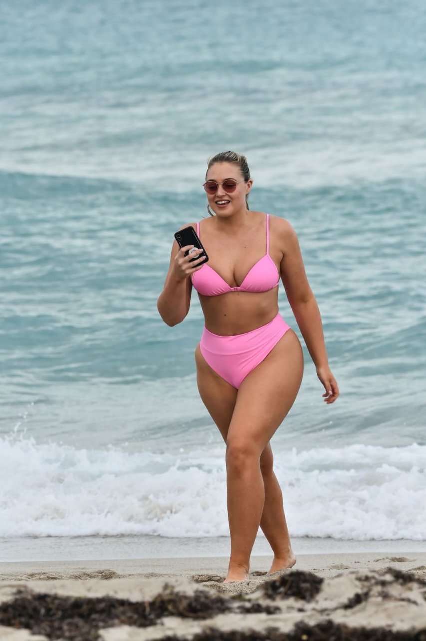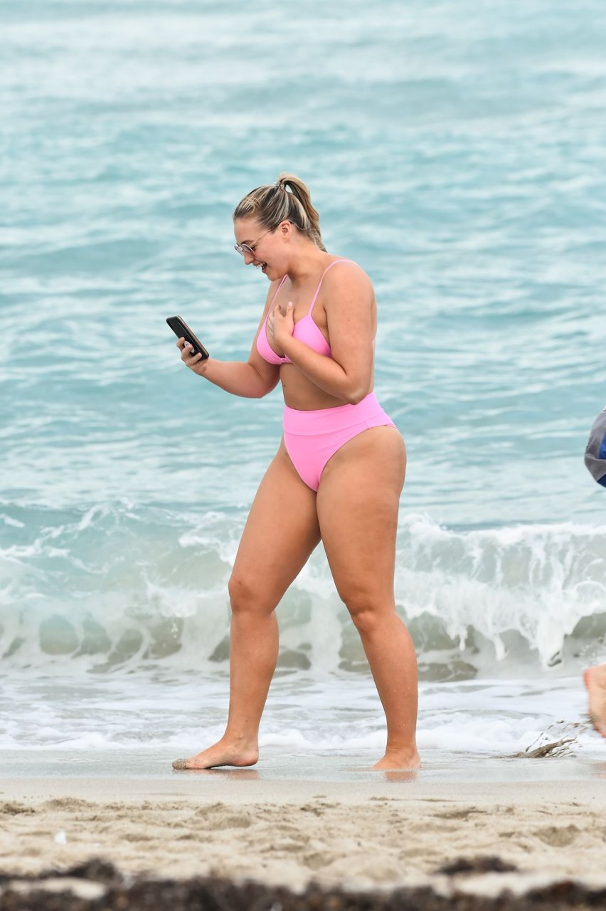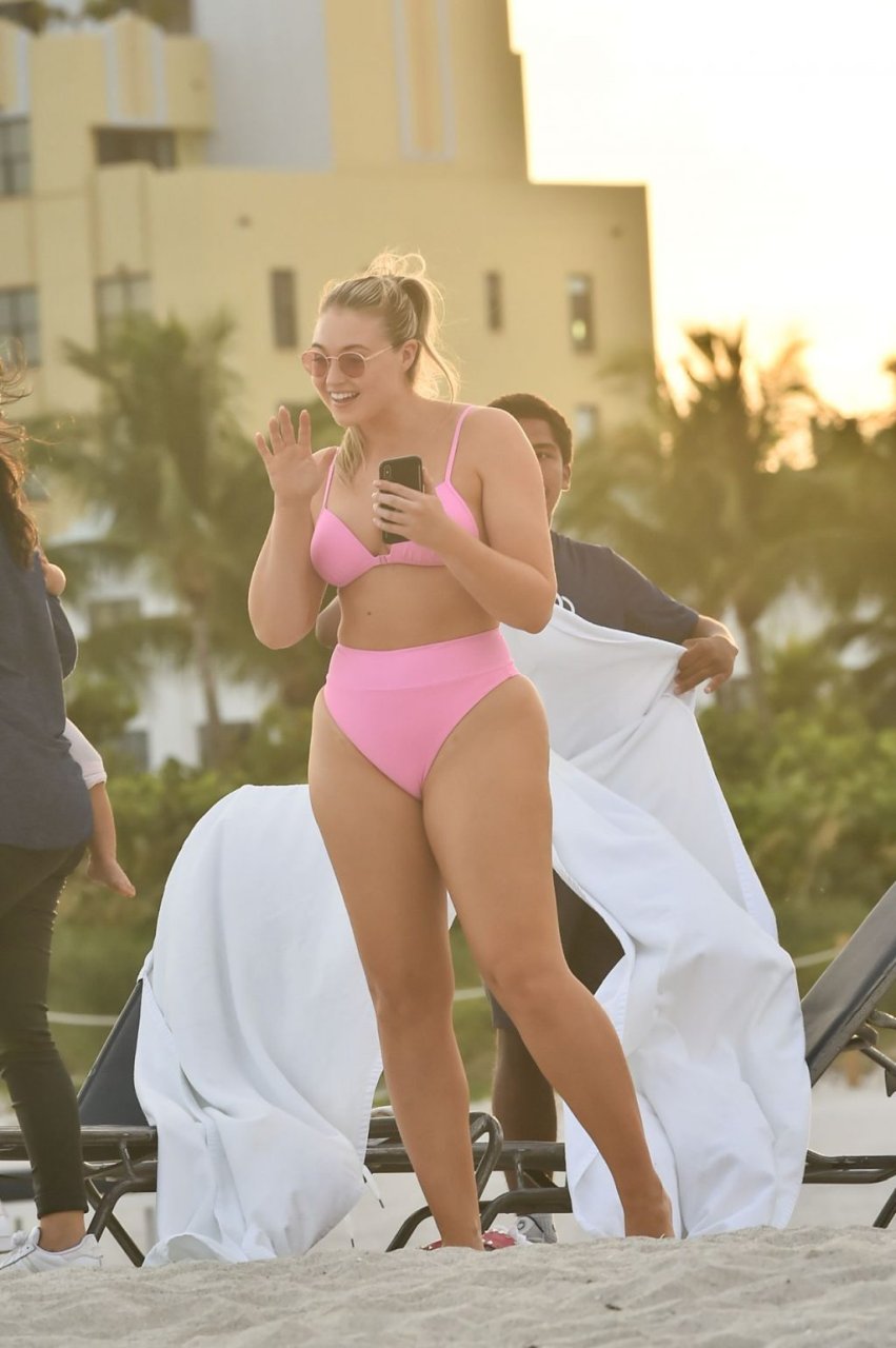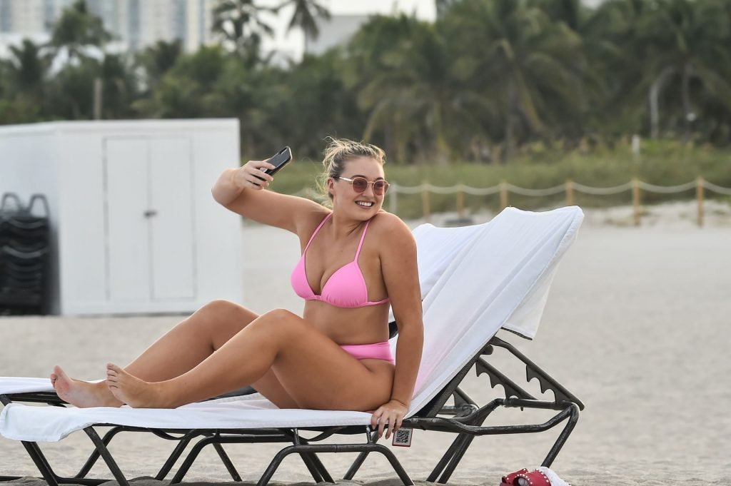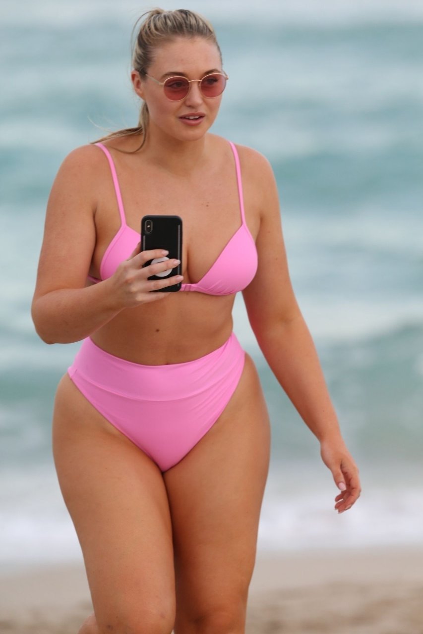 Le mannequin Iskra Lawrence met en valeur ses courbes à la plage dans un bikini rose à Miami, le 12/09/2018. Iskra est superbe alors qu’elle profite de sa journée à la plage.