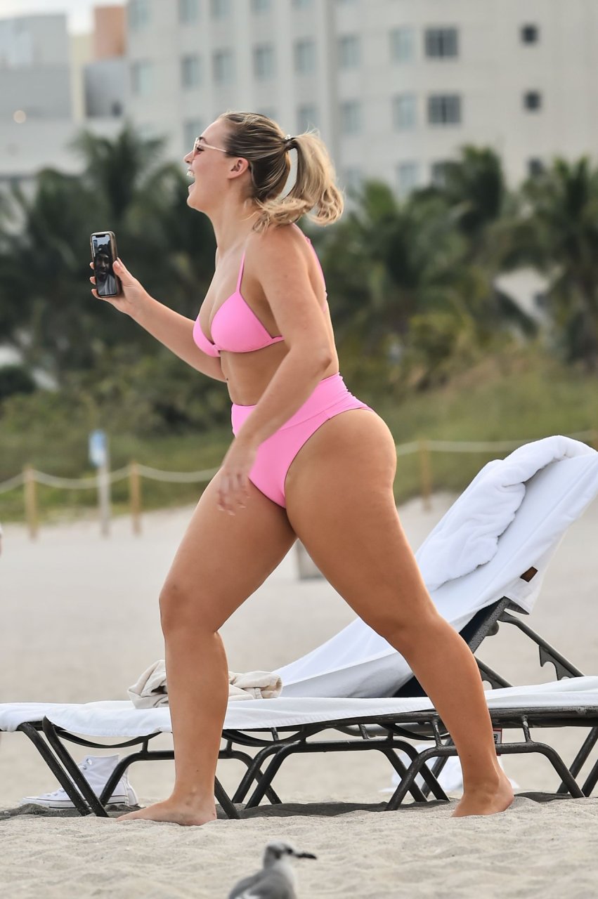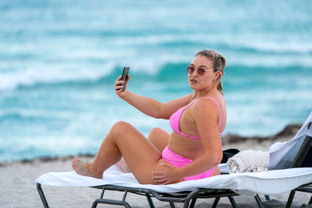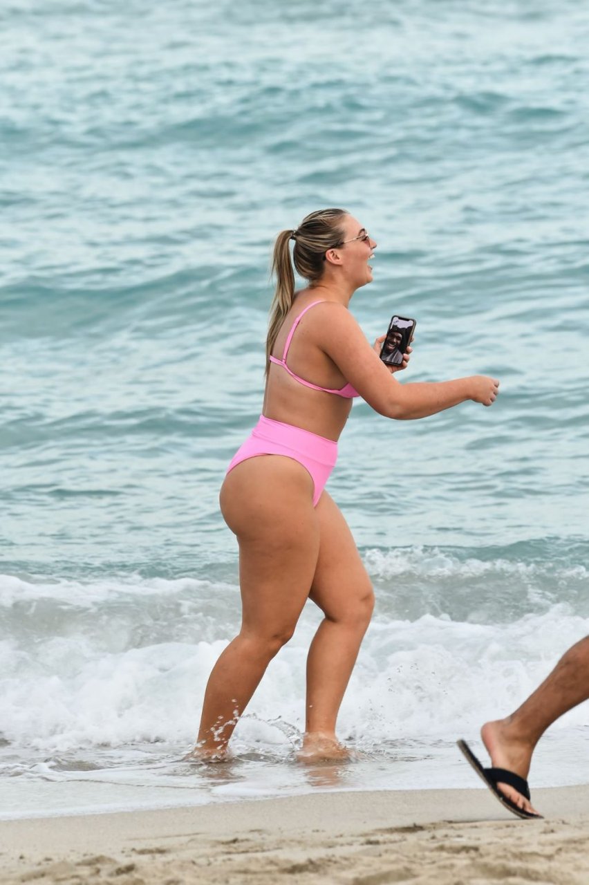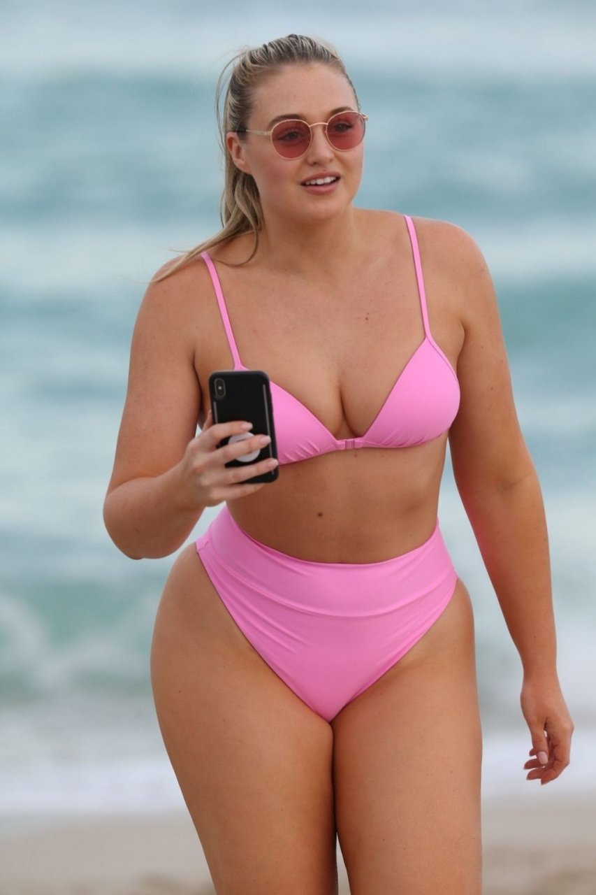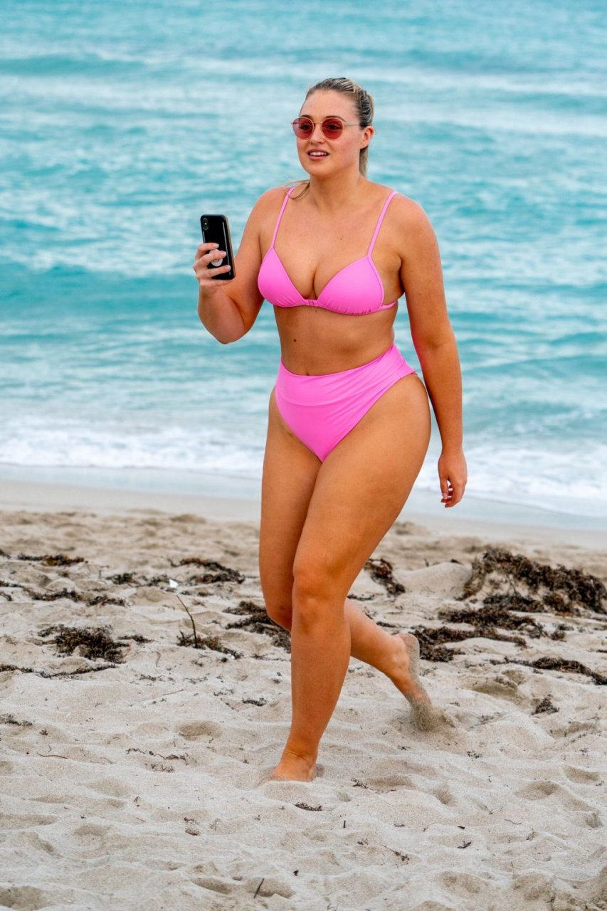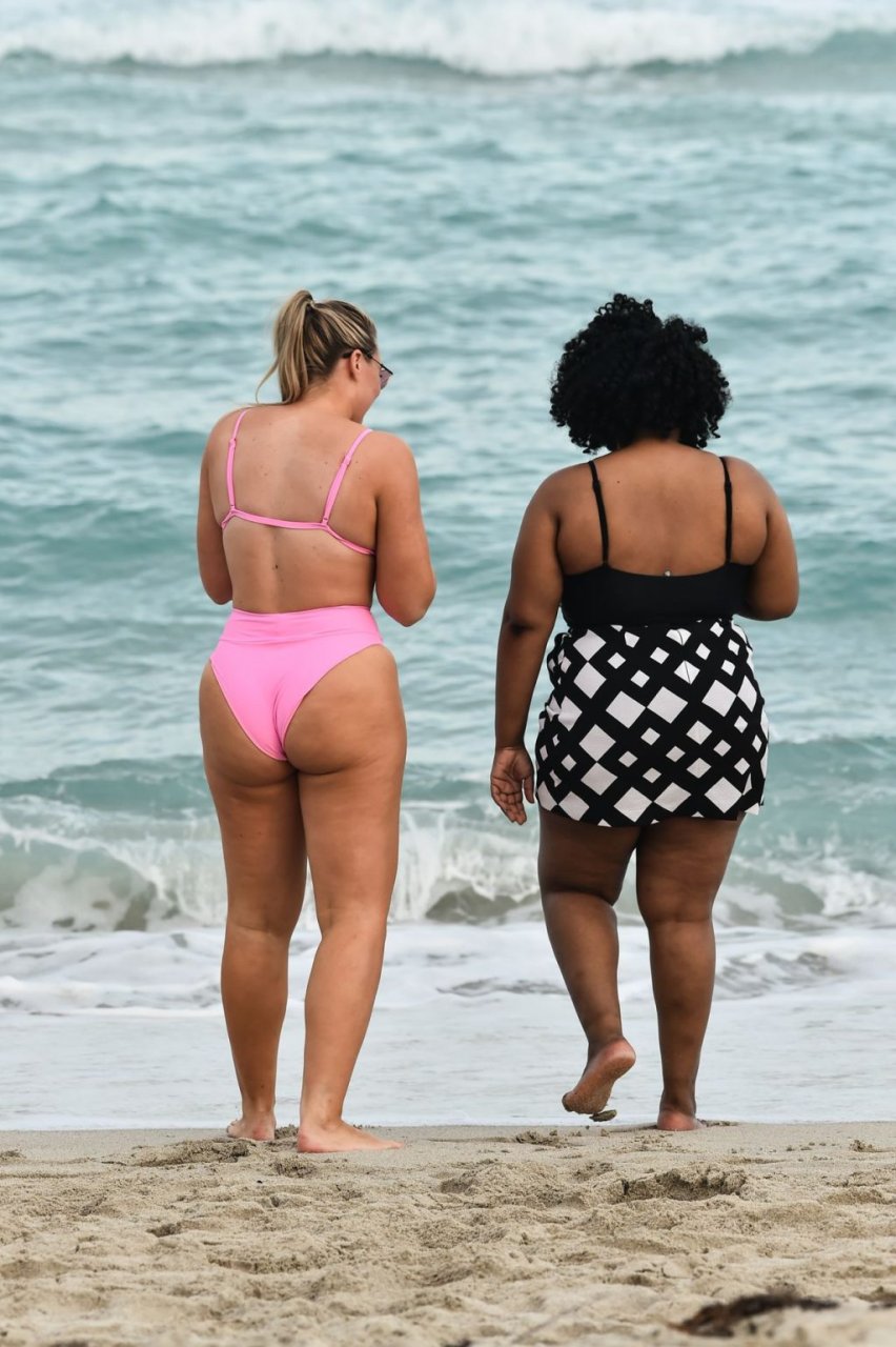 Le mannequin Iskra Lawrence met en valeur ses courbes à la plage dans un bikini rose à Miami, le 12/09/2018. Iskra est superbe alors qu’elle profite de sa journée à la plage.