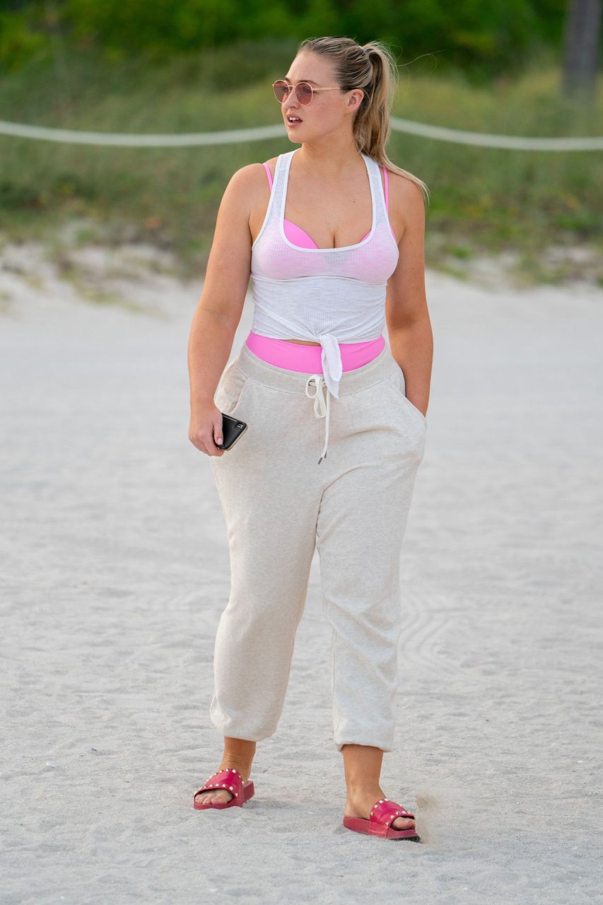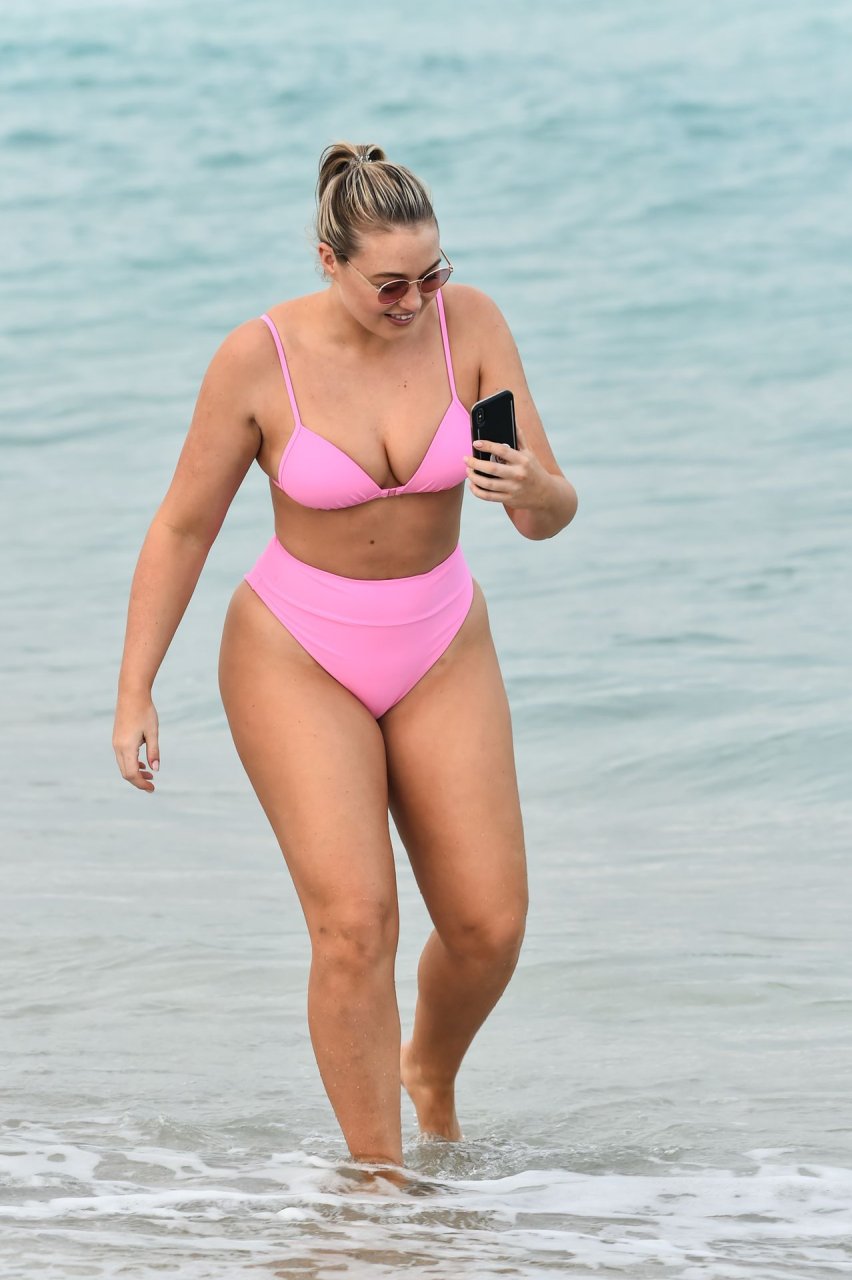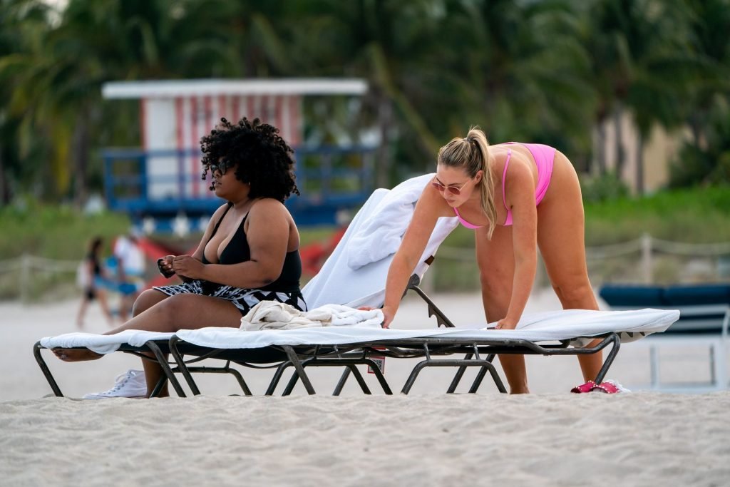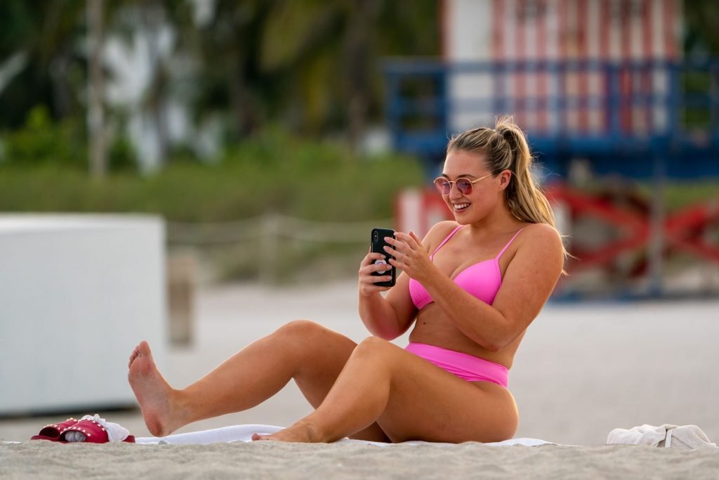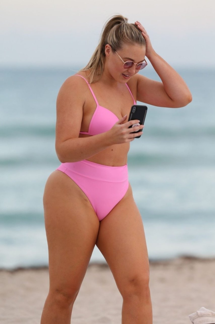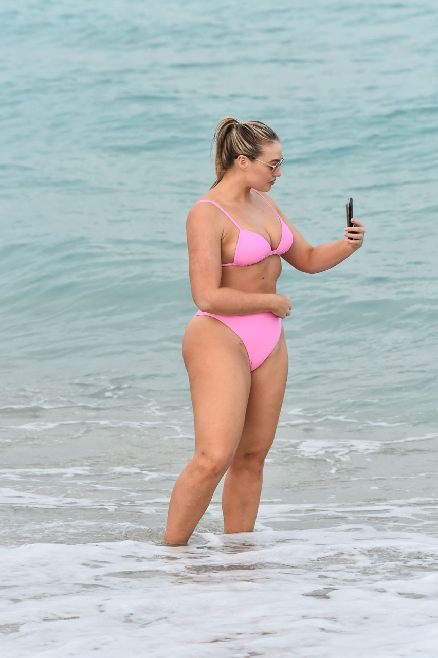 Le mannequin Iskra Lawrence met en valeur ses courbes à la plage dans un bikini rose à Miami, le 12/09/2018. Iskra est superbe alors qu’elle profite de sa journée à la plage.