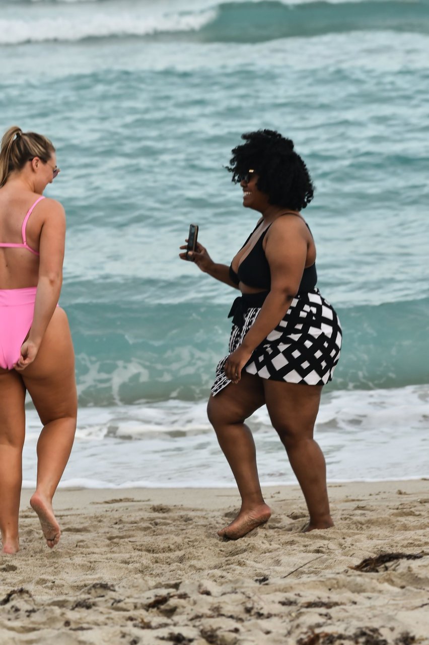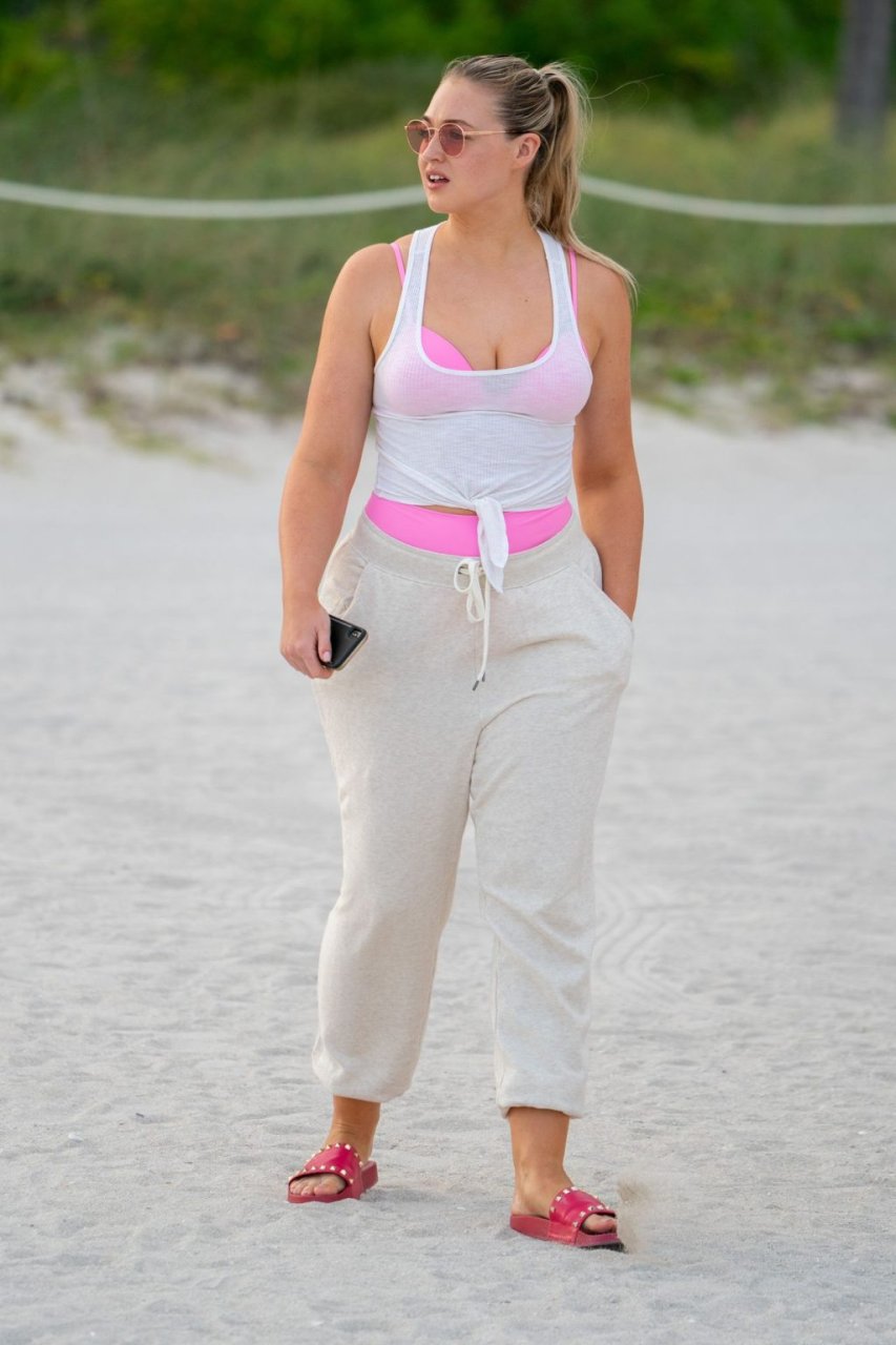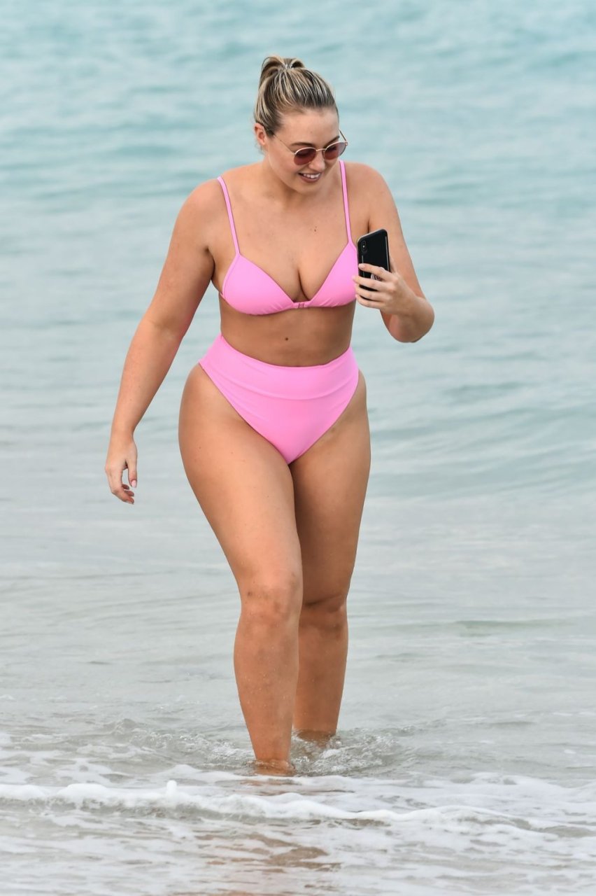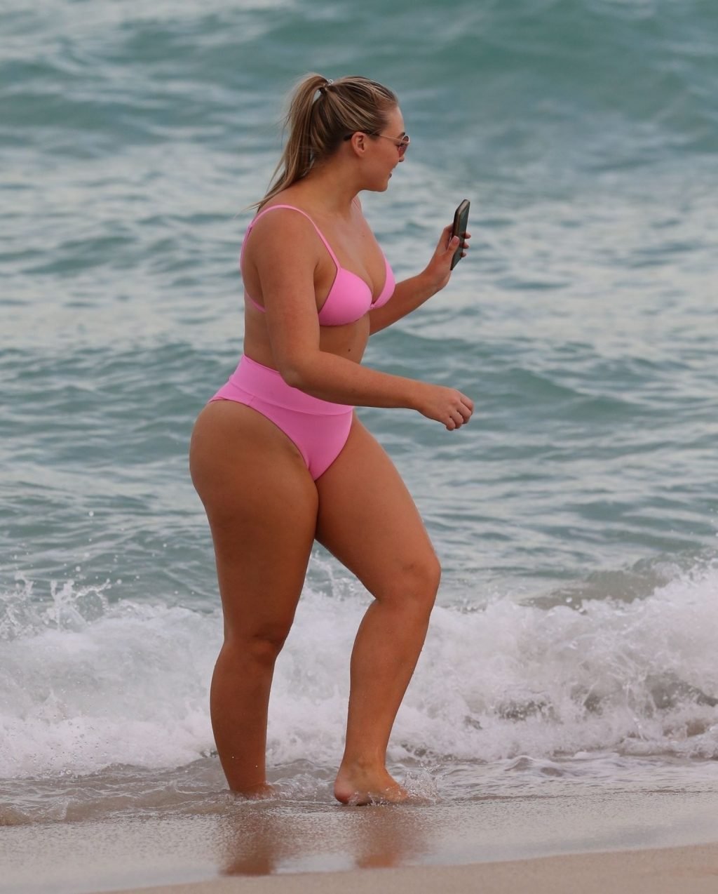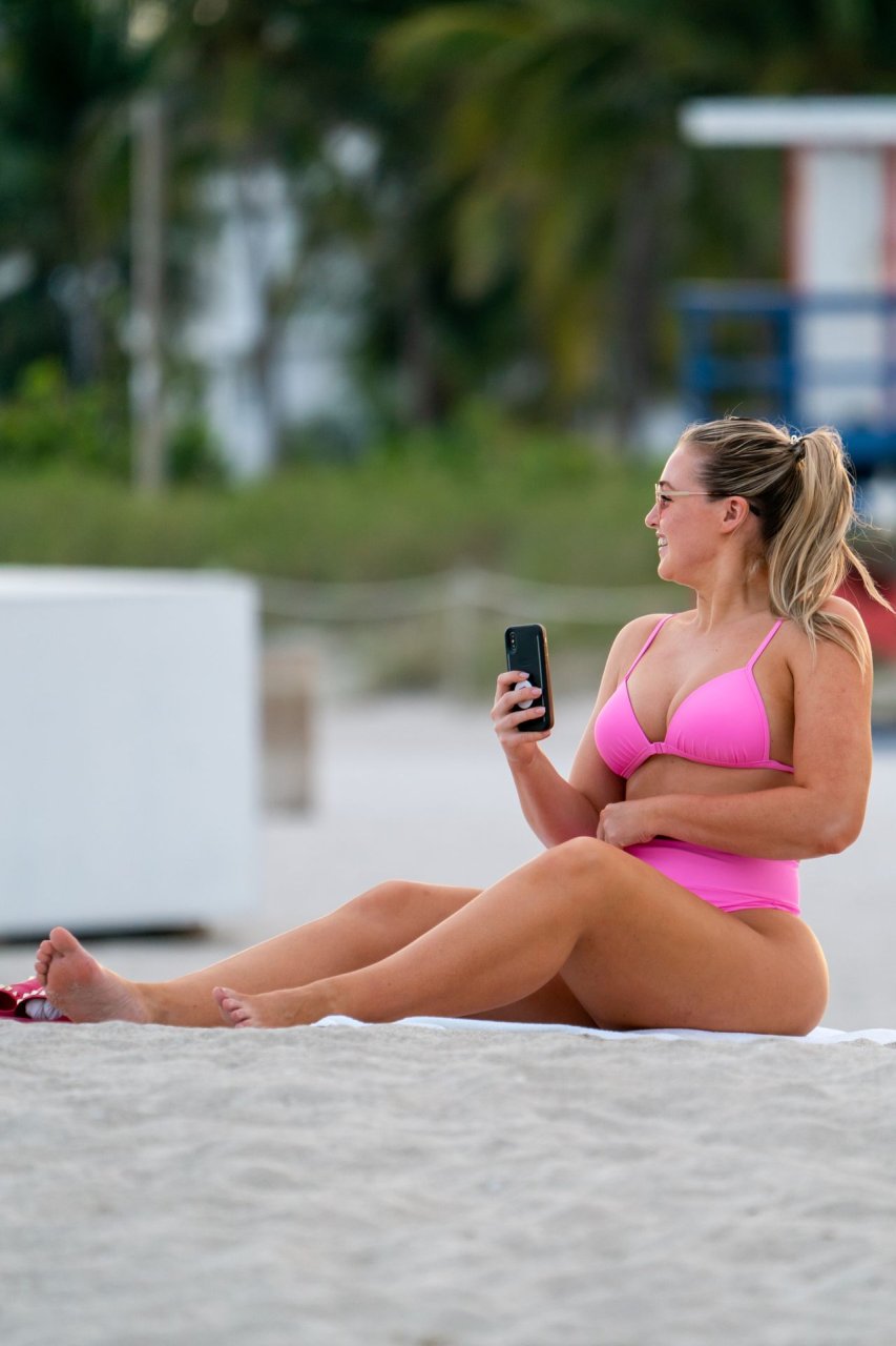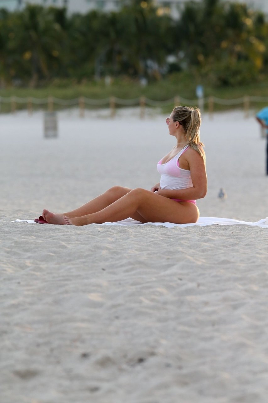 Le mannequin Iskra Lawrence met en valeur ses courbes à la plage dans un bikini rose à Miami, le 12/09/2018. Iskra est superbe alors qu’elle profite de sa journée à la plage.