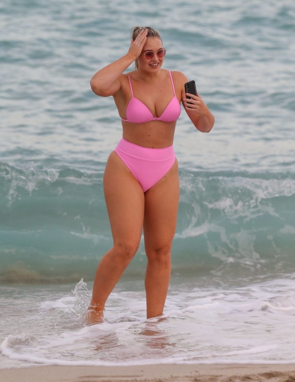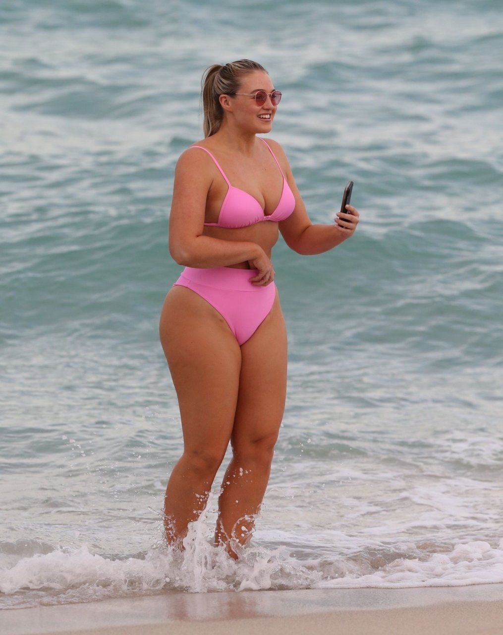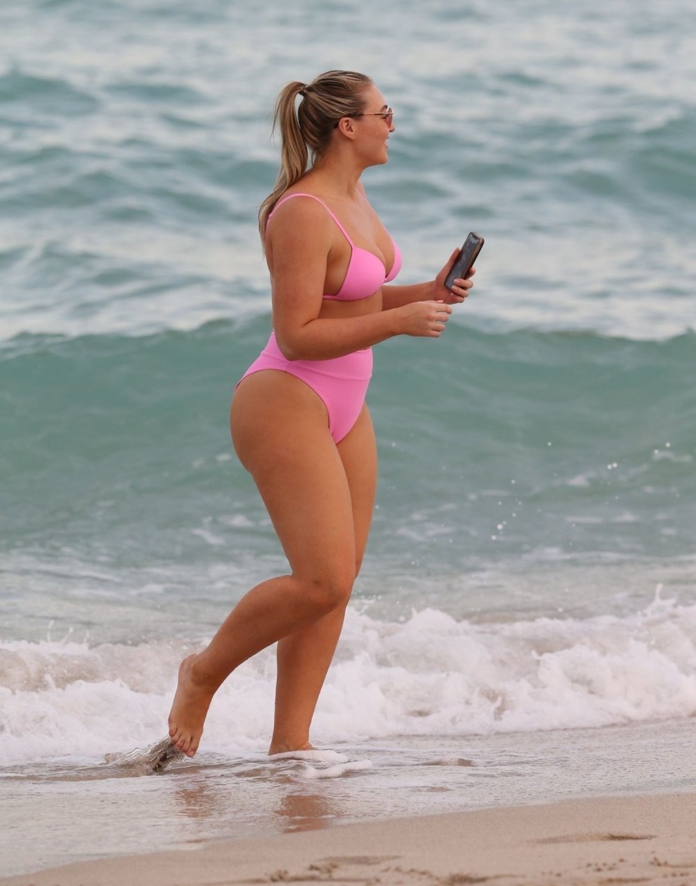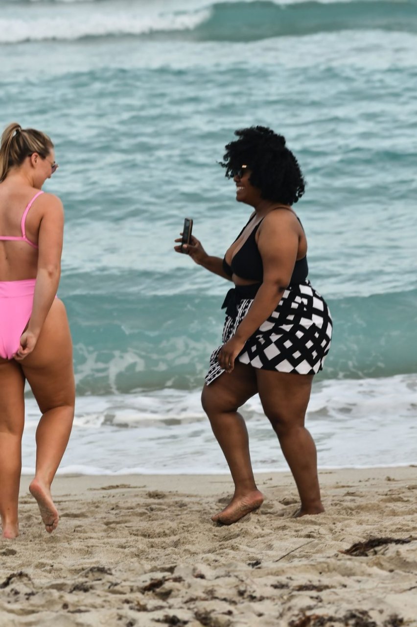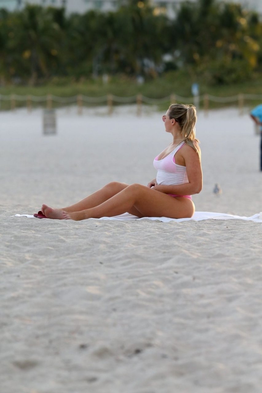 Le mannequin Iskra Lawrence met en valeur ses courbes à la plage dans un bikini rose à Miami, le 12/09/2018. Iskra est superbe alors qu’elle profite de sa journée à la plage.