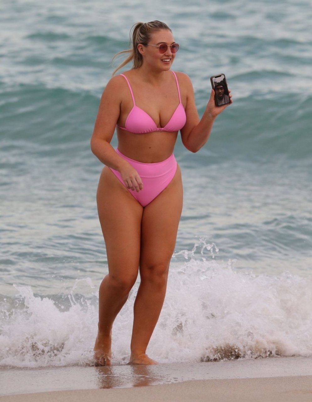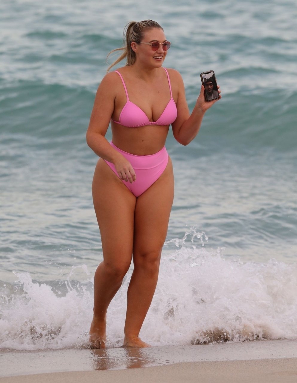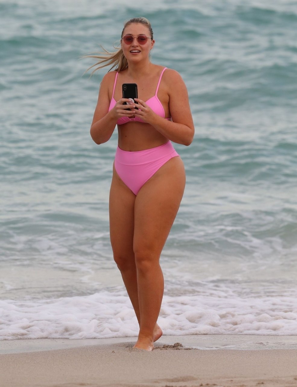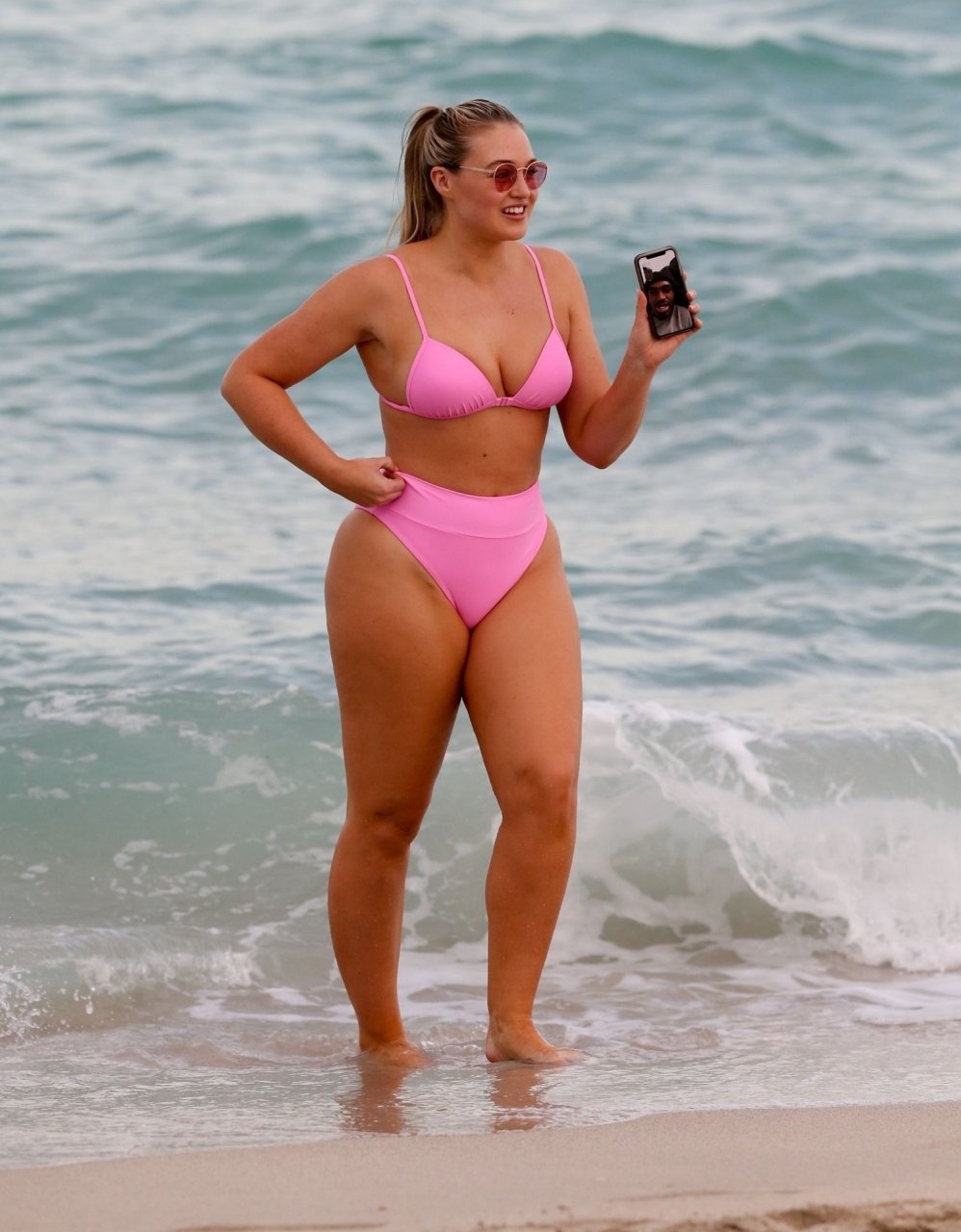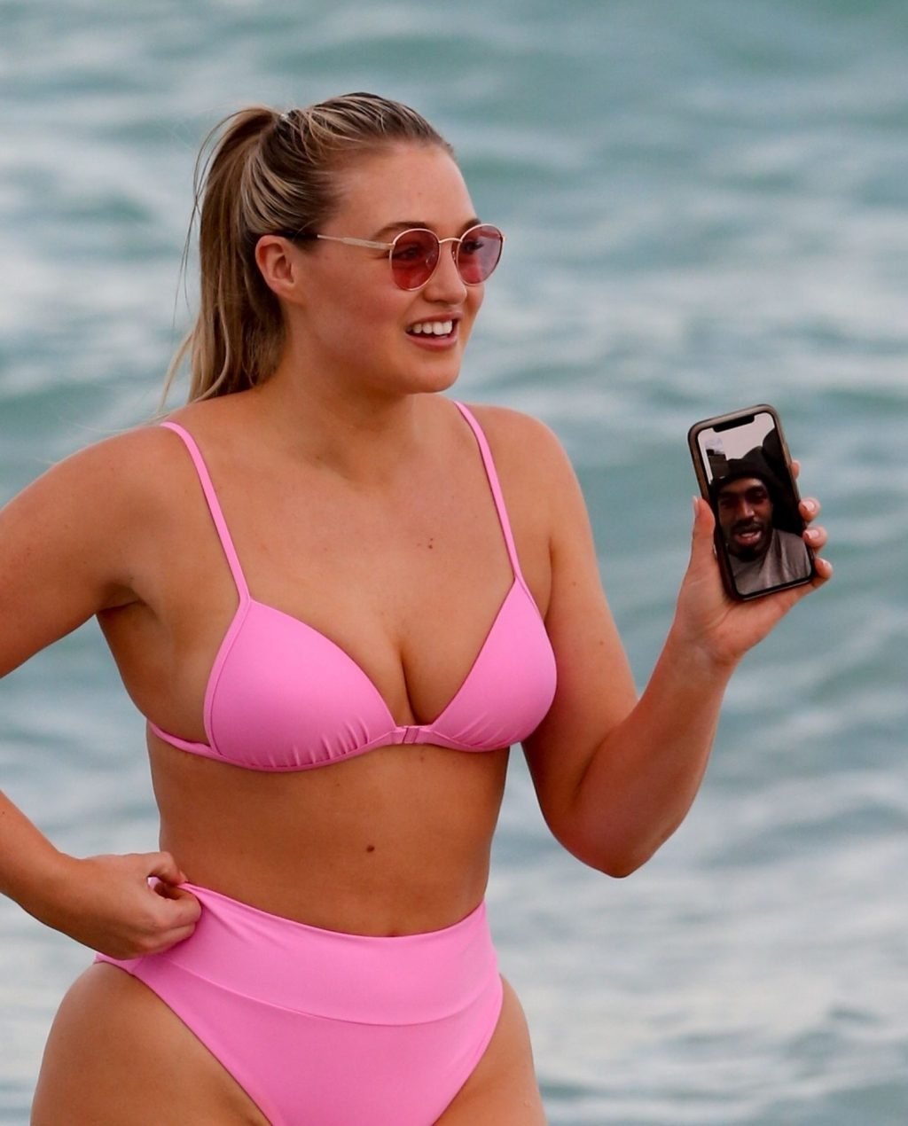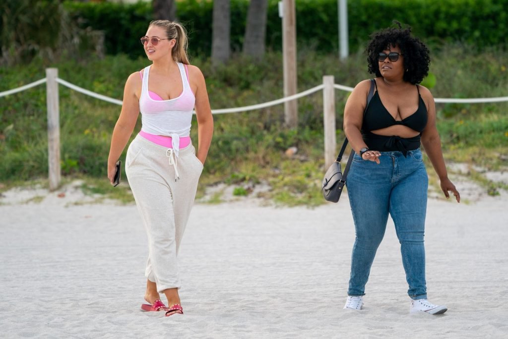 Le mannequin Iskra Lawrence met en valeur ses courbes à la plage dans un bikini rose à Miami, le 12/09/2018. Iskra est superbe alors qu’elle profite de sa journée à la plage.
