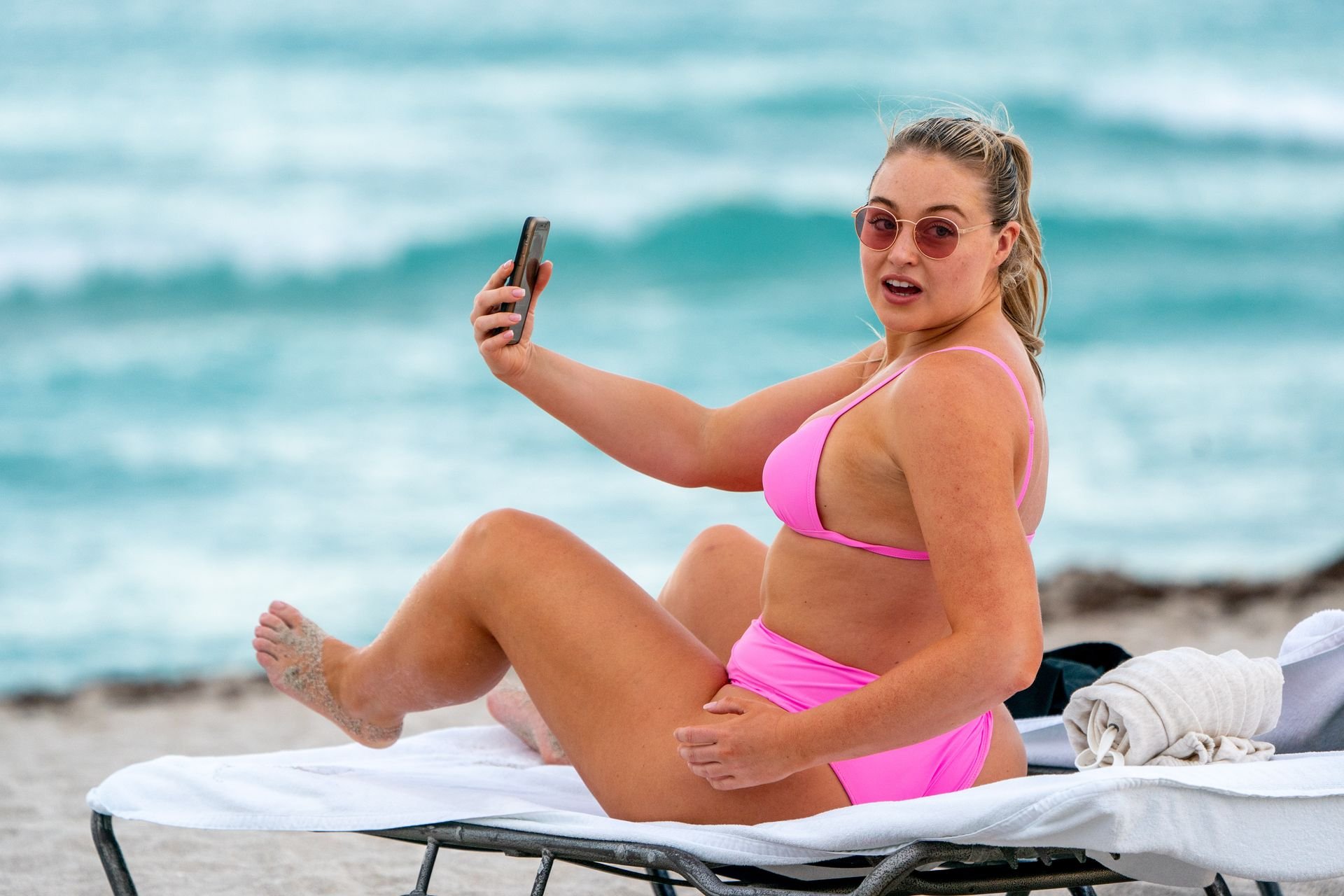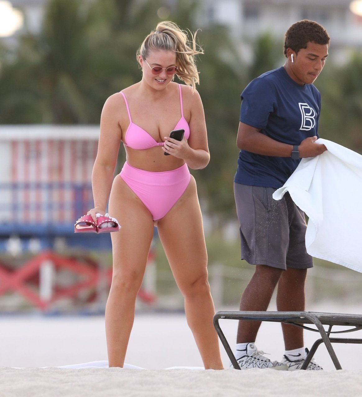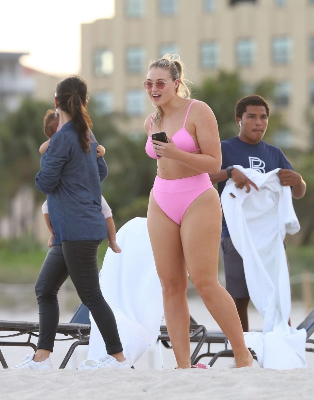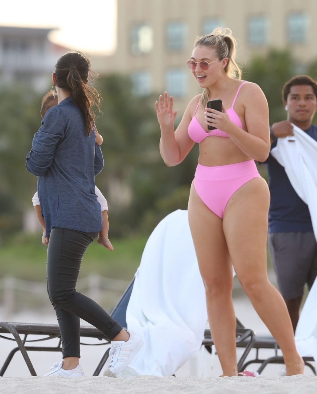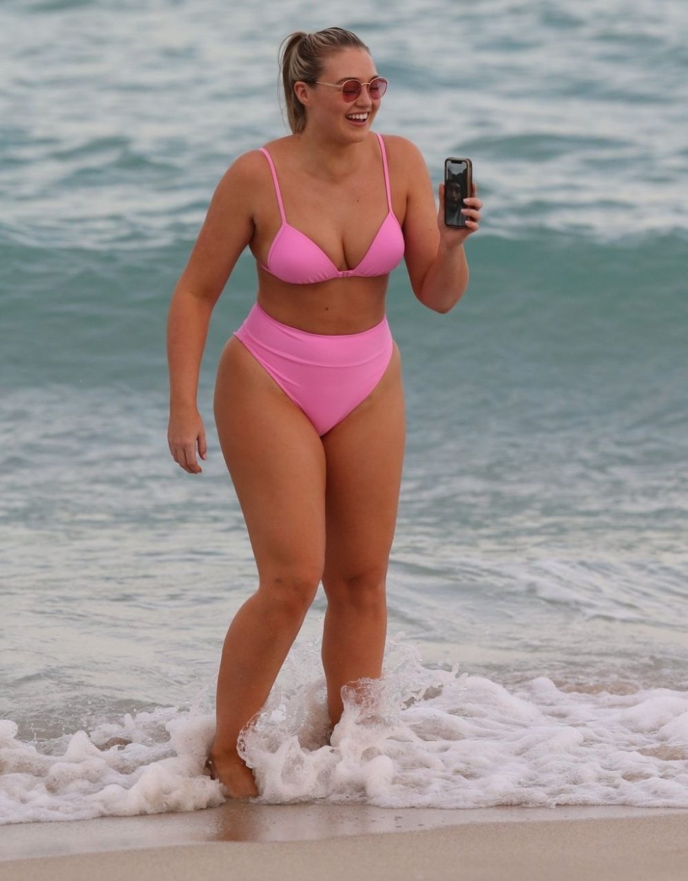 Le mannequin Iskra Lawrence met en valeur ses courbes à la plage dans un bikini rose à Miami, le 12/09/2018. Iskra est superbe alors qu’elle profite de sa journée à la plage.