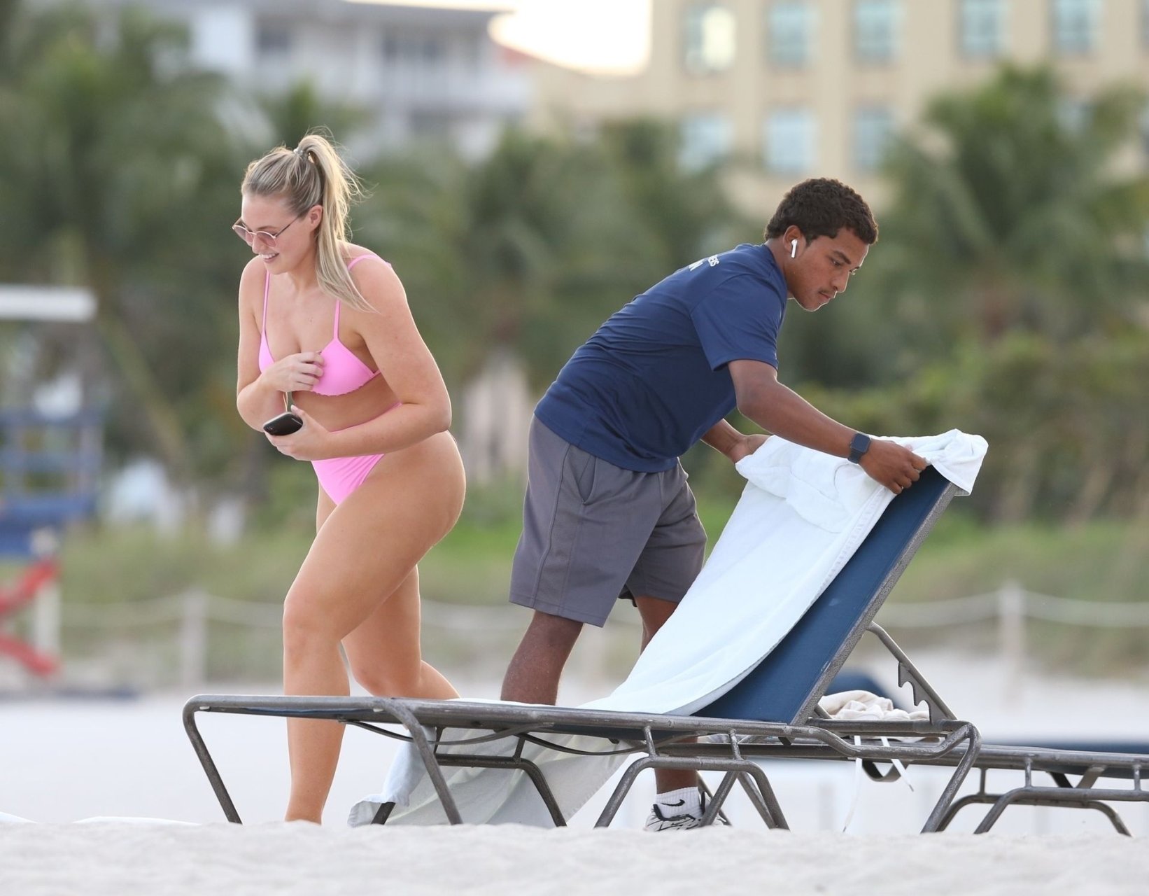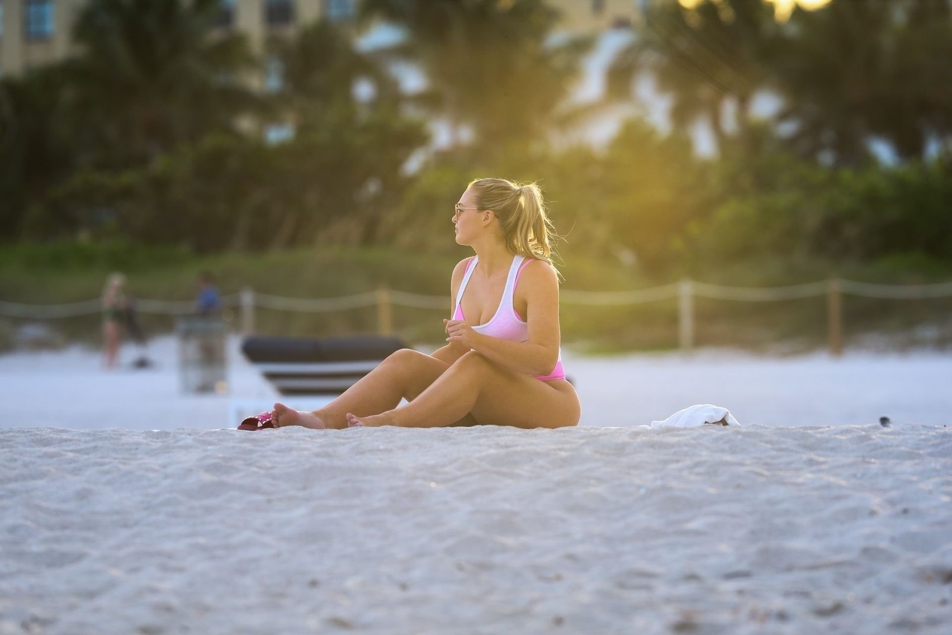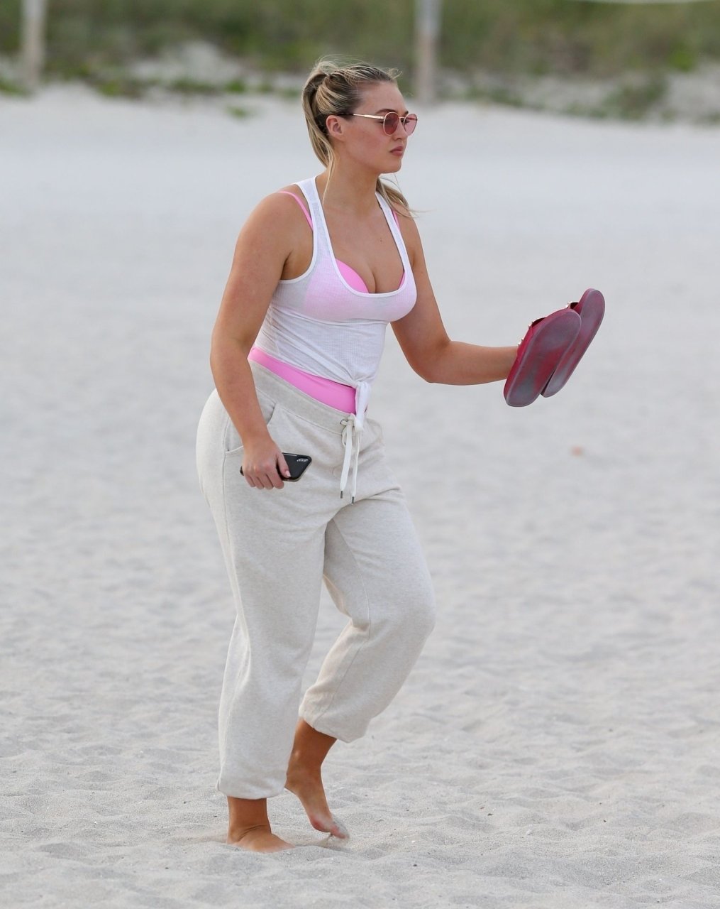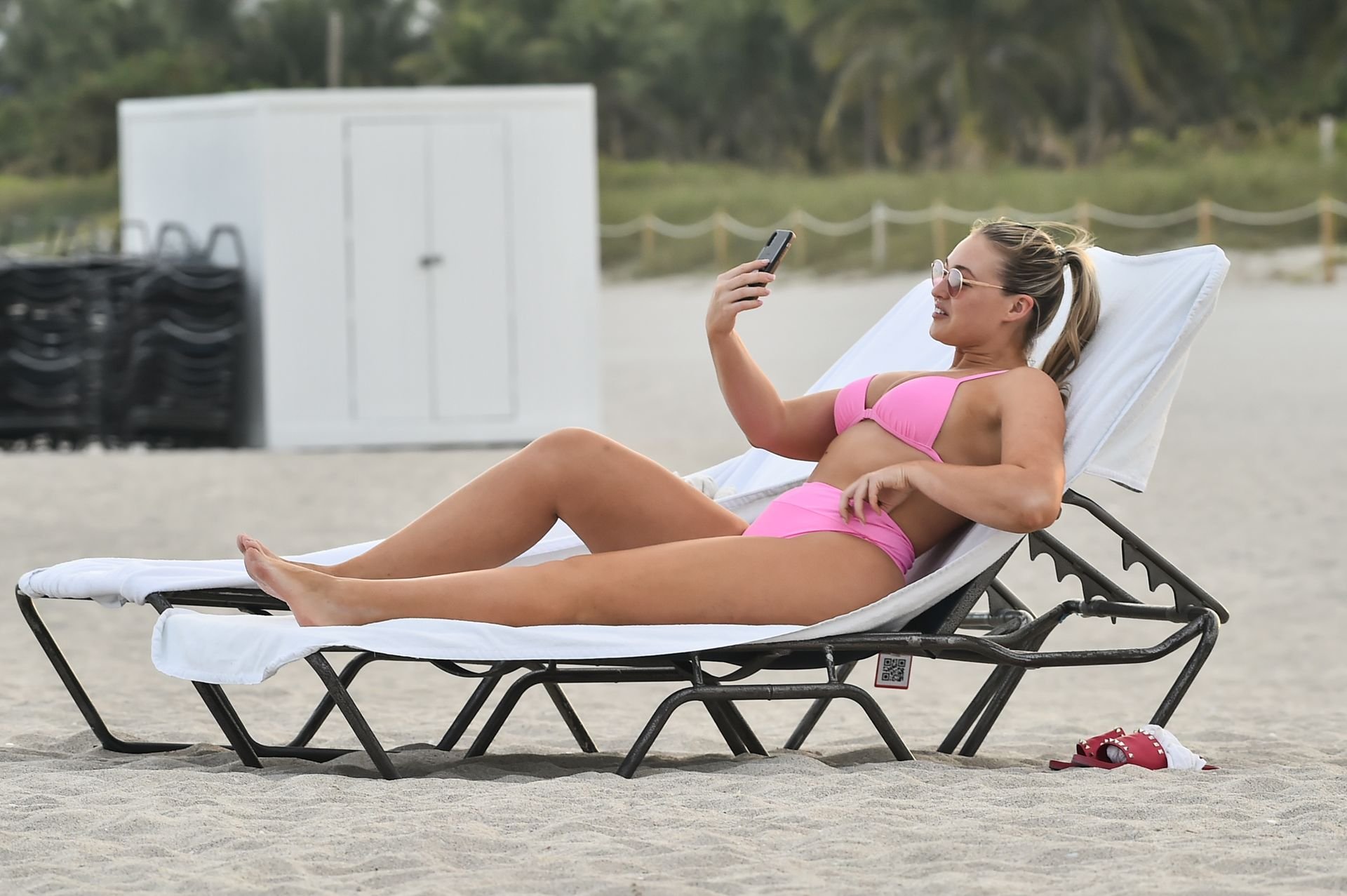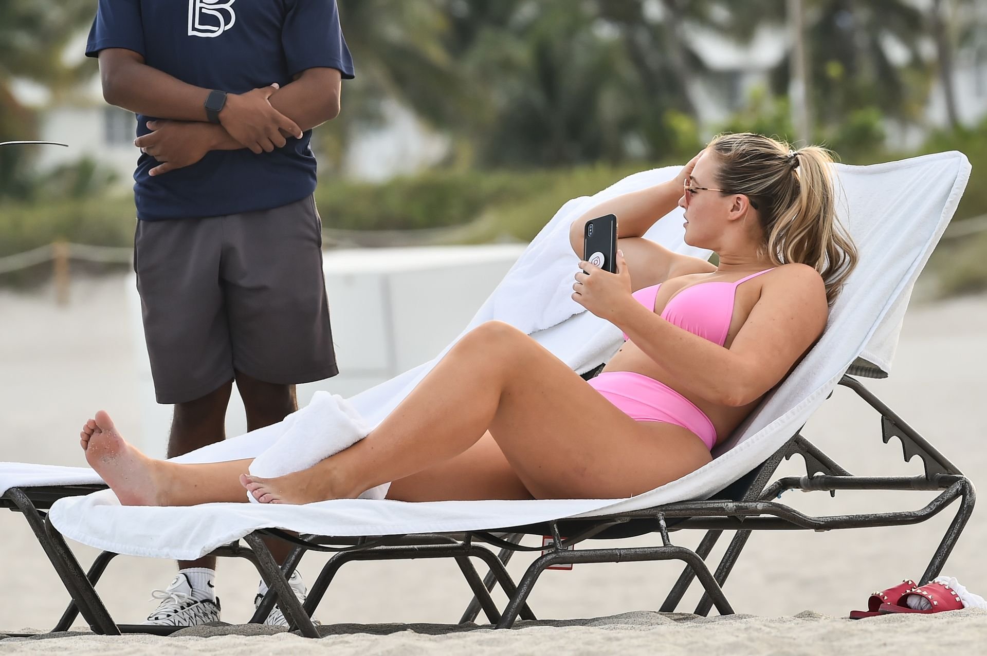 Le mannequin Iskra Lawrence met en valeur ses courbes à la plage dans un bikini rose à Miami, le 12/09/2018. Iskra est superbe alors qu’elle profite de sa journée à la plage.