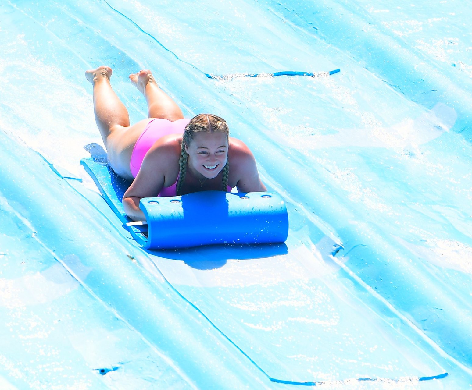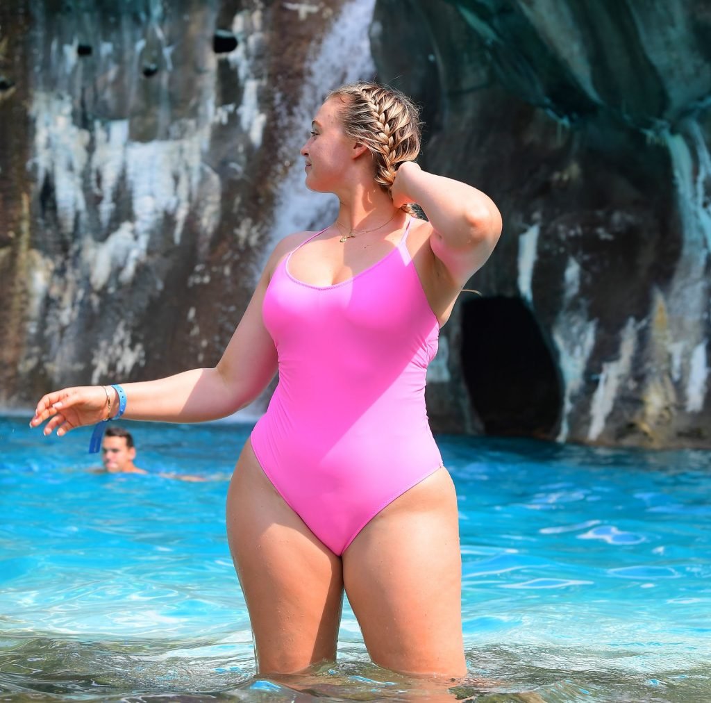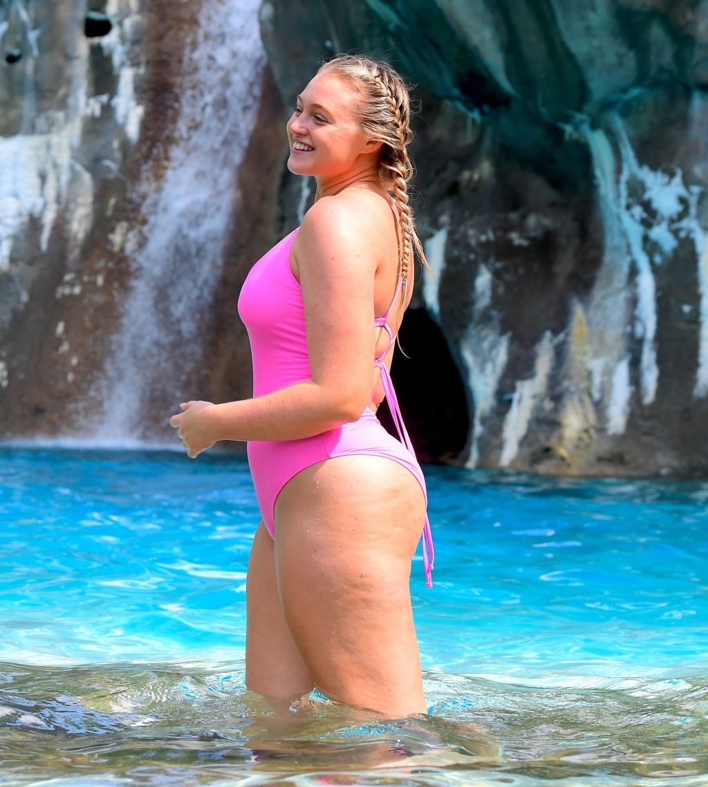 Elle a montré ses célèbres courbes tout en poursuivant son défi d’une semaine sans maquillage. Il semblait qu’elle s’amusait beaucoup à dévaler les toboggans avec ses amis, avant de plonger dans l’eau glacée.