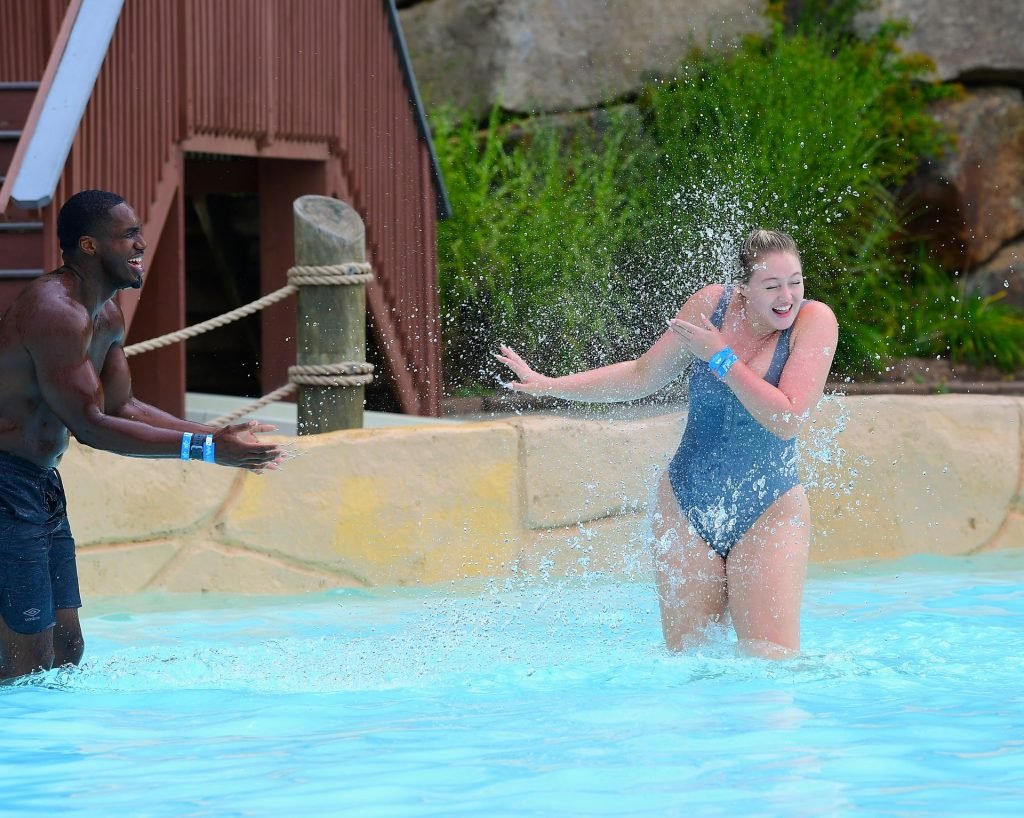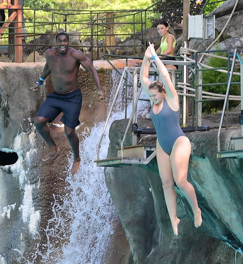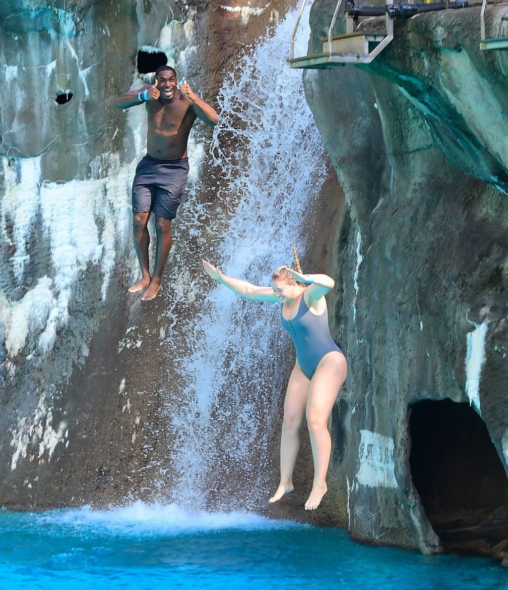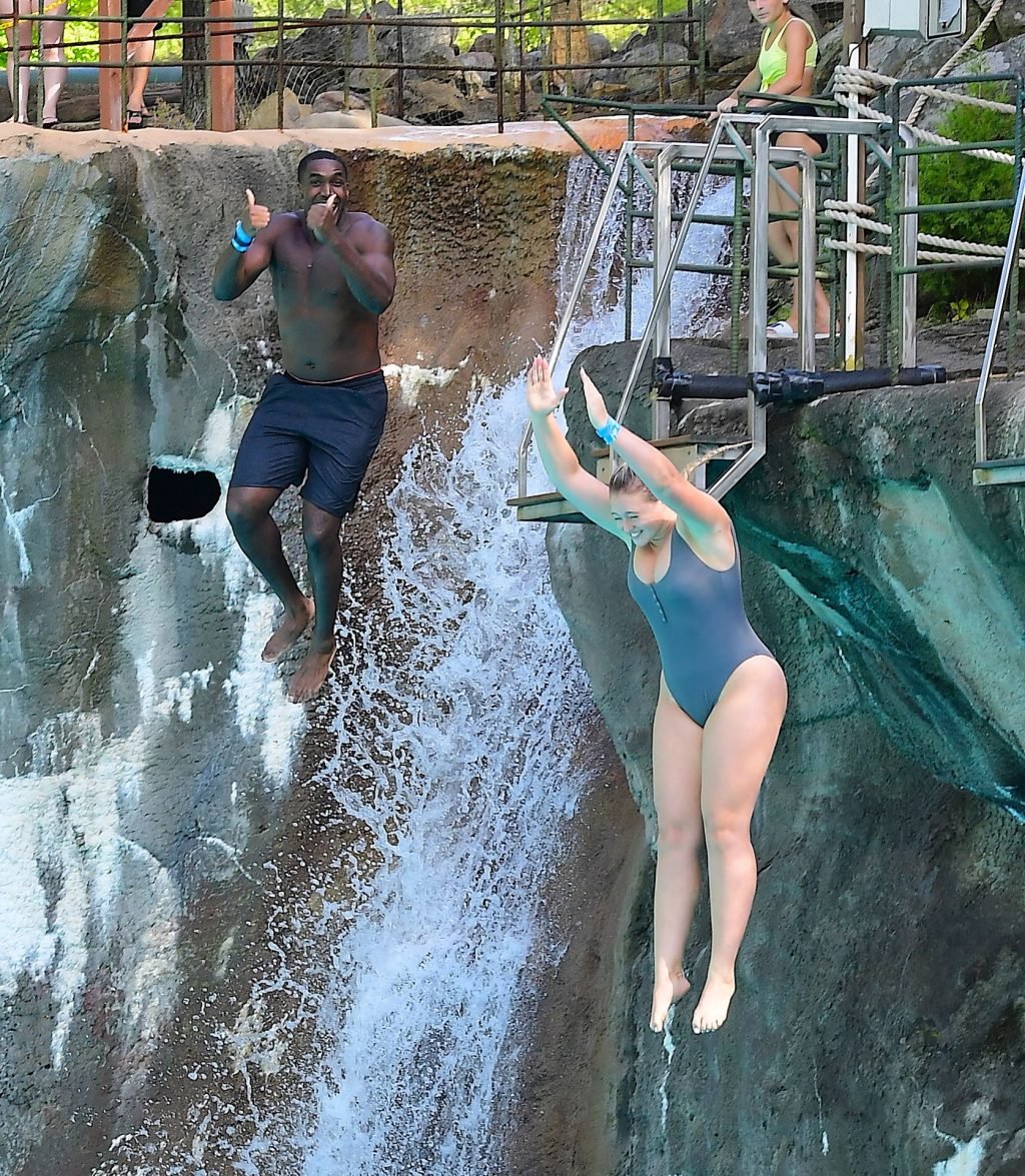 Le couple amoureux a partagé un baiser passionné en s’éclaboussant dans la piscine à vagues, avant de faire le saut de la foi depuis une falaise haute de 20 pieds. Ils ont tous deux crié d’excitation en sautant ensemble dans l’eau claire et bleue. Iskra semblait effrayée, mais Philip lui a assuré qu’elle serait en sécurité.
