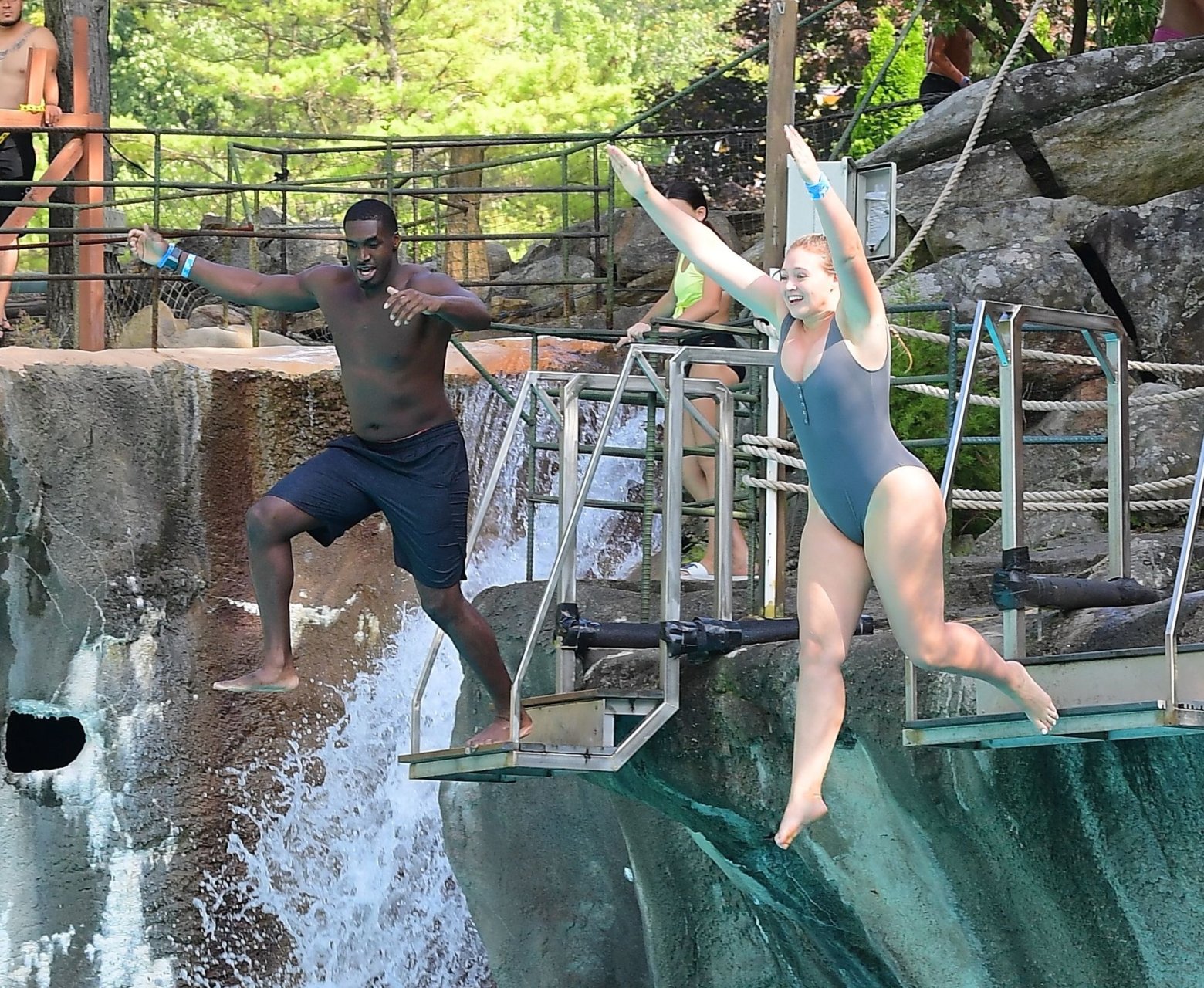 Le couple amoureux a partagé un baiser passionné en s’éclaboussant dans la piscine à vagues, avant de faire le saut de la foi depuis une falaise haute de 20 pieds. Ils ont tous deux crié d’excitation en sautant ensemble dans l’eau claire et bleue. Iskra semblait effrayée, mais Philip lui a assuré qu’elle serait en sécurité.