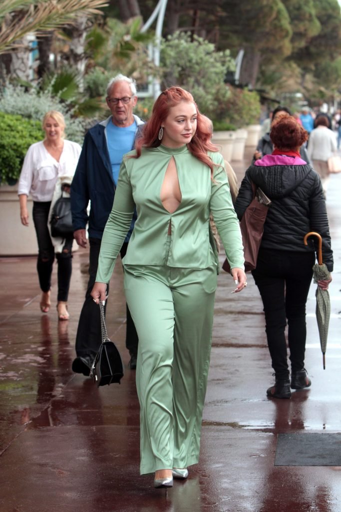 Iskra Lawrence est vue dans un costume vert lors d’une journée pluvieuse à la Croisette à Cannes, France, le 14/05/2018. L’actrice de 27 ans a légèrement exposé ses seins grâce à la découpe sur la veste verte.