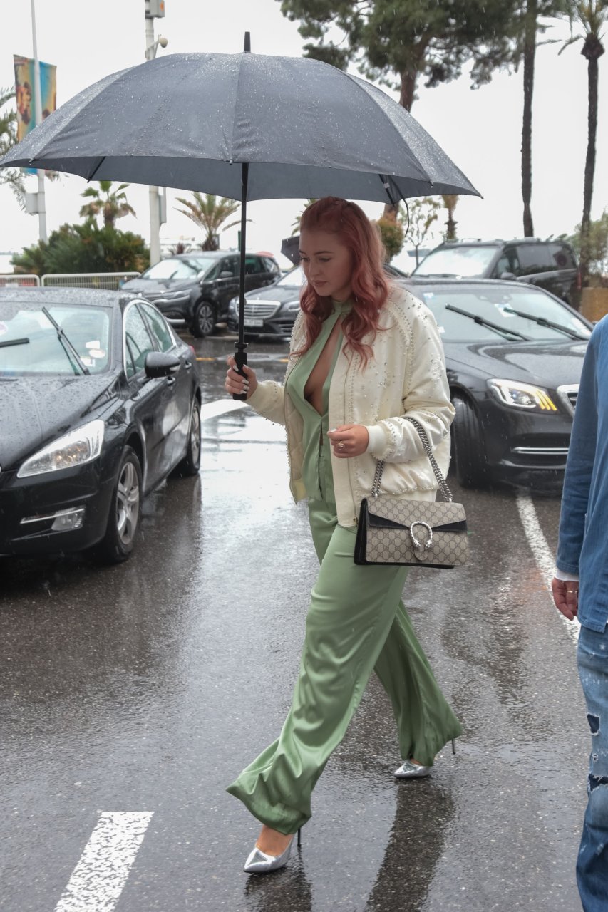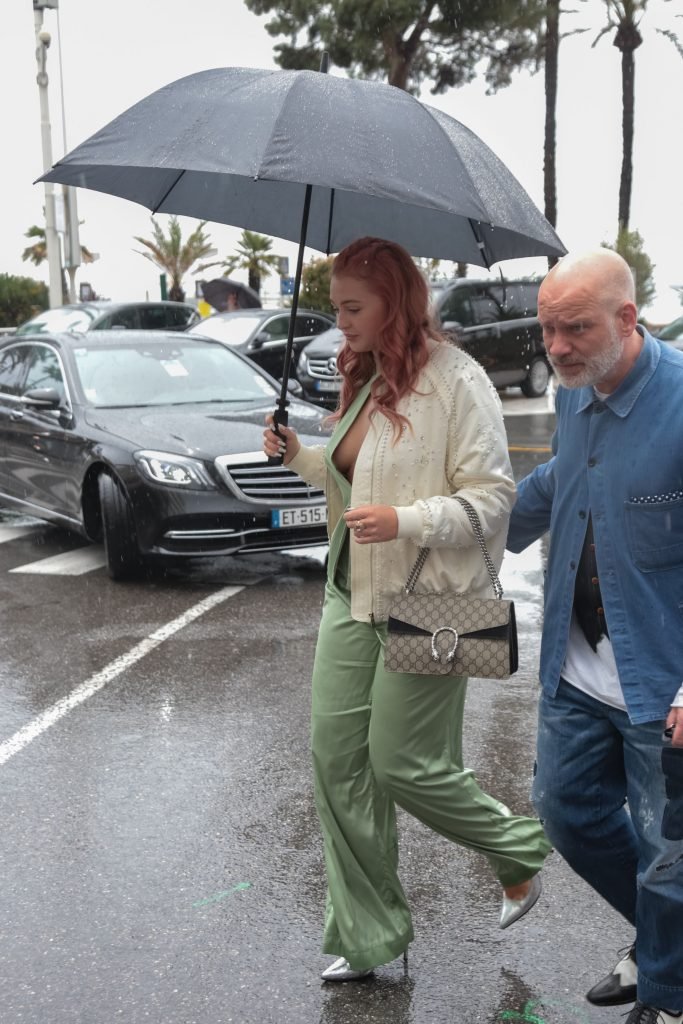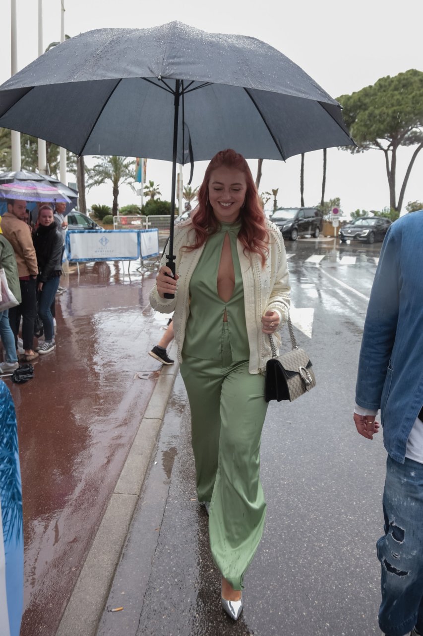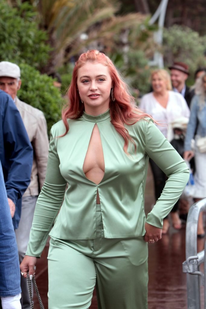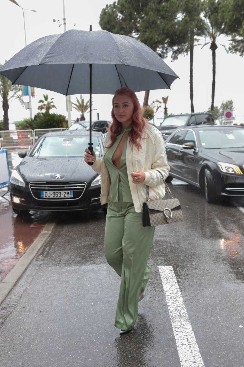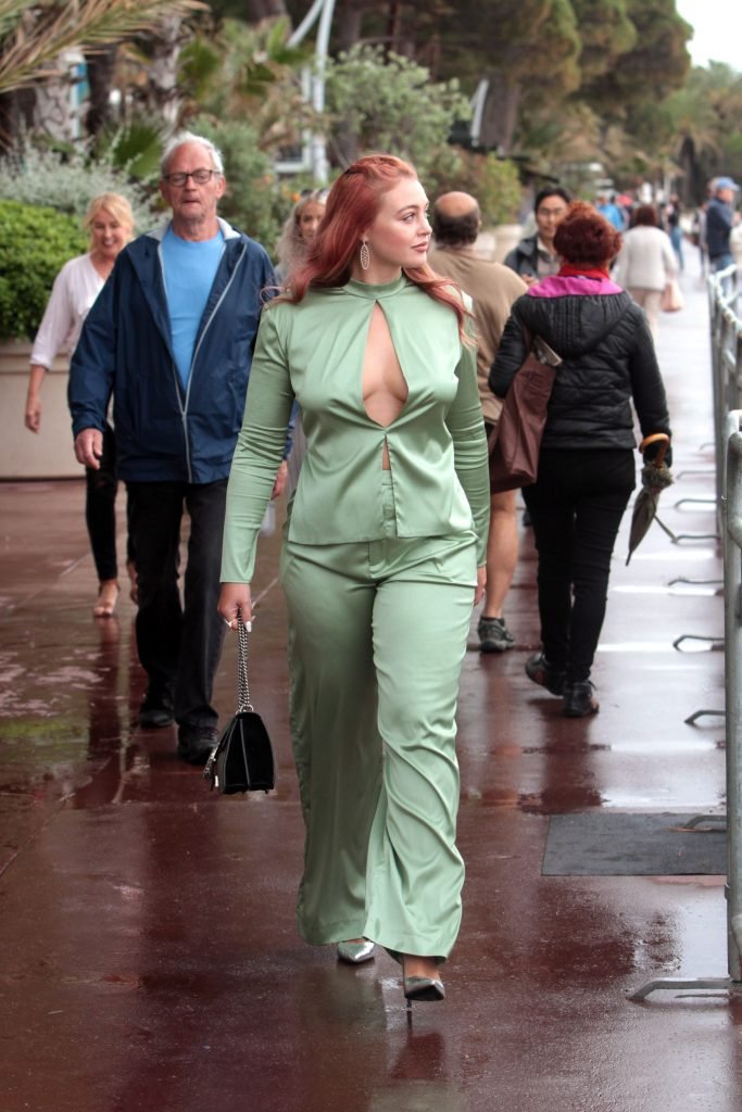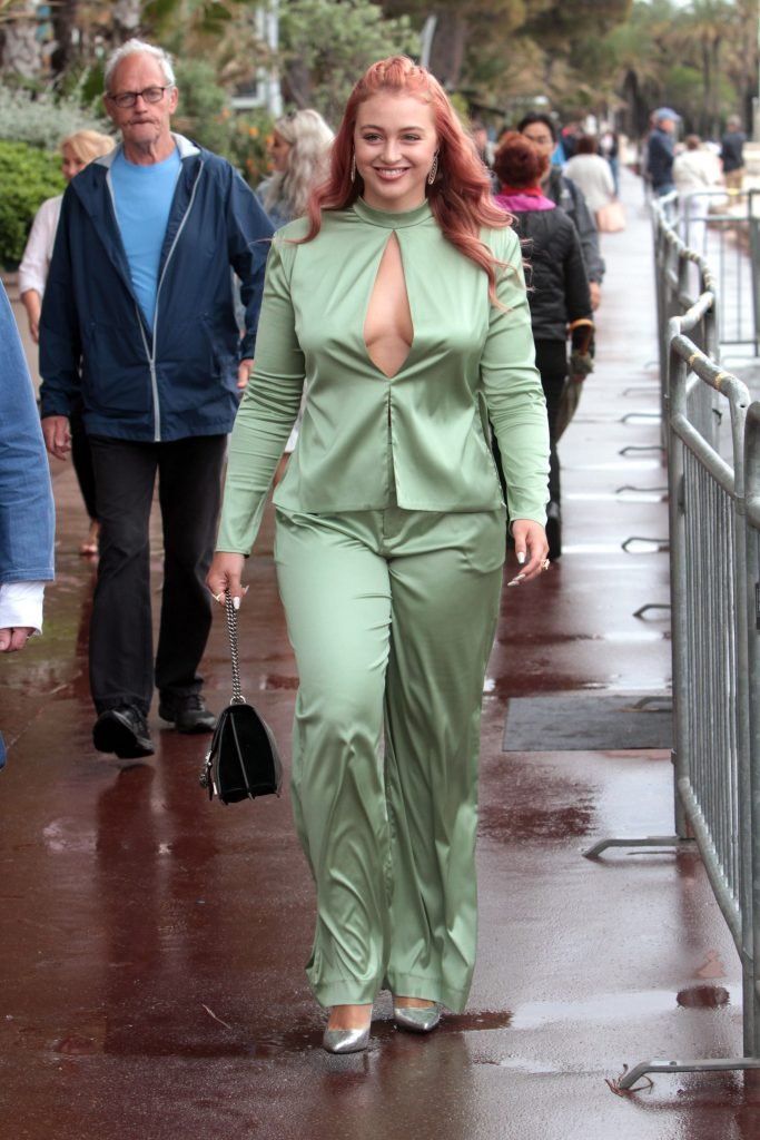Iskra Lawrence est vue dans un costume vert lors d’une journée pluvieuse à la Croisette à Cannes, France, le 14/05/2018. L’actrice de 27 ans a légèrement exposé ses seins grâce à la découpe sur la veste verte.