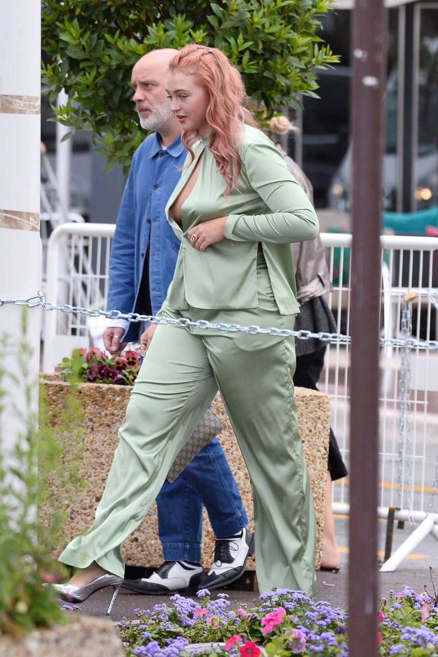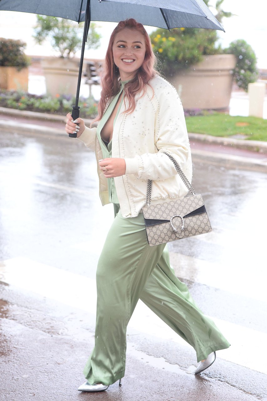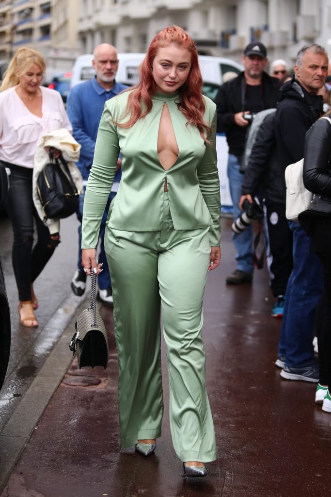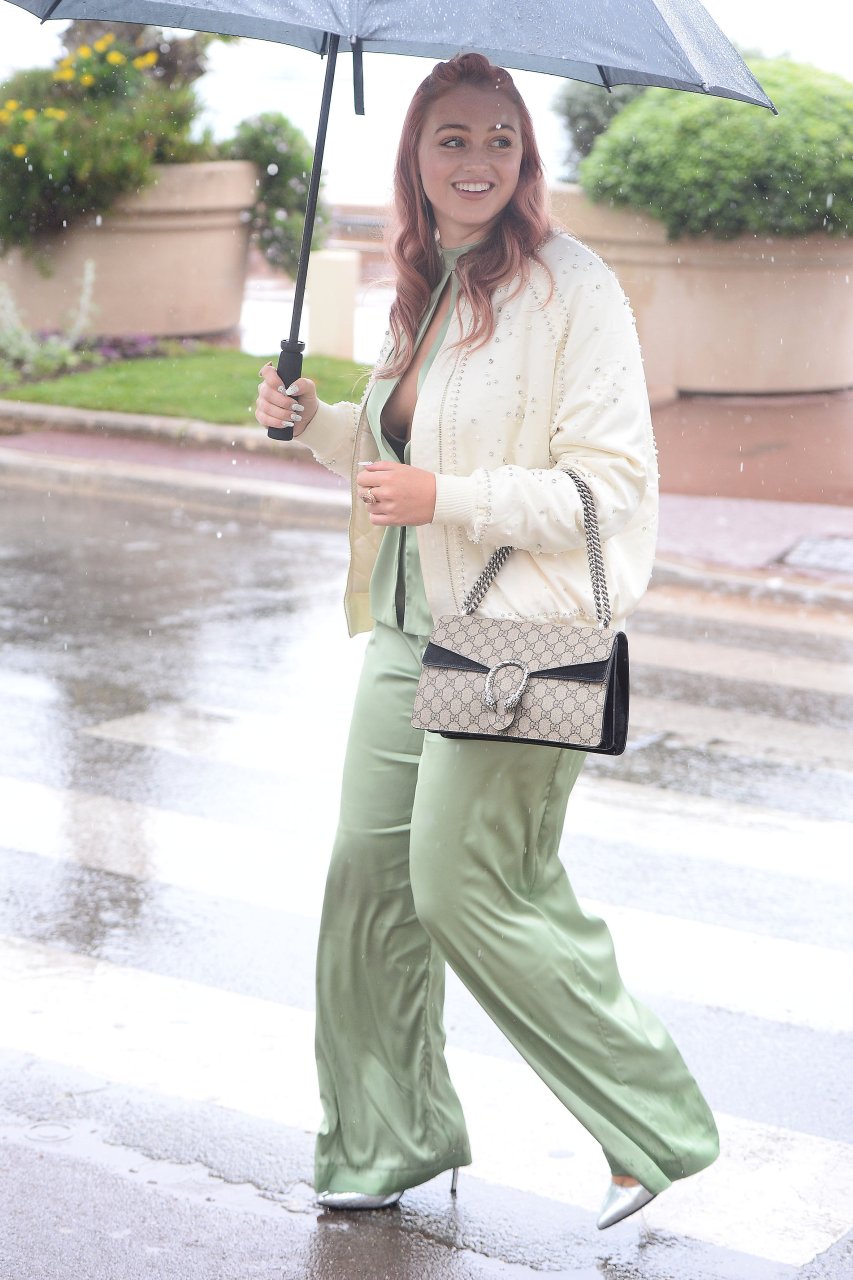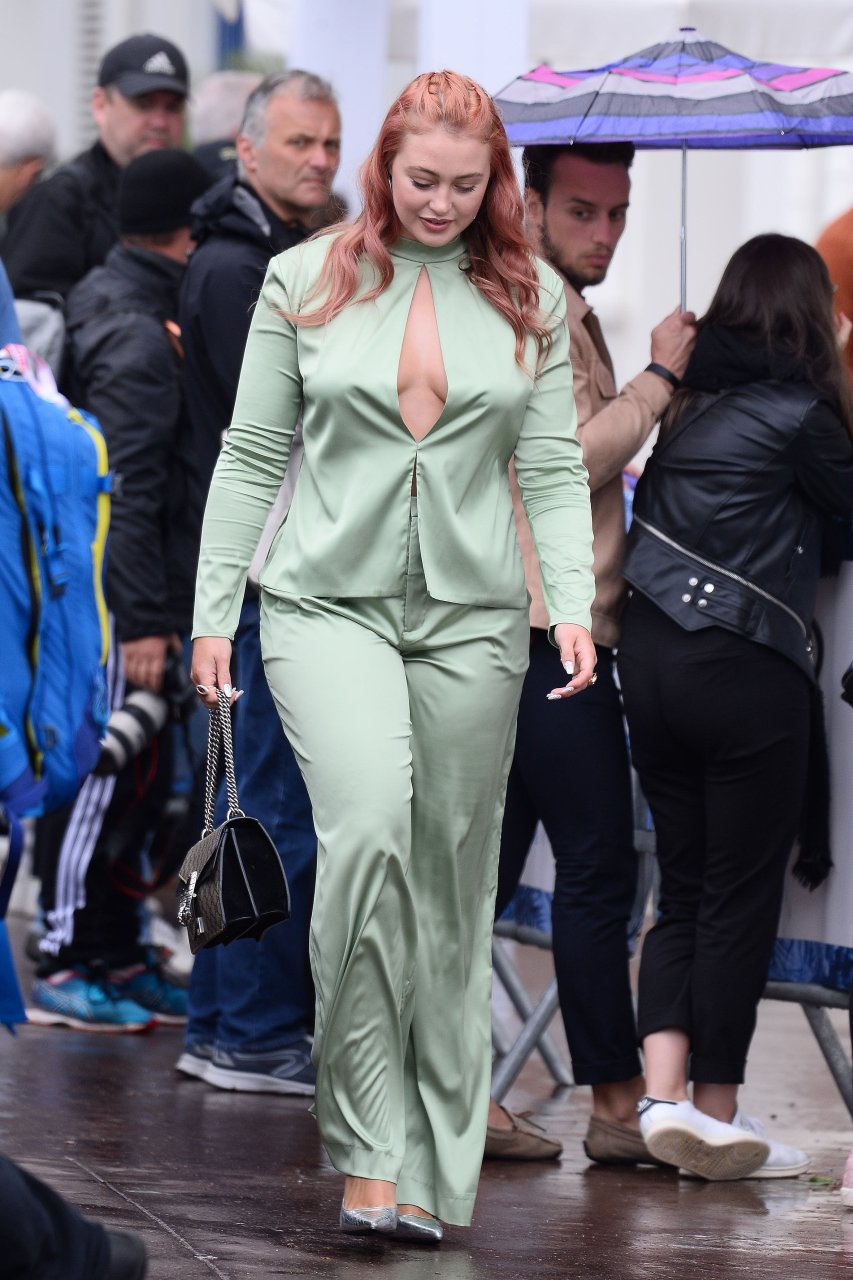 Iskra Lawrence est vue dans un costume vert lors d’une journée pluvieuse à la Croisette à Cannes, France, le 14/05/2018. L’actrice de 27 ans a légèrement exposé ses seins grâce à la découpe sur la veste verte.