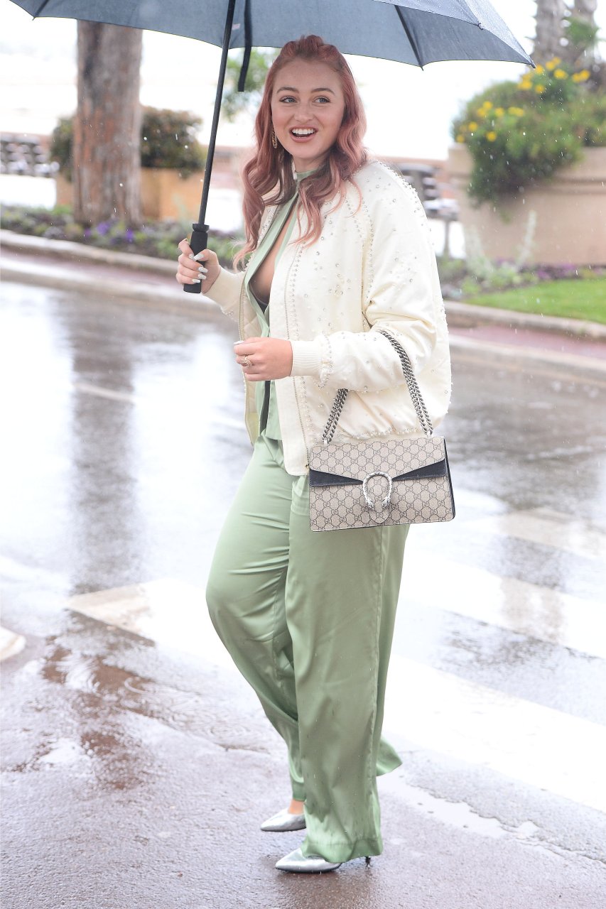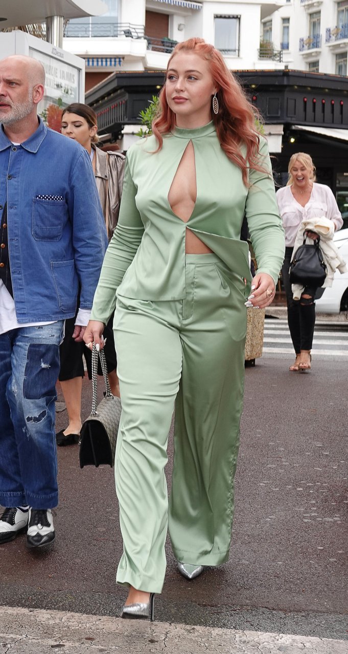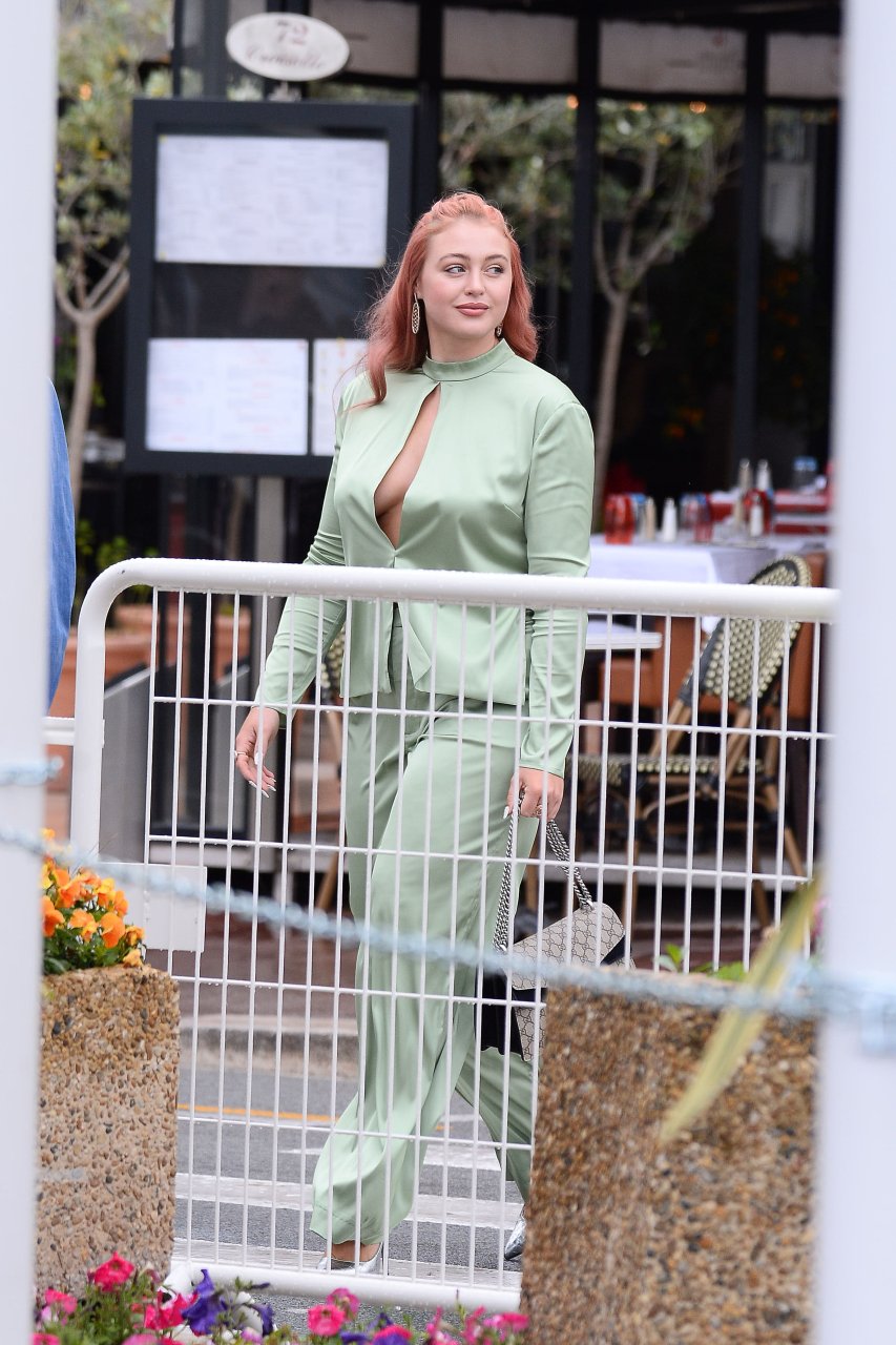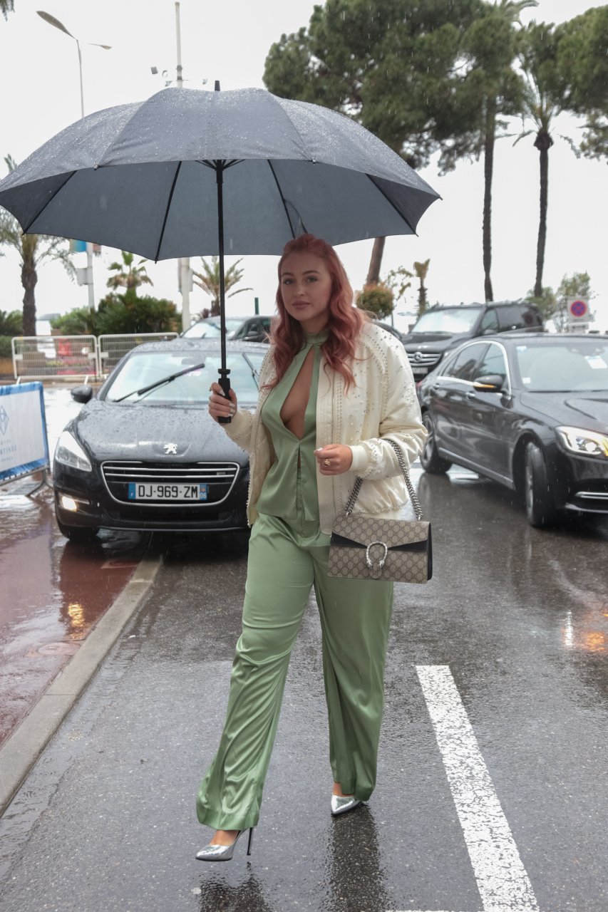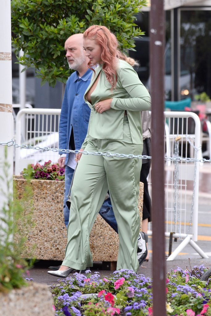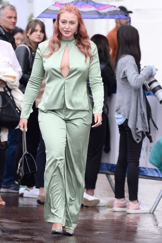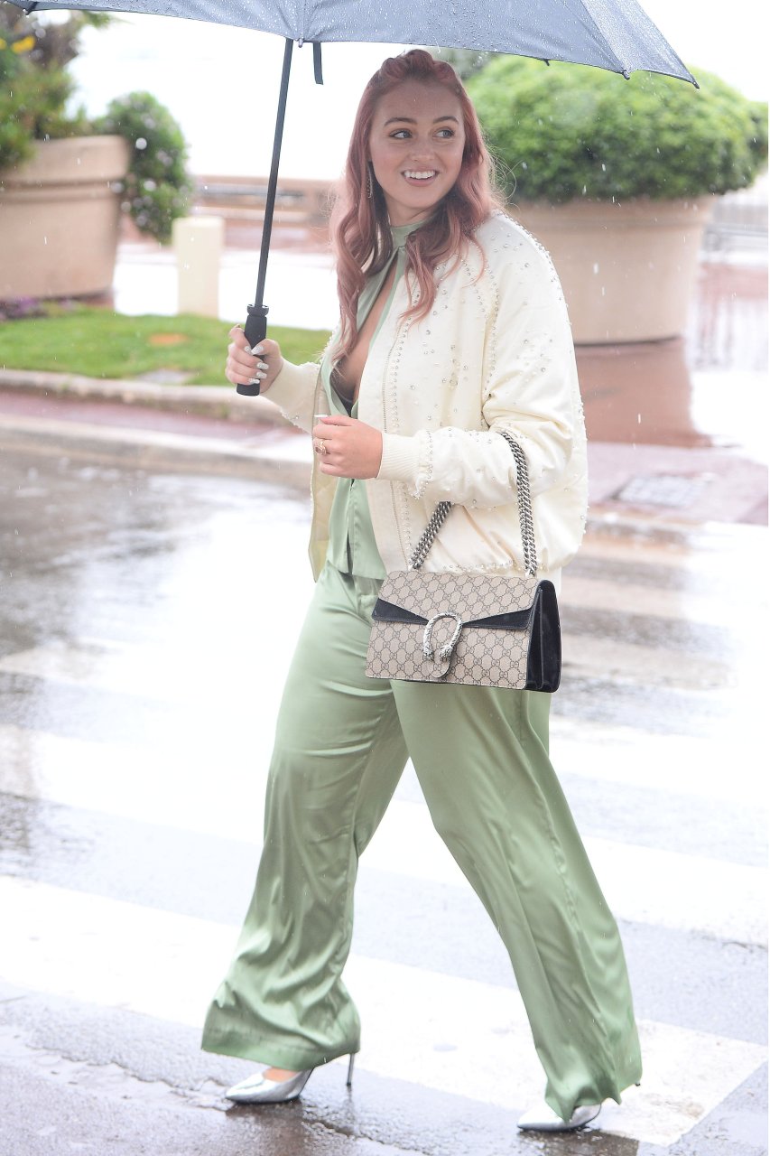 Iskra Lawrence est vue dans un costume vert lors d’une journée pluvieuse à la Croisette à Cannes, France, le 14/05/2018. L’actrice de 27 ans a légèrement exposé ses seins grâce à la découpe sur la veste verte.