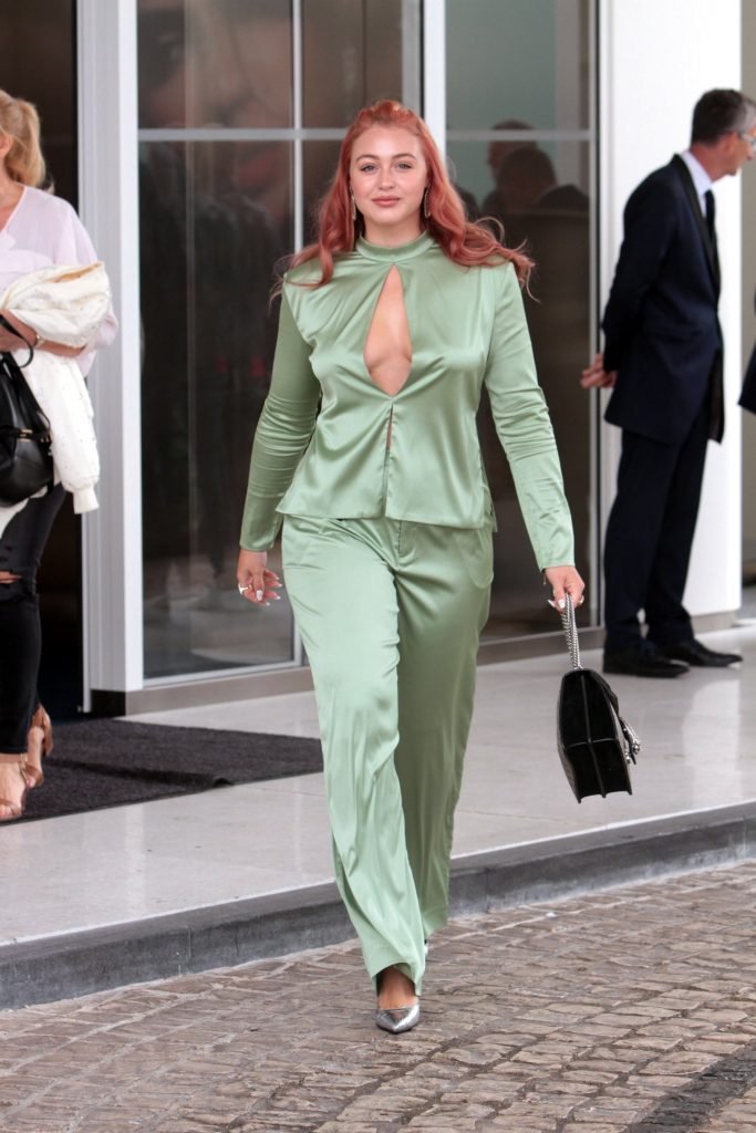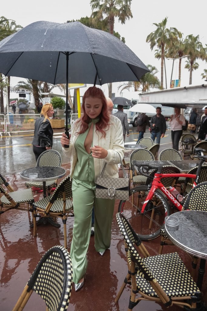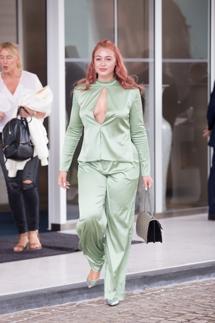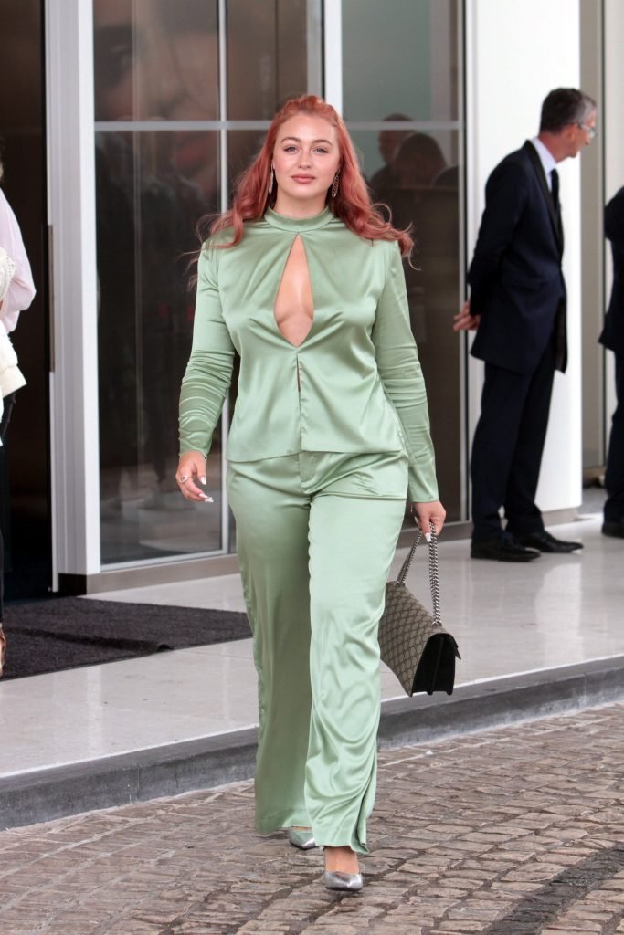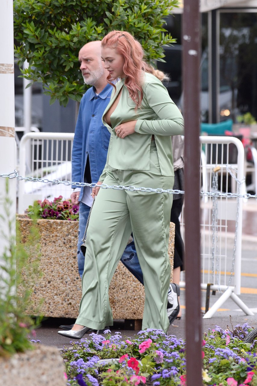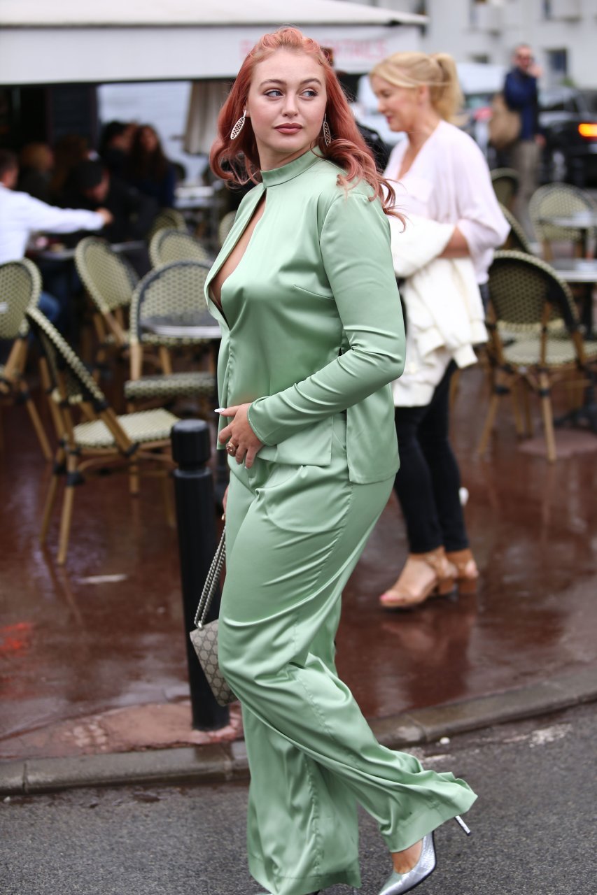 Iskra Lawrence est vue dans un costume vert lors d’une journée pluvieuse à la Croisette à Cannes, France, le 14/05/2018. L’actrice de 27 ans a légèrement exposé ses seins grâce à la découpe sur la veste verte.