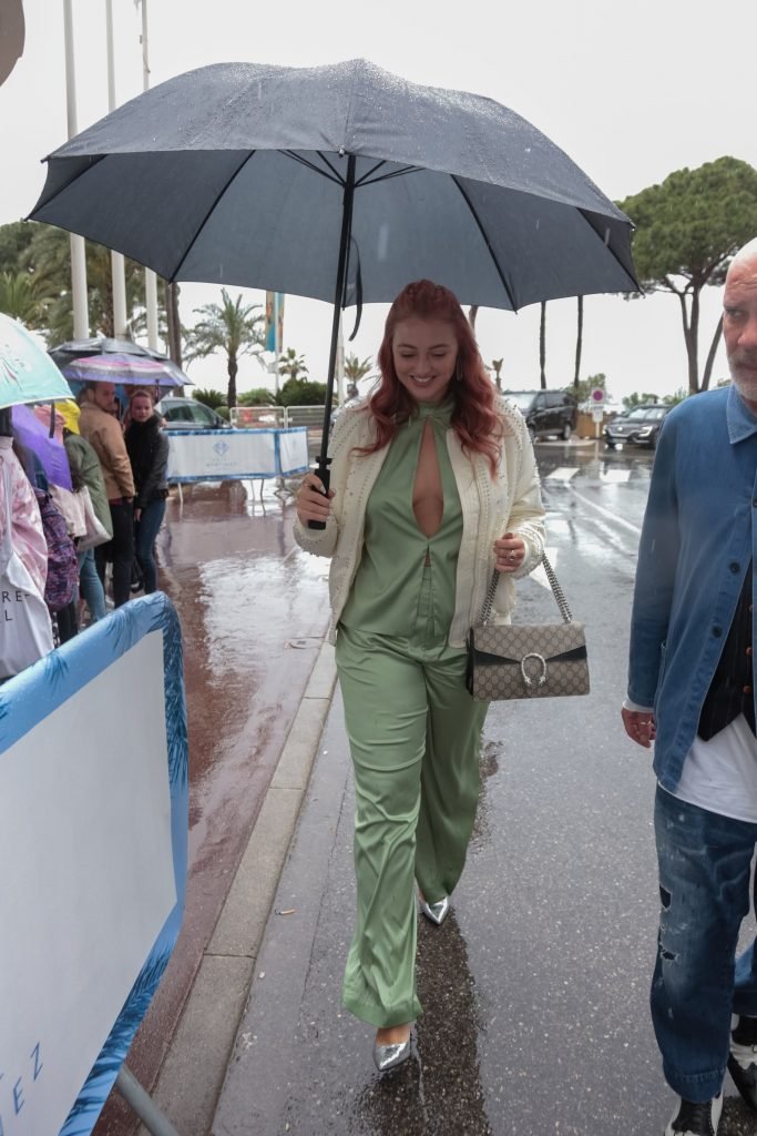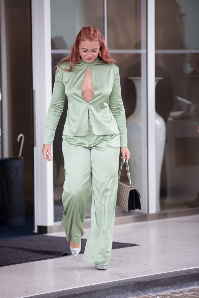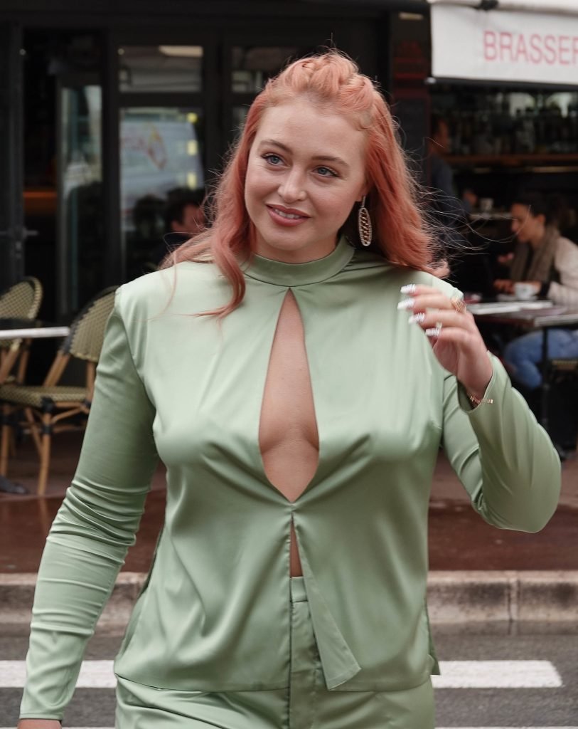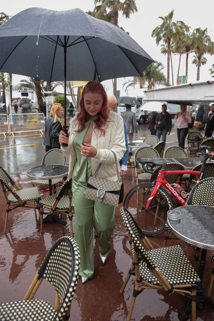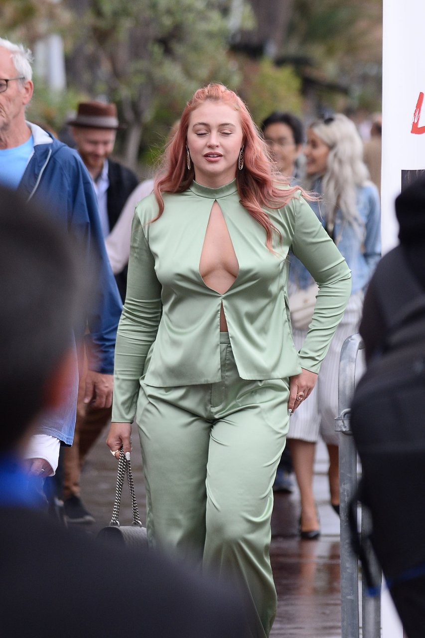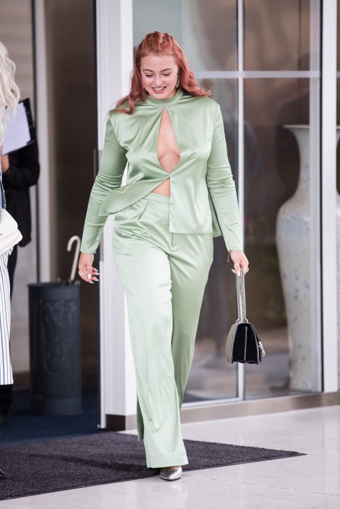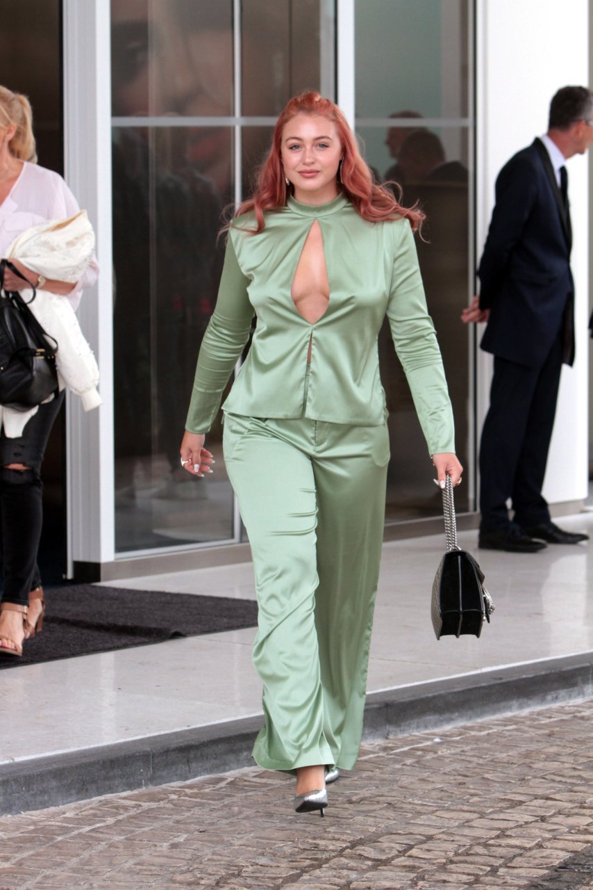 Iskra Lawrence est vue dans un costume vert lors d’une journée pluvieuse à la Croisette à Cannes, France, le 14/05/2018. L’actrice de 27 ans a légèrement exposé ses seins grâce à la découpe sur la veste verte.