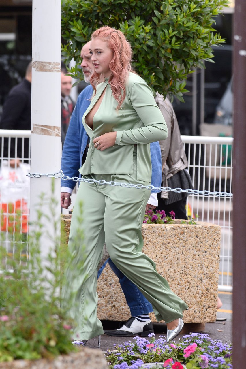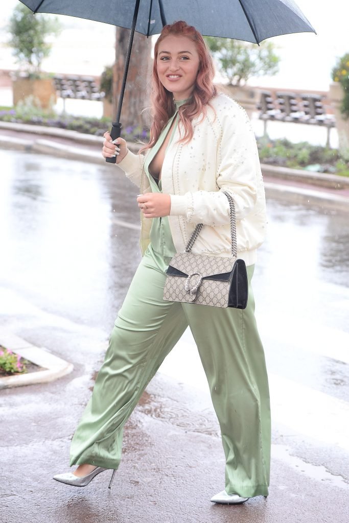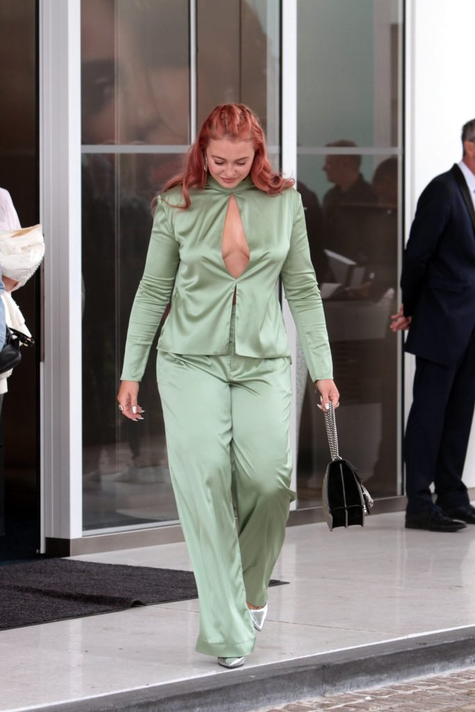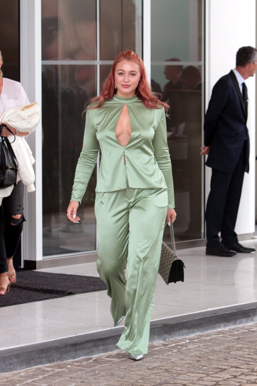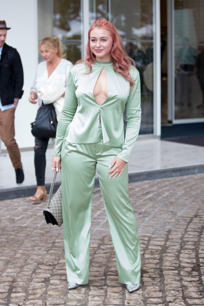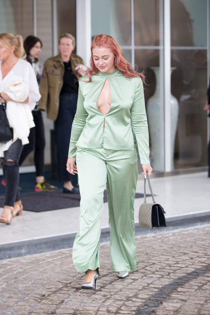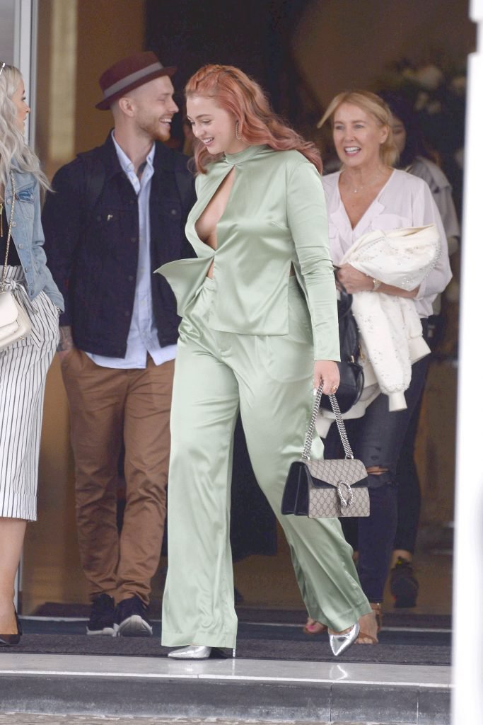 Iskra Lawrence est vue dans un costume vert lors d’une journée pluvieuse à la Croisette à Cannes, France, le 14/05/2018. L’actrice de 27 ans a légèrement exposé ses seins grâce à la découpe sur la veste verte.
