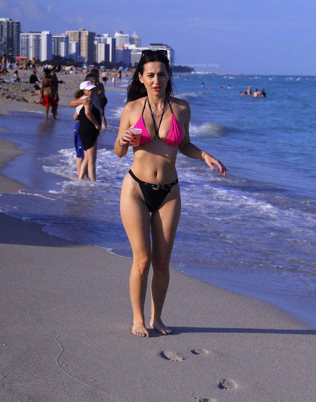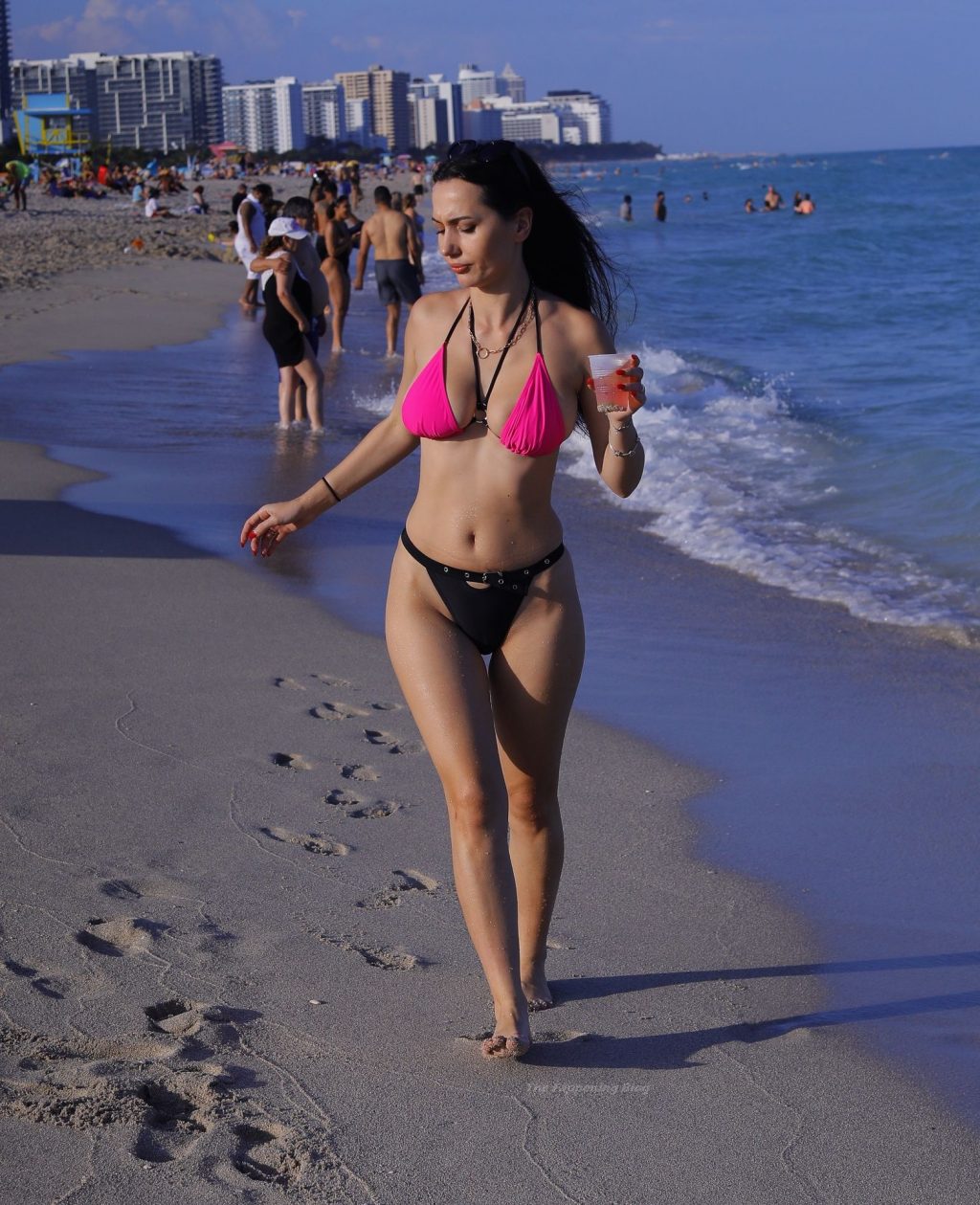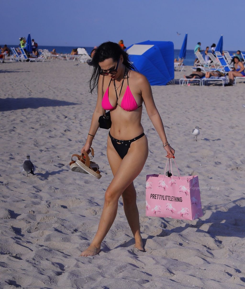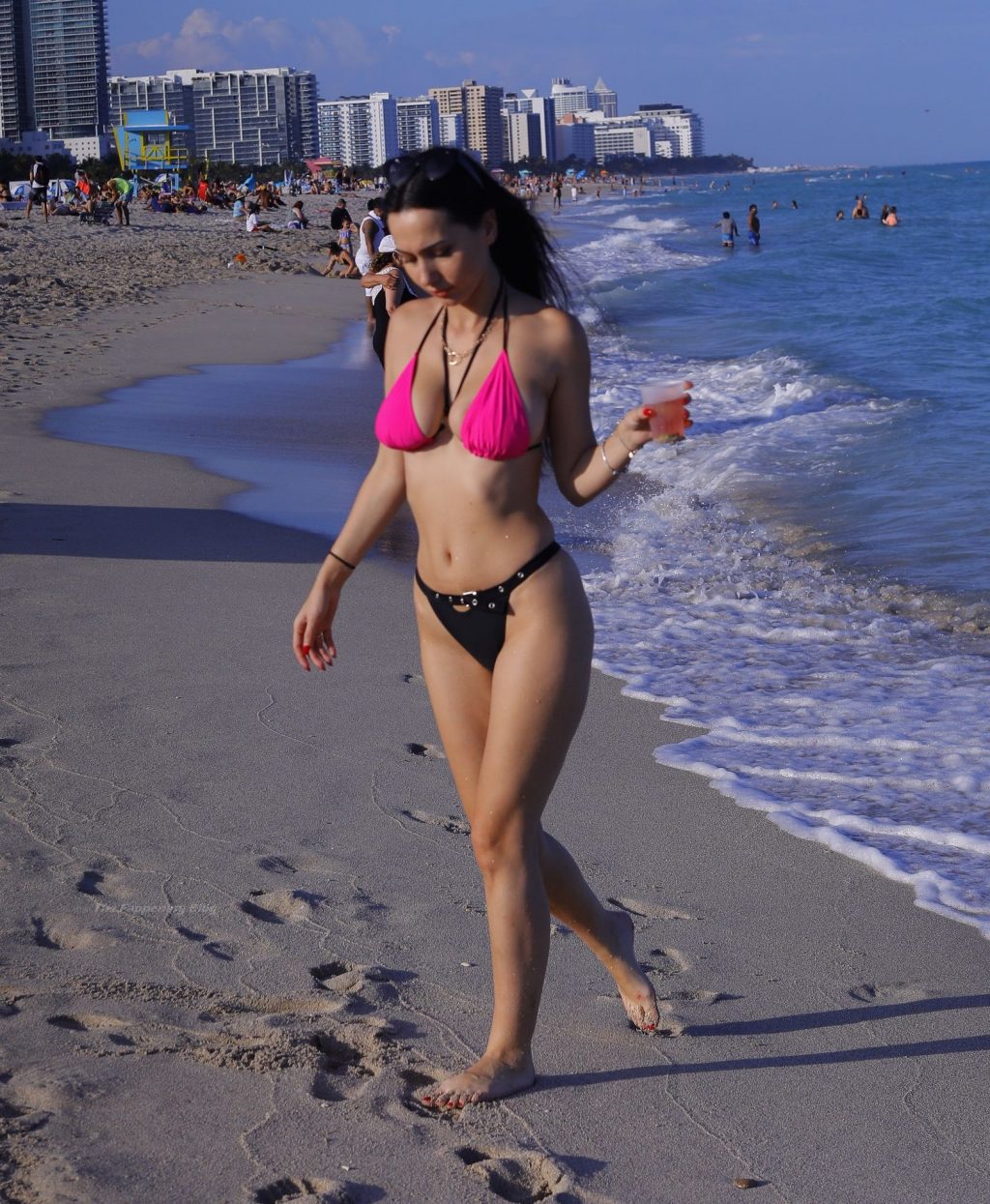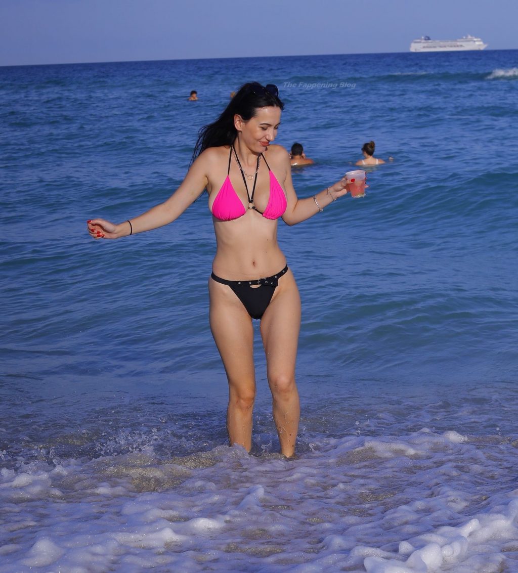 Le mannequin européen Iva Kovacevic déborde presque de son petit bikini rose/noir alors qu’elle sirote une boisson pendant que les vacances de printemps envahissent Miami, 05/03/2021. Le mannequin affichait un large sourire en se baignant près de son hôtel à South Beach.