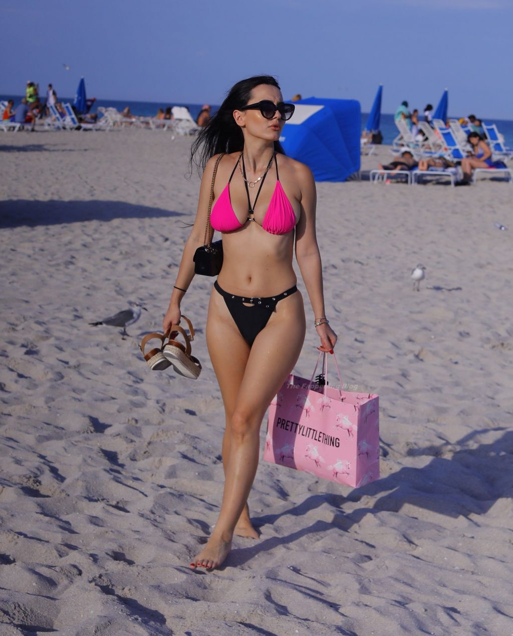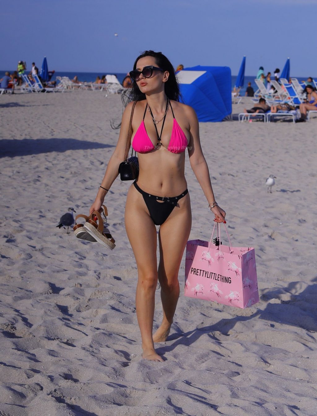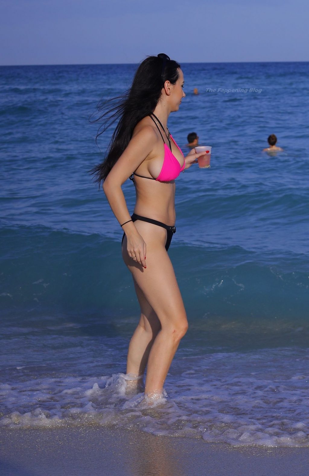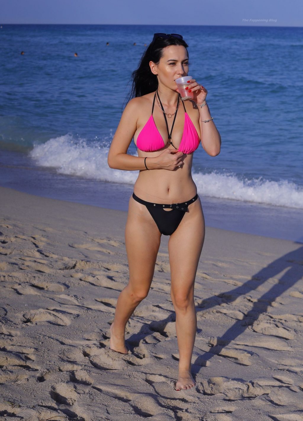 Le mannequin européen Iva Kovacevic déborde presque de son petit bikini rose/noir alors qu’elle sirote une boisson pendant que les vacances de printemps envahissent Miami, 05/03/2021. Le mannequin affichait un large sourire en se baignant près de son hôtel à South Beach.