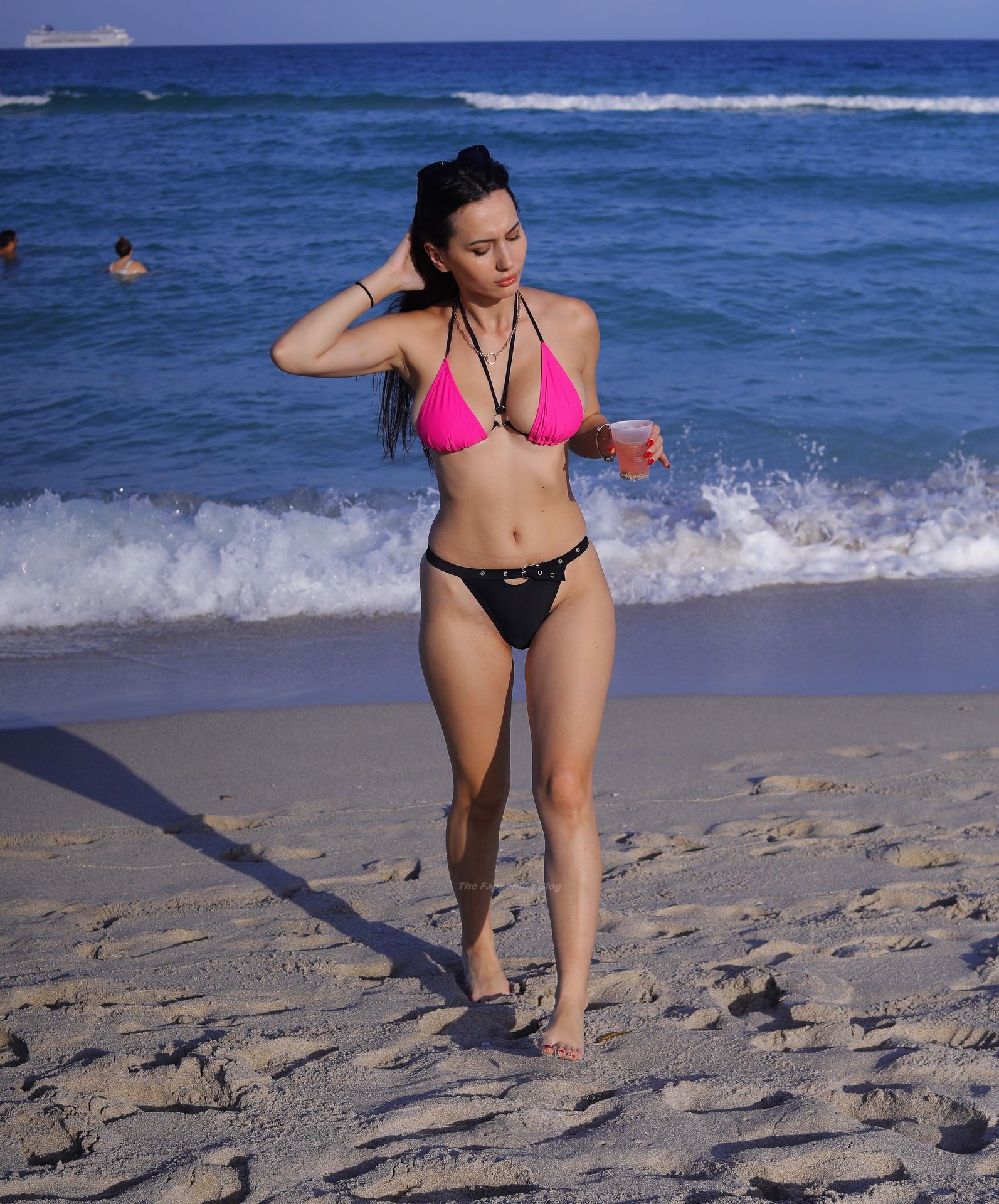 Le mannequin européen Iva Kovacevic déborde presque de son petit bikini rose/noir alors qu’elle sirote une boisson pendant que les vacances de printemps envahissent Miami, 05/03/2021. Le mannequin affichait un large sourire en se baignant près de son hôtel à South Beach.