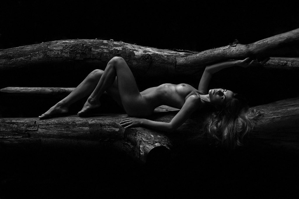 Isabella est allongée sur une bûche. Non, il ne s’agit pas de vin ou de raisin. Mais la fille a mûri. Photographie par Marta Zbieroń (2017). Izabella Wasiniewska est un mannequin polonais, danseuse, Playmate de Playboy.