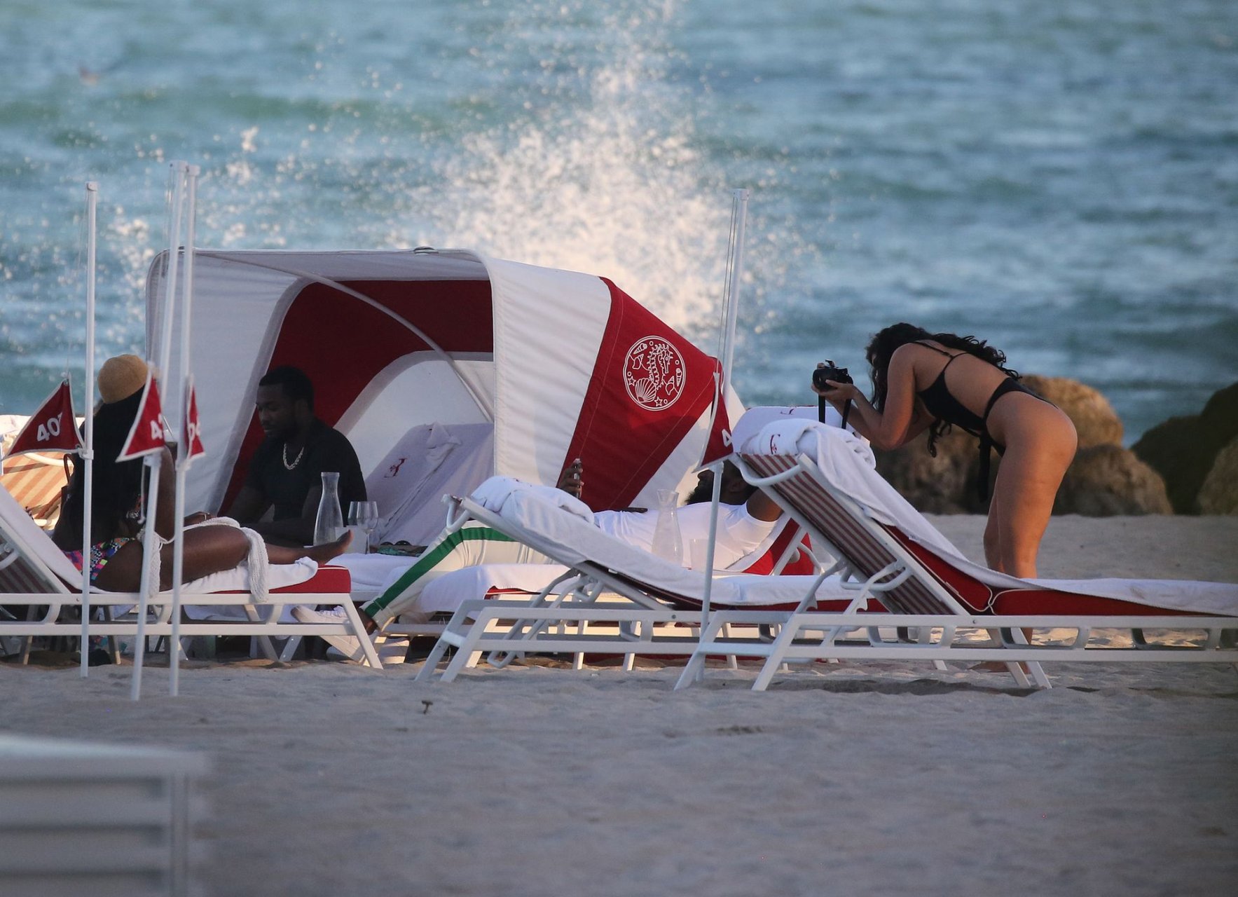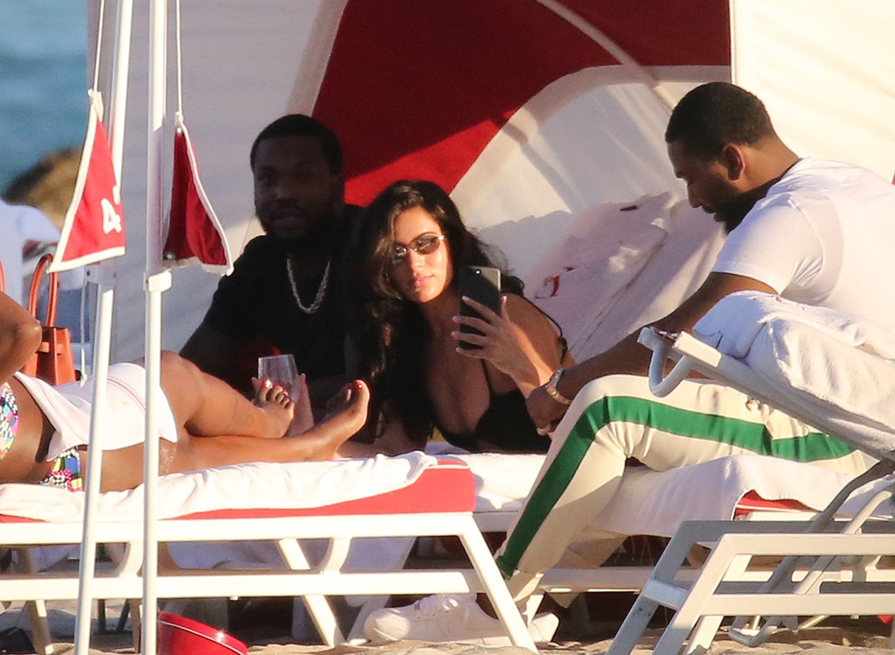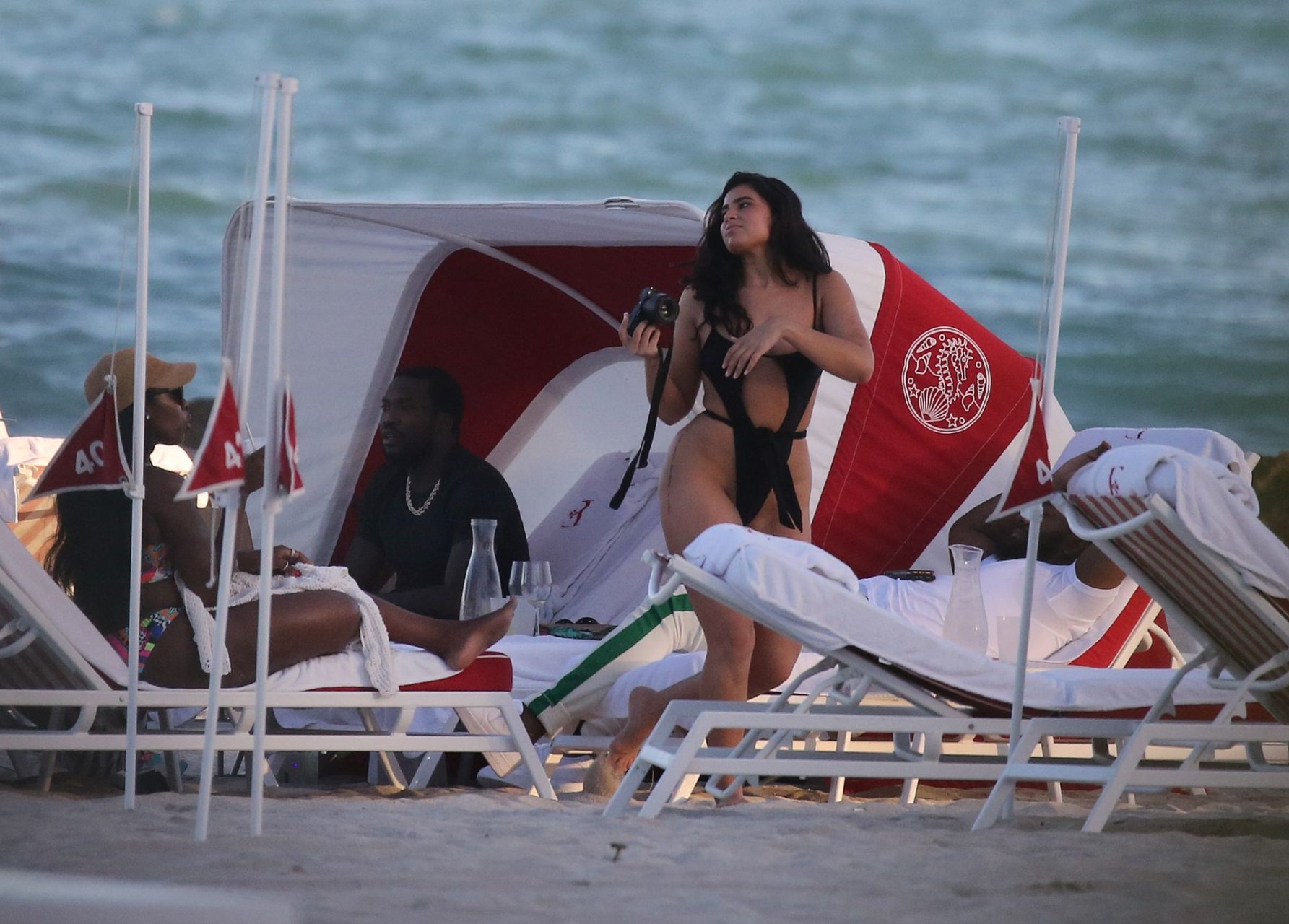 Le rappeur Meek Mill se détend sur la plage avec la mannequin pulpeuse de 24 ans en bikini Janice et des amis sur la plage de Miami, le 20/02/2019.